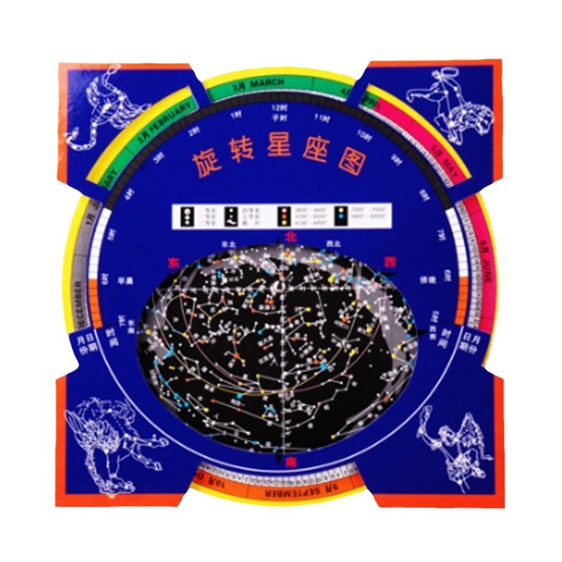 首先把星图上的日期及时间对准,例如观察时间是1月1日晚上10时,把小圆盘的晚上10时的刻度与大圆盘的1月1日的刻度重迭,在旋转星图上就会出现当时的星空了。