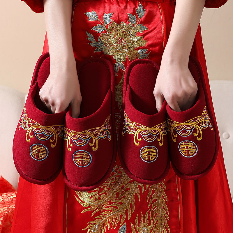 Свадебные тапочки праздничные красные осень и зима пара новобрачных