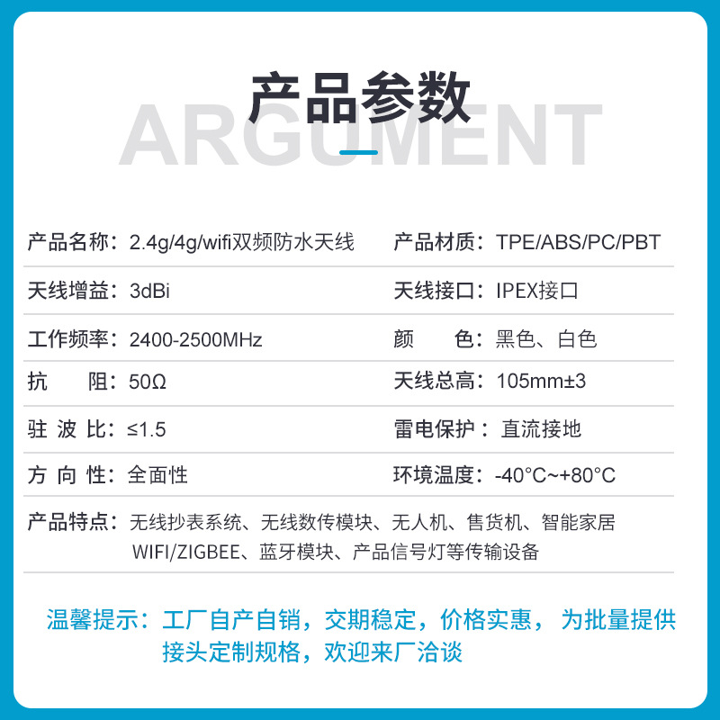 产品参数:3DB胶棒天线,适合如各种无线路由器,无线网卡等2.4G无线设备
