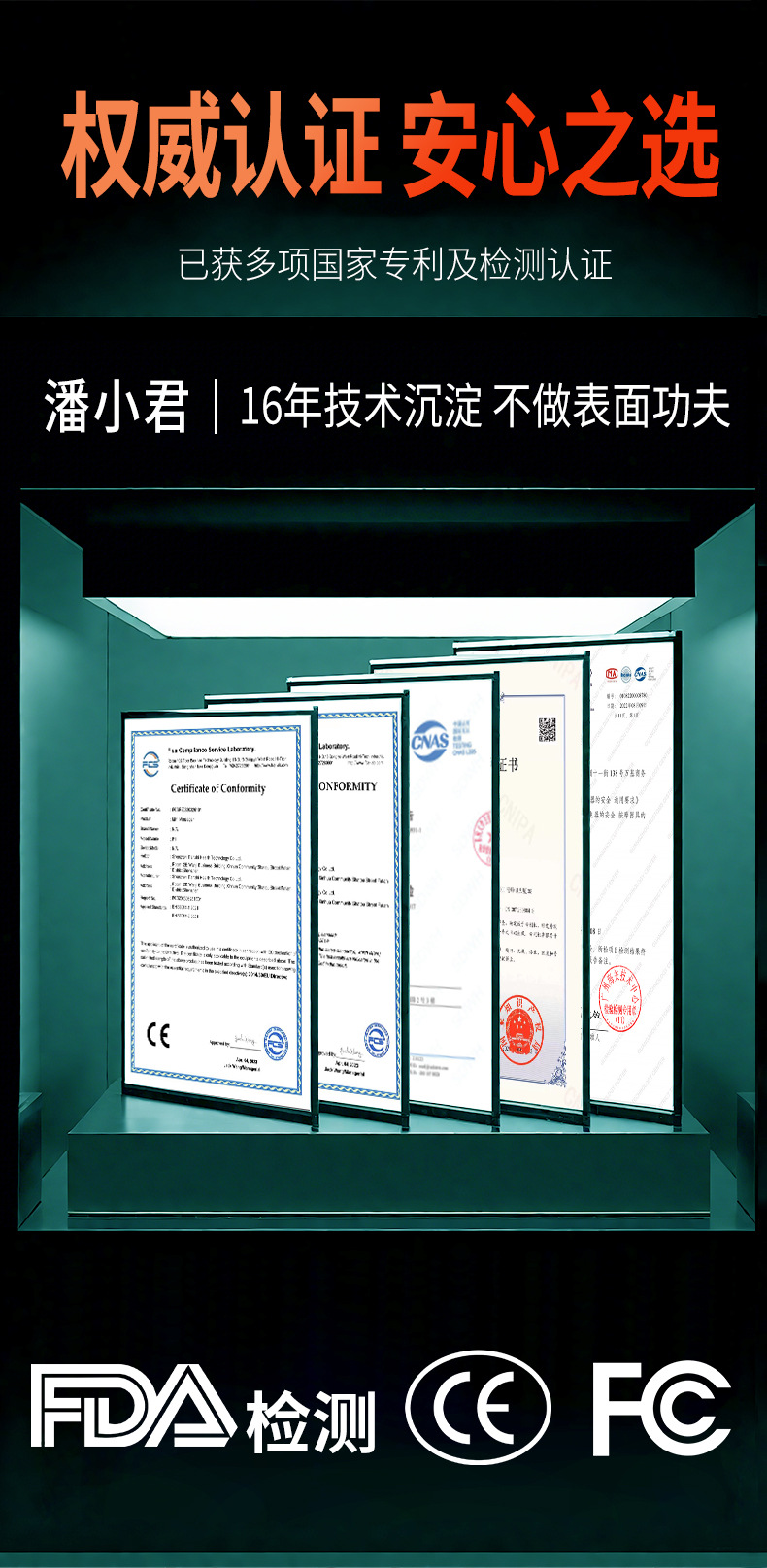产品证书:CE、FCC、外观专利,质检报告