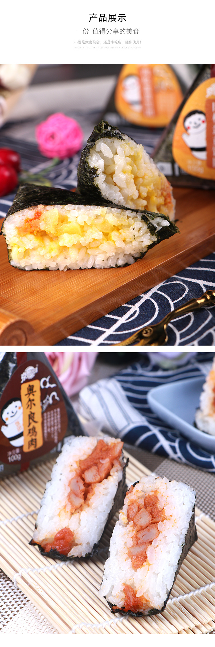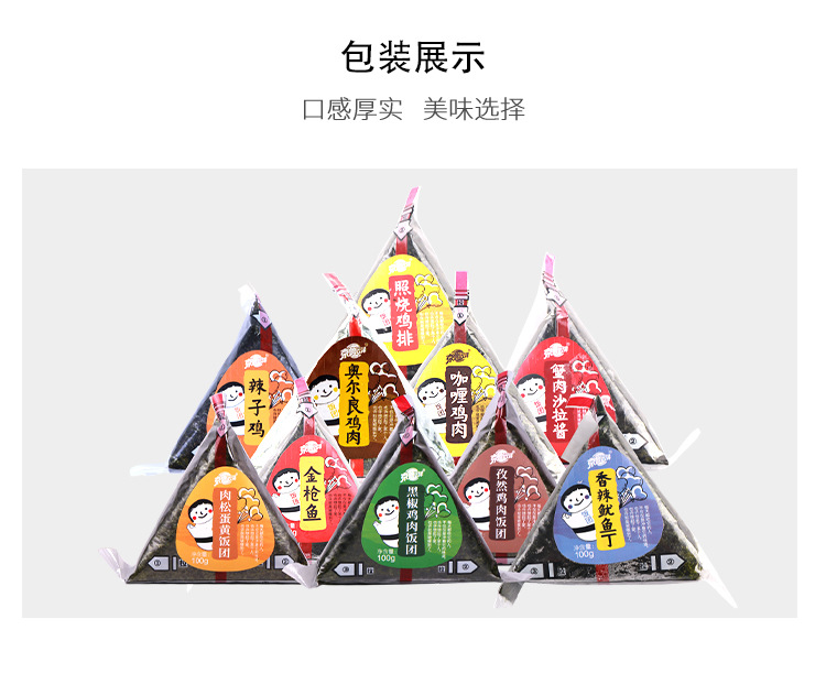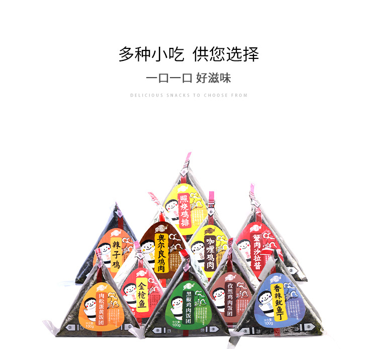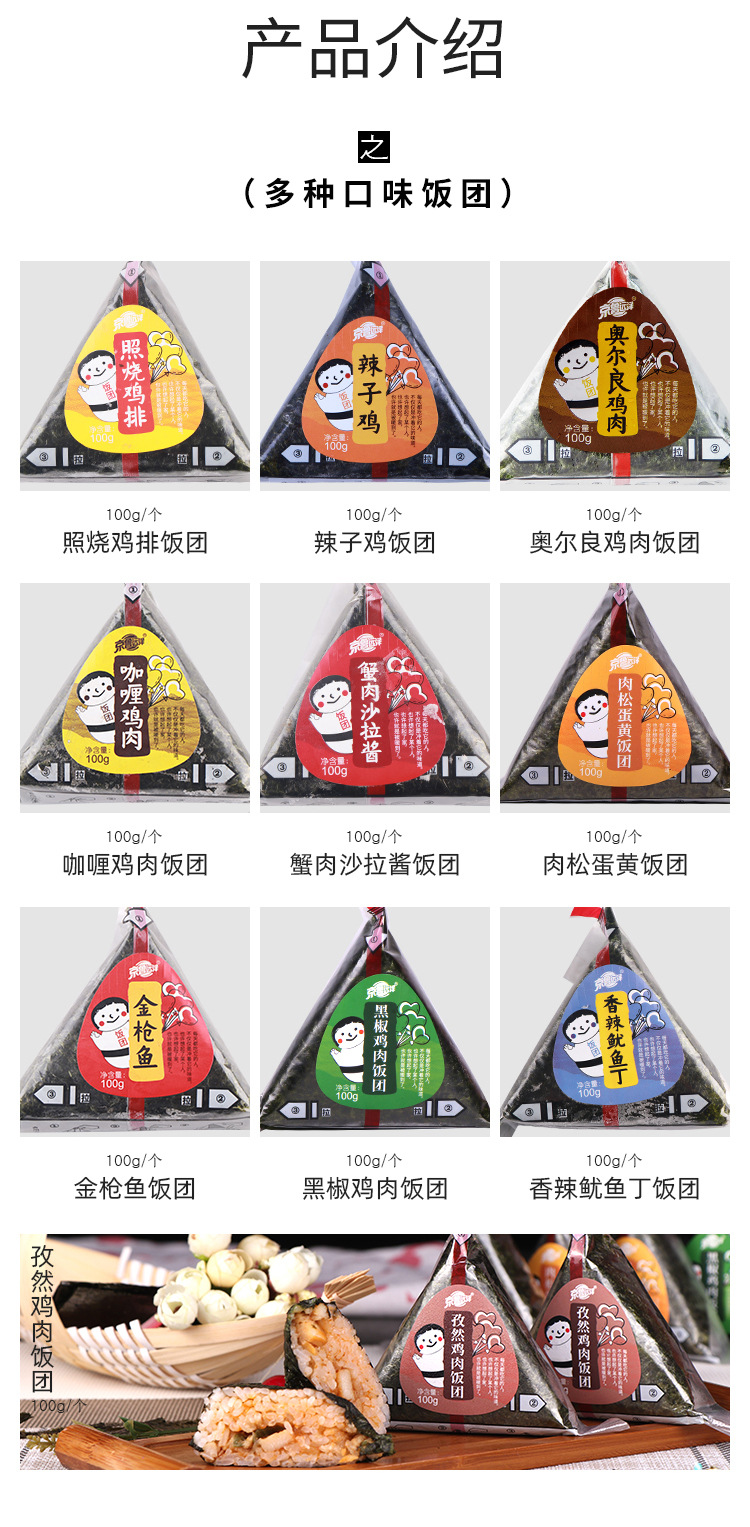 Пряный куриный рисовый шарик 100 г; Orleans куриные рисовые шарики 100 г; Жареный куриный стейк рисовый шарик 100 г; Тмин куриные рисовые шарики 100 г; Пряный кальмар кубиками рисовый шарик 100 г; Карри куриные рисовые шарики 100 г; Черный перец курица рисовые шарики 100 г; Тунец рисовый шарик 100 г; Свиная нить яичный желток рисовый шарик 100 г; Рубленый перец говядина рисовый шарик 100 г