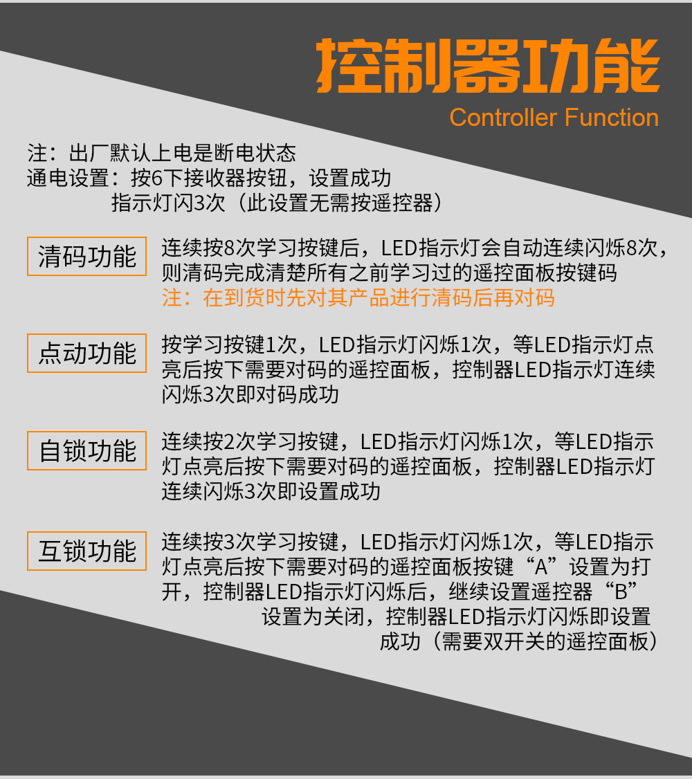 В сочетании с пультом дистанционного управления с символом AB.; В сочетании с пультом дистанционного управления с символом включения и выключения.; В комплекте пульт с блокировкой переключателя.; В сочетании с пультом дистанционного управления 500m AB.; Переключатель линейного приемника; В сочетании с двумя пультами дистанционного управления с символом включения и выключения.; Поставляется с 3 пультами дистанционного управления с символом включения/выключения.; В комплект входят 2 брелока-пульта дистанционного управления.
