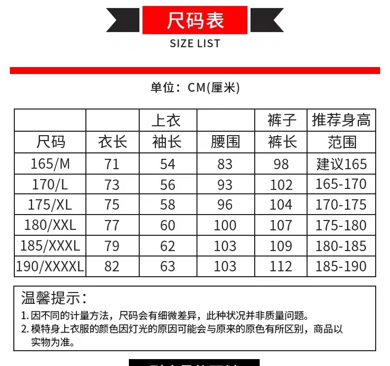 M165; L170; XL175; XXL180; XXXL185; 4XL190