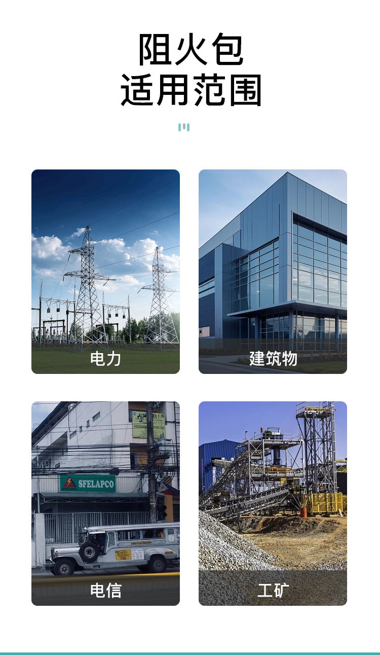 适用于电力、电信、邮政、化工、工矿、企业、建筑当中,电缆、油管、风管、气管、金属管道等贯穿物穿过隔墙或隔层时所形成的空洞的封堵。可阻止火焰蔓延,特别适用于经常更换电缆的重要部位。