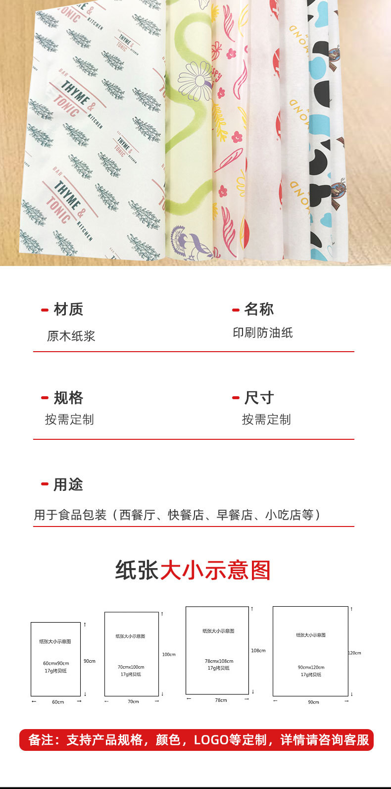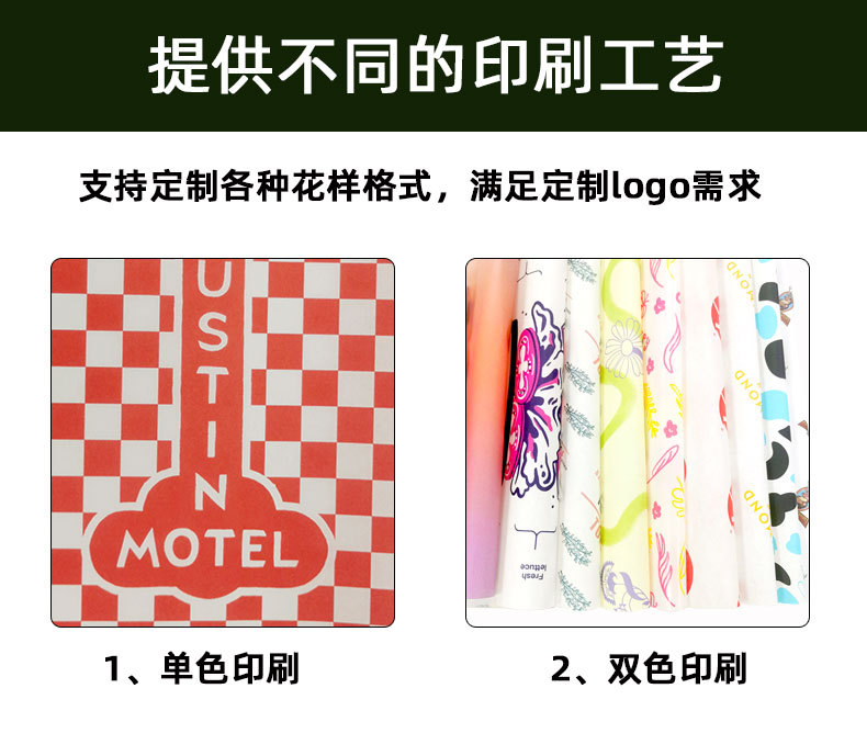定制印刷logo:17克拷贝纸(雪梨纸)、30克哑面牛皮纸、31克蜡光纸、35-45-60-80克白牛皮纸、75-185克硫酸纸、80-120克双胶纸、105-157克双铜纸----等;