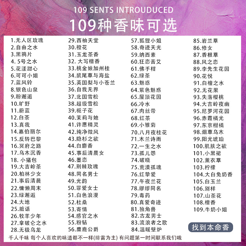 1. Розовые духи в ничейной земле; 2. Вода свободы; 3. Черный опиум; Вода № 4,5; 5. Huayang Sweet; 6. Мисс Коко; 7. Синий колокольчик; 8. Серебряная горная весна; 9. Порошок; 10. Дикий; 11. Лазурный; 12. Белый чай; 13. Истинное Я; 14. Габрилл; 15. Вращение Парижа; 16. Дорога в Аид; 17. Черное дерево Агарвуд; 18. Свинья сумка; 19. Чай Дарджилинг; 20. Девушки в Берлине; 21. Раннее утро после события; 22. Ленивые выходные; 23. Зеленая марионетка; 24. Земля; 25. Грязные слова; 26. Пастух; 27. Вода Наполеона; 28. Обещая улун; 29. Рай грейпфрута; 30. Оранжевый цветок; 31. Юлонг чай аромат; 32. прописное сандаловое дерево; 33. Мирт и Калифорния Гуй; 34. Шалфей и морская соль; 35. Британская груша и фрезия; 36. Самостоятельность; 37. Северный королевский кедр; 38. Супер кедр; 39. Цветок гардении; 40. Жасмин и она; 41. Желая эльф; 42. Чистый ветерок; 43. Скрытое желание; 44. Белый мускус; 45. Раннее утро после; 46. Чернильная любовь; 47. Терновая роза; 48. Человек с тем же именем; 49. Световая рифма; 50. Г-жа Грех; 51. Белый Романтика; 52. Душан; 53. Отправка информации; 54. Вода для чувств; 55. Розовая дрель; 56. Герцог Лось; 57. Мисс Фокс; 58. Чудо небо; 59. Насису; 60. Безумная любовь; 61. Бергамот; 62. Зеленый чай; 63. Очарование; 64. Фиолетовый шарм; 65. Сад на крыше; 66. Холодная вода; 67. Мясо ленты; 68. Черный чай; 69. Маленькие ромашки; 70. Август ночь османтуса; 71. Мулан Шию; 72. Вода для жизни; 73. Обиды сирот; 74. Рассвет; 75. Одинокая душа пустыни; 76. Красная любовь; 77. Полночь орхидеи; 78. Мяо Мяо с тем же именем; 79. Яд; 80. Настоящая любовь Чудо; 81. Единорог; 82. Гу Лонг Мужчины; 83. Песня странников; 84. Теплый камин; 85. Каменная трава; 86. Сестры; 87. Вандал; 88. Любовь ветра; 89. Сад г-на Ли; 90. Хуа Юэ; 91. Вода из белого сандалового дерева; 92. Инжир; 93. Потерянная вишня; 94. Чайная ночь Дарджилинга; 95. Нильский сад; 96. Чикся оранжевый свет; 97. Токийские цитрусовые; 98. Табачное черное дерево; 99. Солнечный янтарь; 100. Желание кожи; 101. Маленькое черное платье; 102. Лаванда; 103. Лимон; 104. Большой белый кроличий молочный аромат; 105. Магнолия; 106. По-иному 13; 107. Камелия; 108. сандаловое дерево; 109. Мисс Молоко