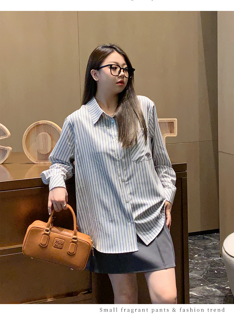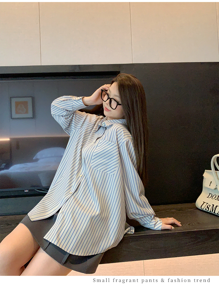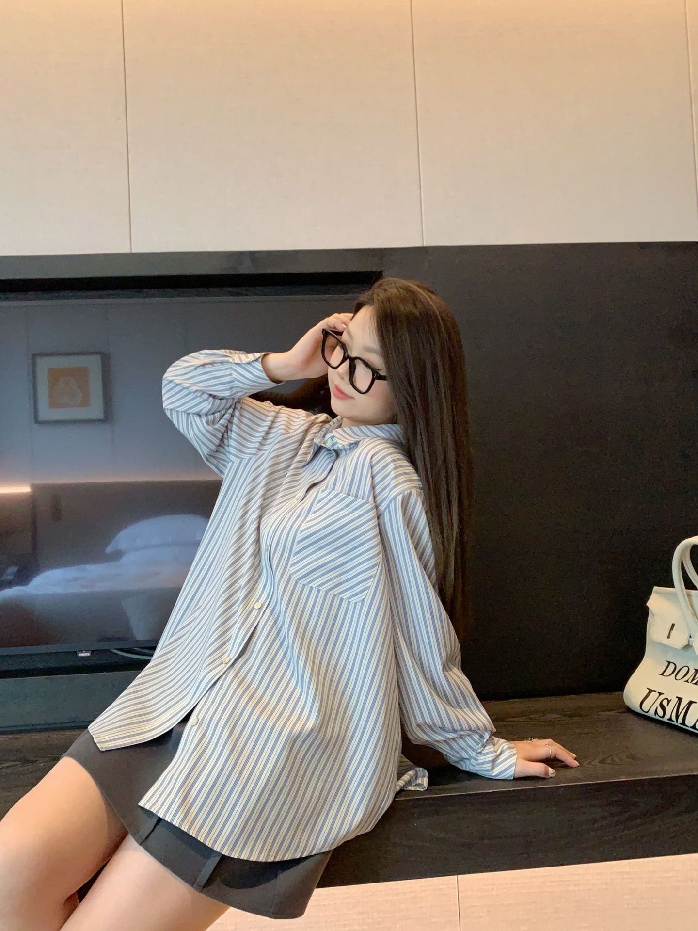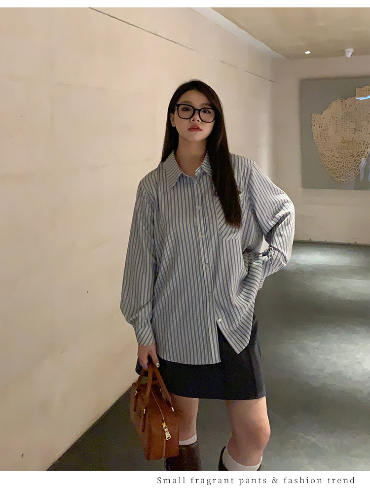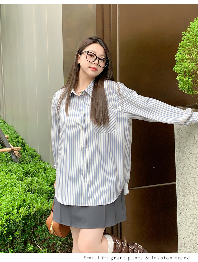 Женская рубашка в полоску в корейском стиле больших размеров, свободная повседневная стильная рубашка с вертикальными полосками, свободного кроя, с длинными рукавами и воротником-поло.