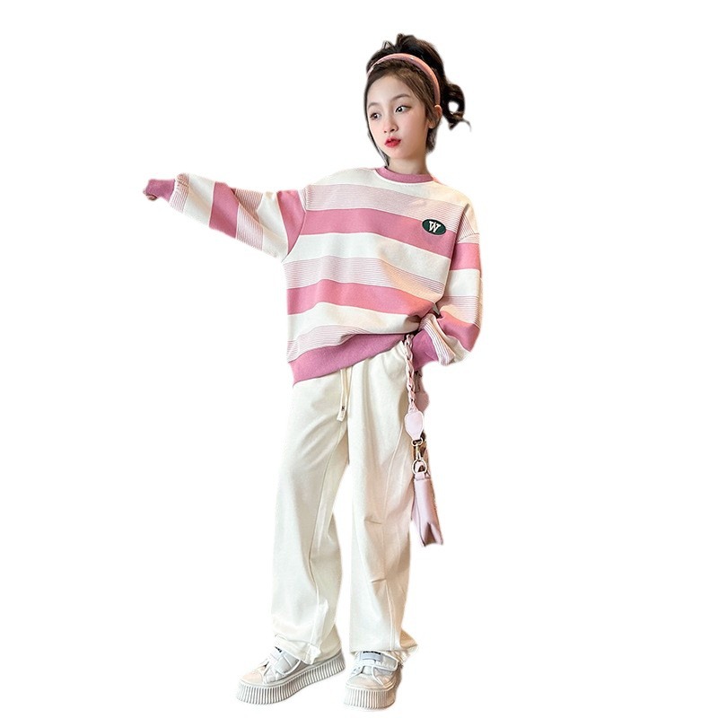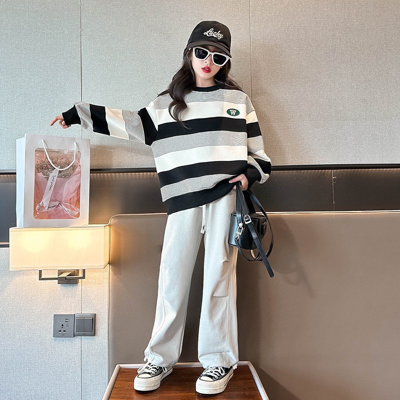 Весенне-осенний модный двухцветный Свободный Повседневный свитер в полоску для девочек, пуловер в западном стиле для детей среднего и большого размера, футболка с длинным рукавом