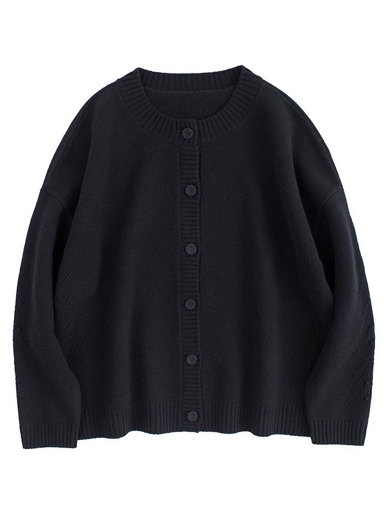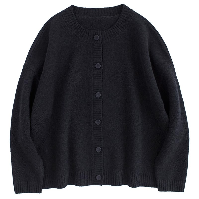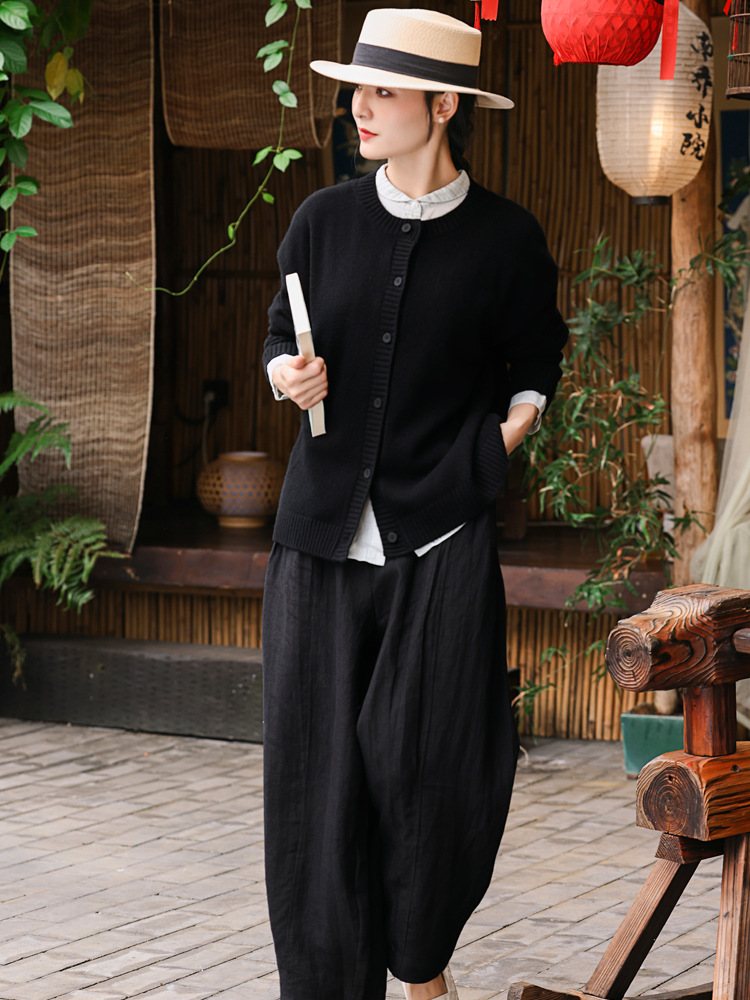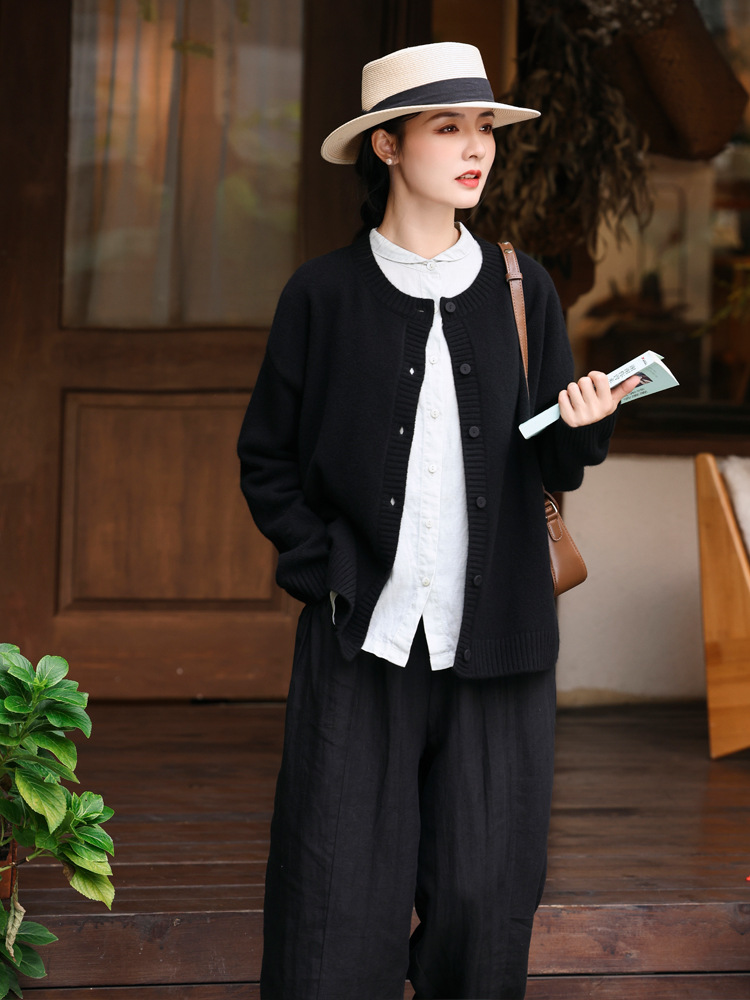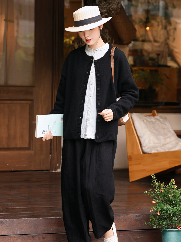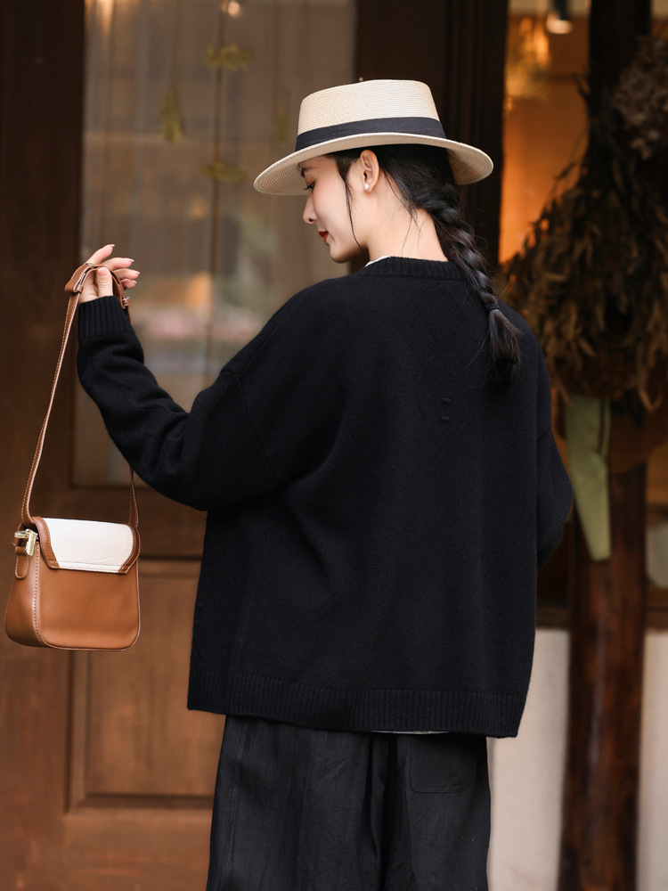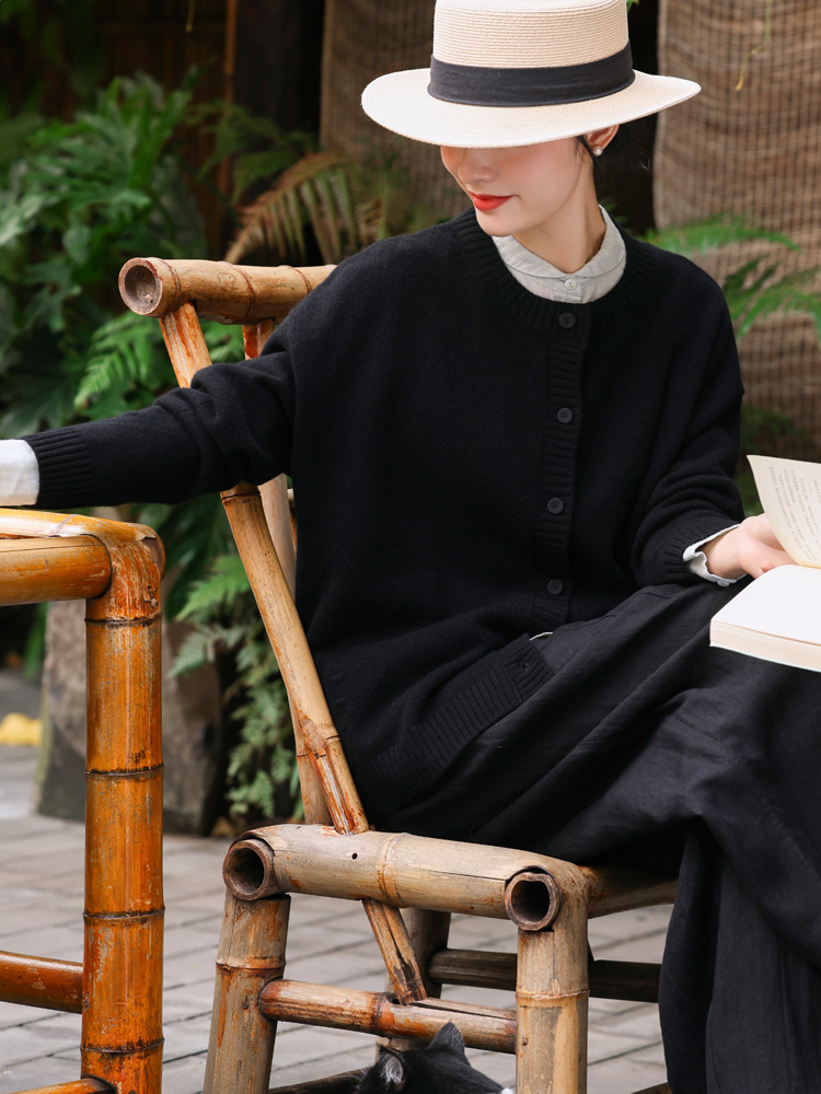 Женский вязаный свитер из 100% шерсти с открытым передом, осенне-зимний, в натуральном стиле, простой, ретро, с цветочным узором, черный.