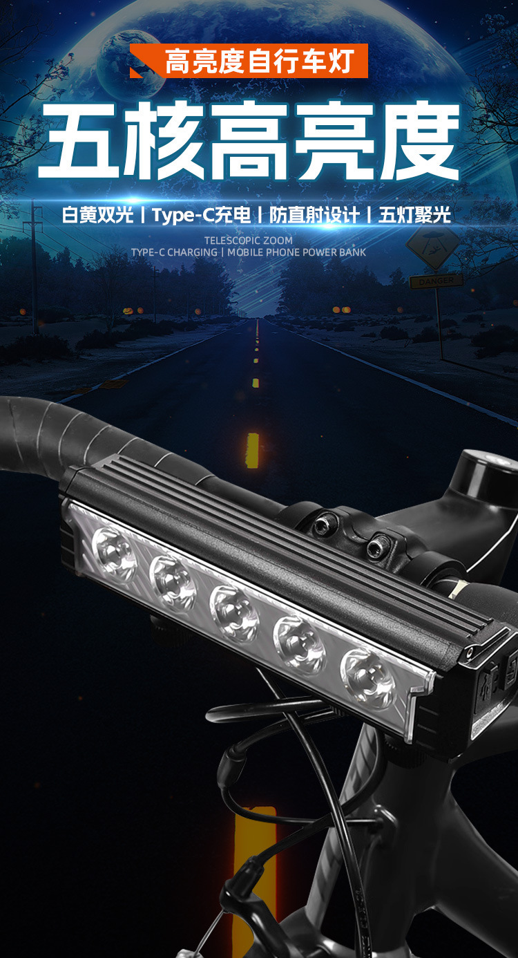 Новые велосипедные фонари высокой яркости Type-C перезаряжаемый алюминиевый сплав Пять огней большой емкости на открытом воздухе велосипедные фары