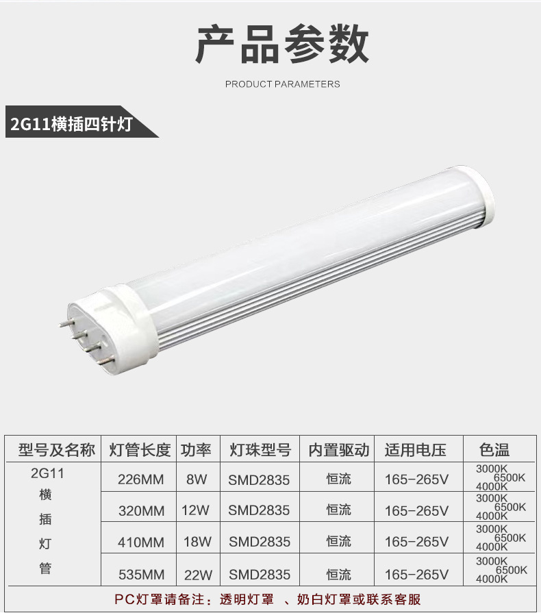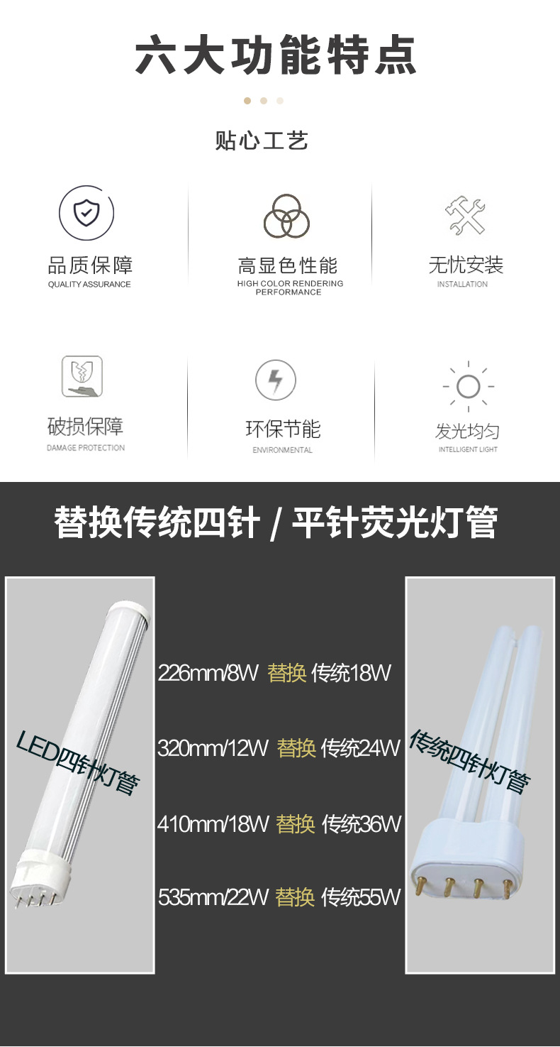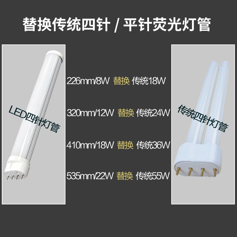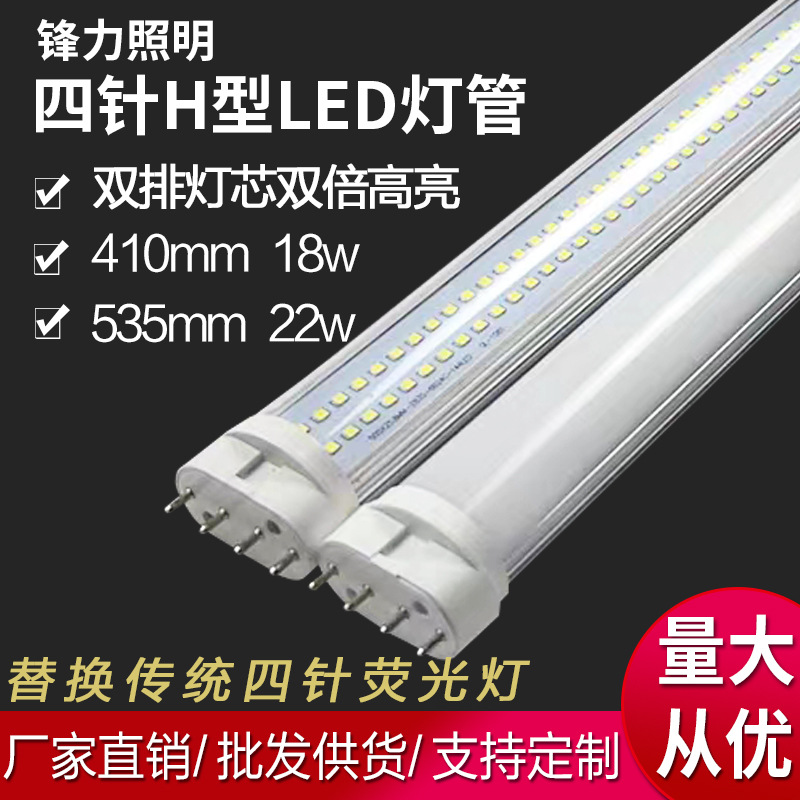 Четырехконтактная горизонтальная вставная лампа 2g11H заменяет традиционную лампу с плоскими контактами, горизонтальную вставную светодиодную люминесцентную лампу 410 мм мощностью 18 Вт.