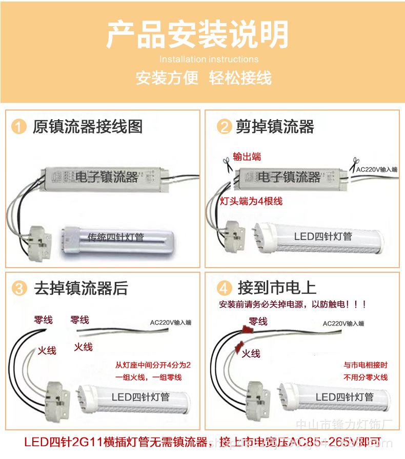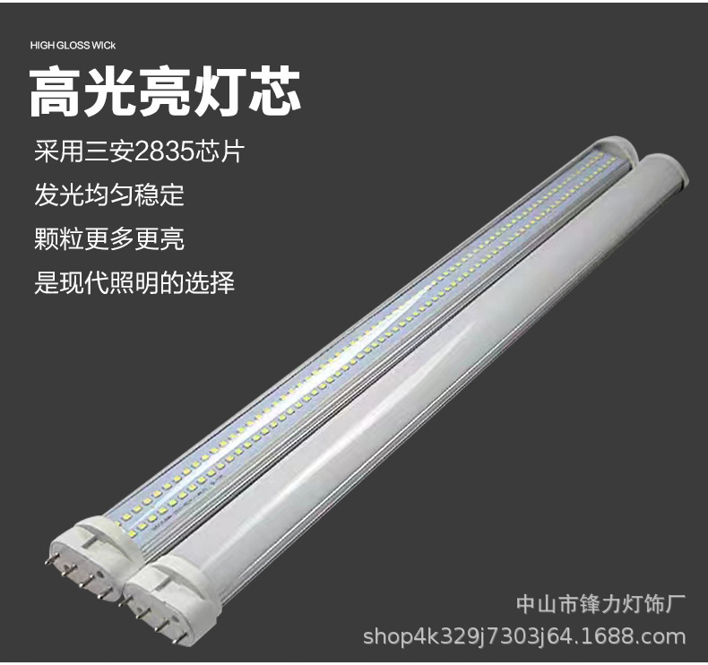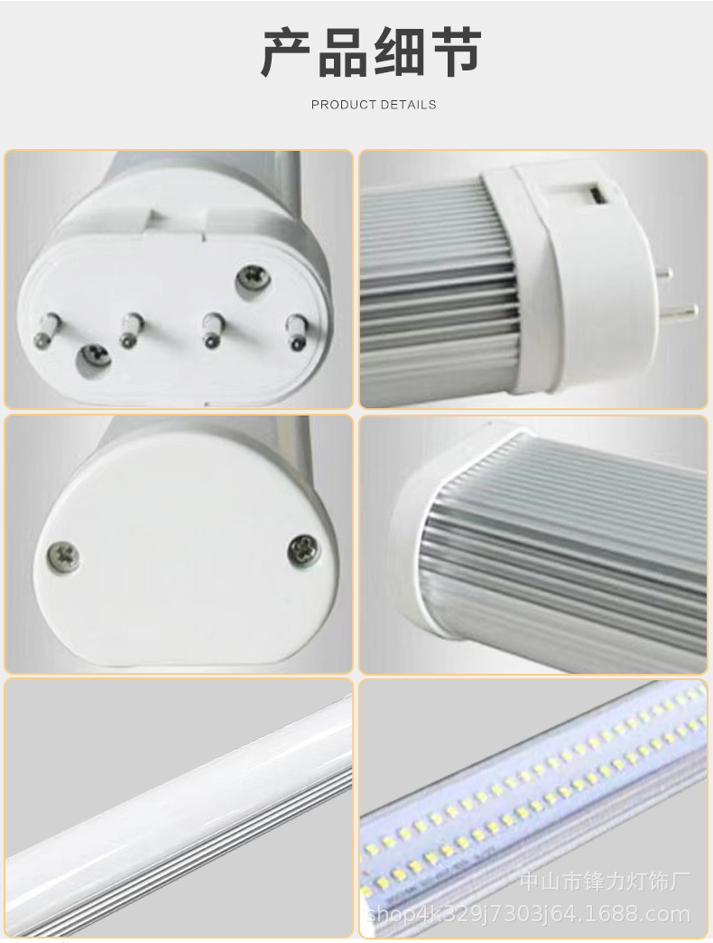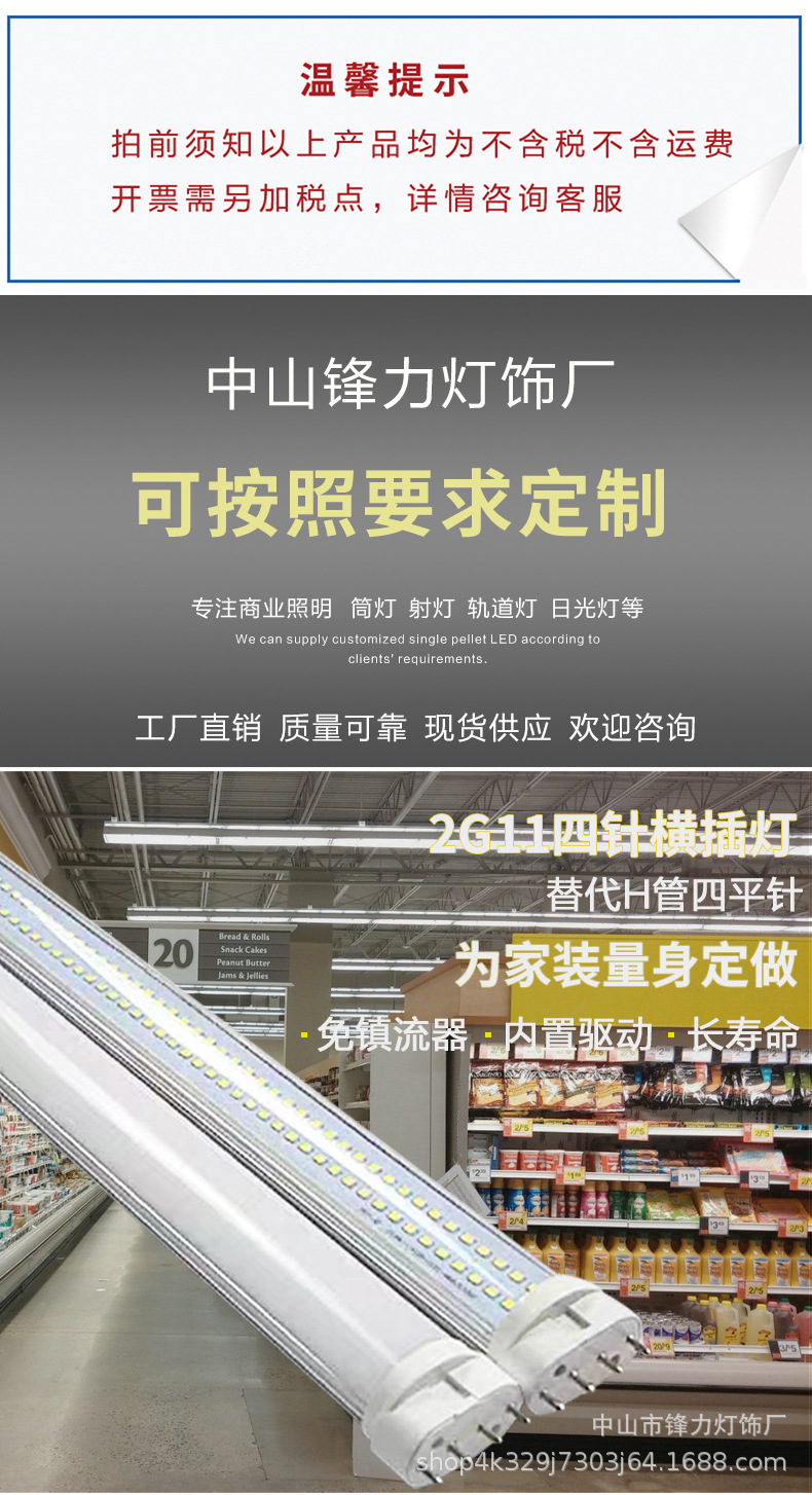 Четырехконтактная горизонтальная вставная лампа 2g11H заменяет традиционную лампу с плоскими контактами, горизонтальную вставную светодиодную люминесцентную лампу 410 мм мощностью 18 Вт.