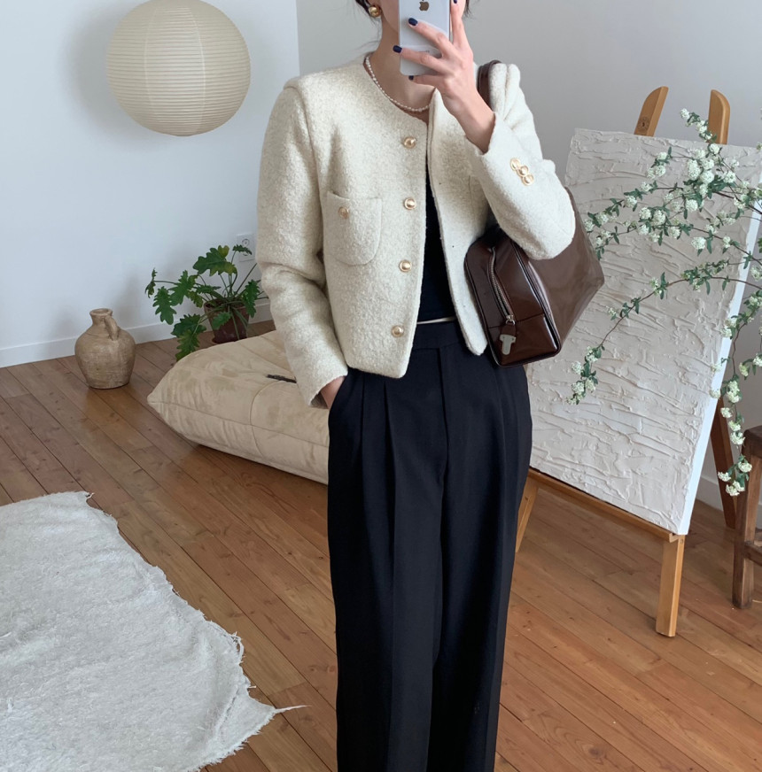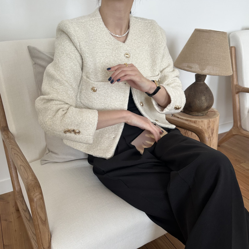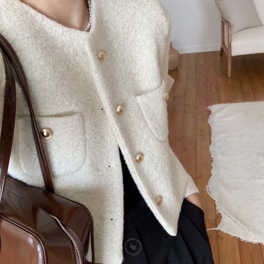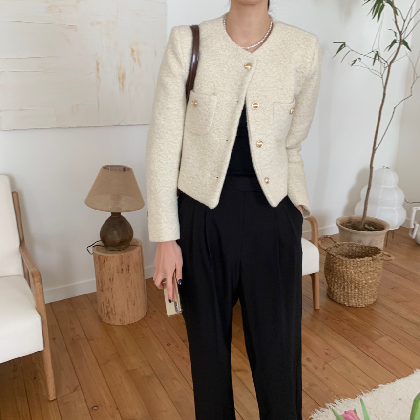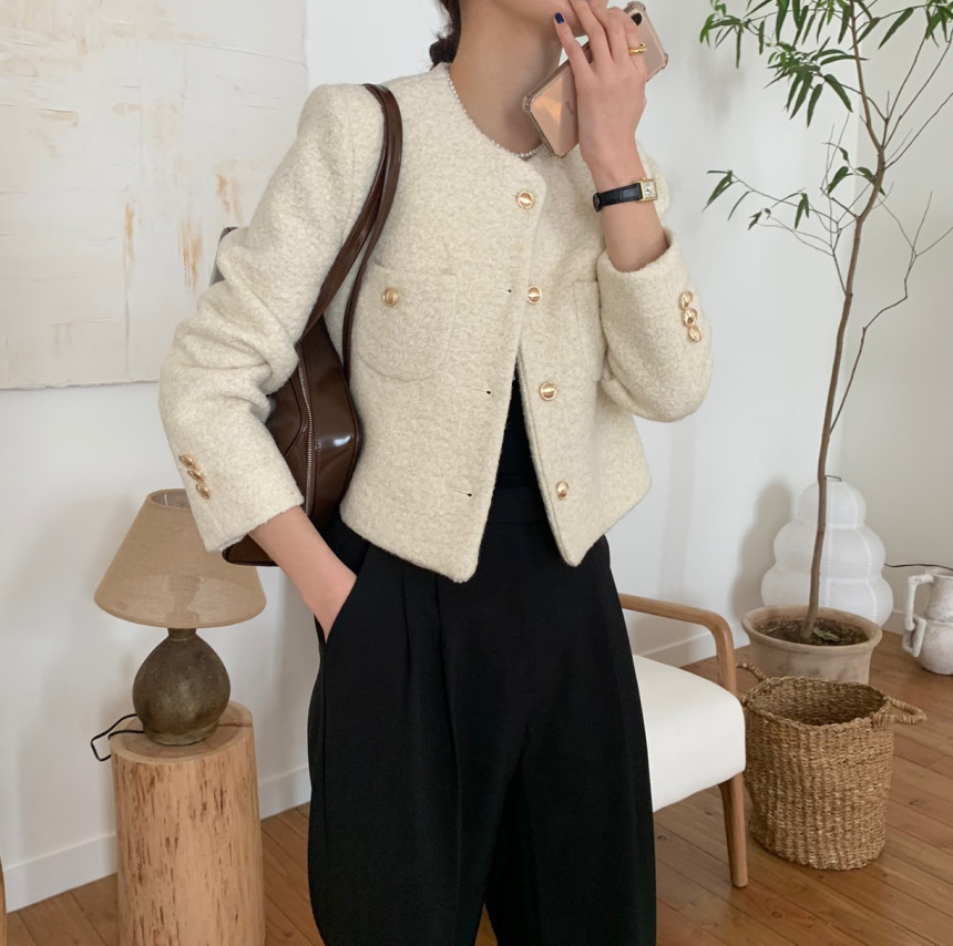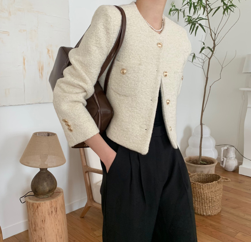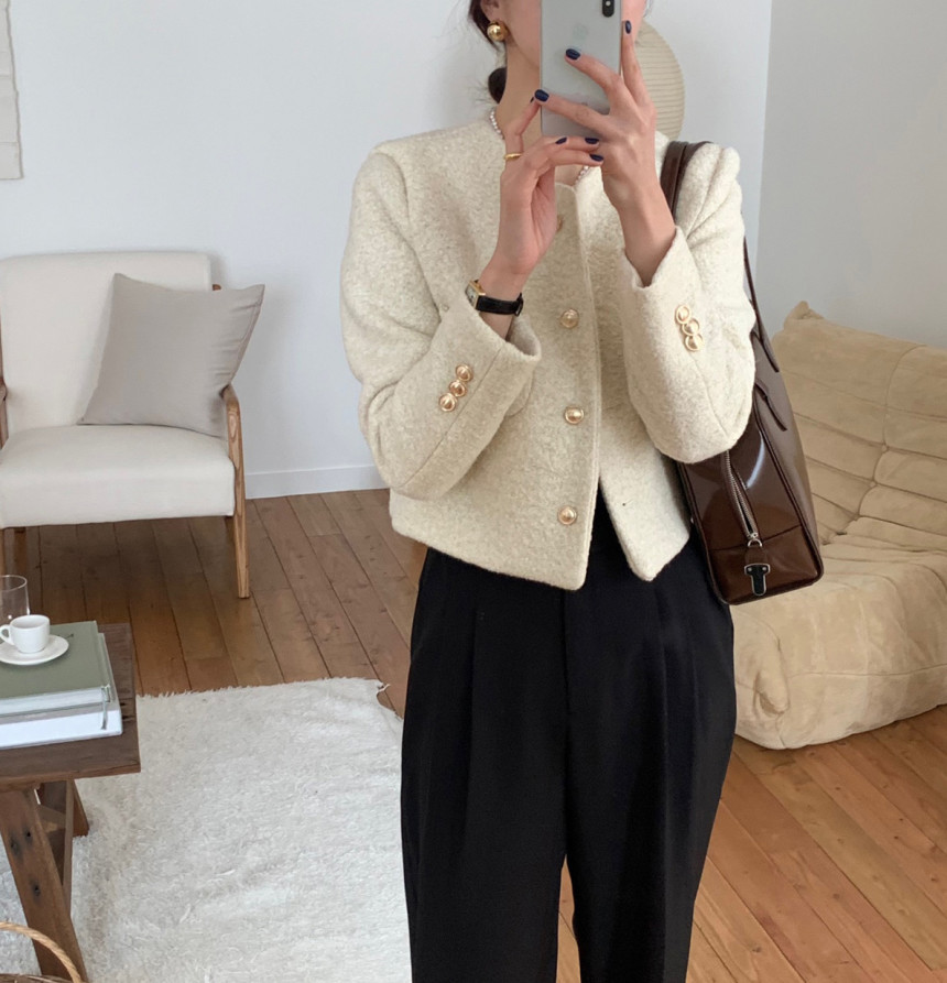 Новая корейская модель осенне-зимней коллекции 2025 года: короткая, приталенная шерстяная куртка для невысоких женщин с шикарным и элегантным дизайном.