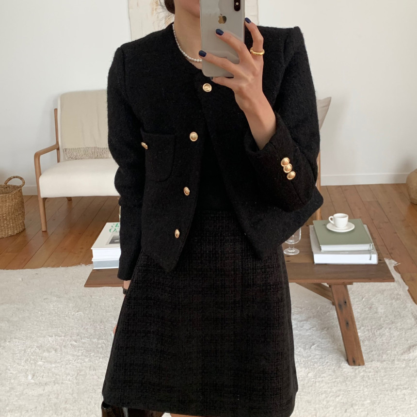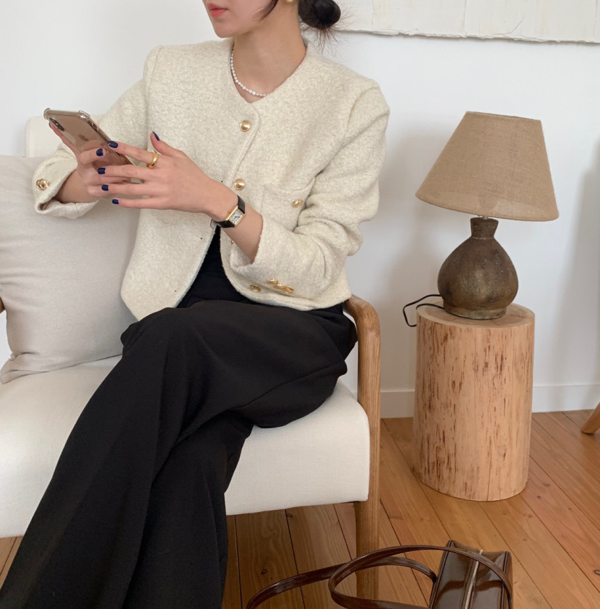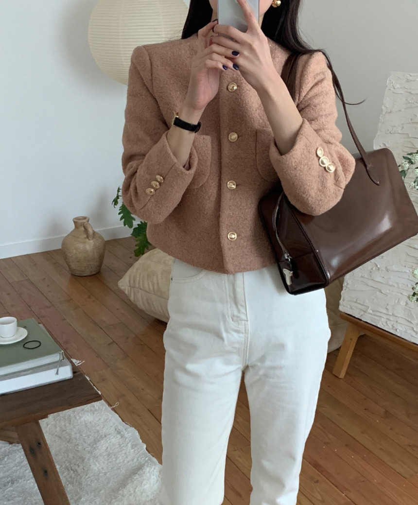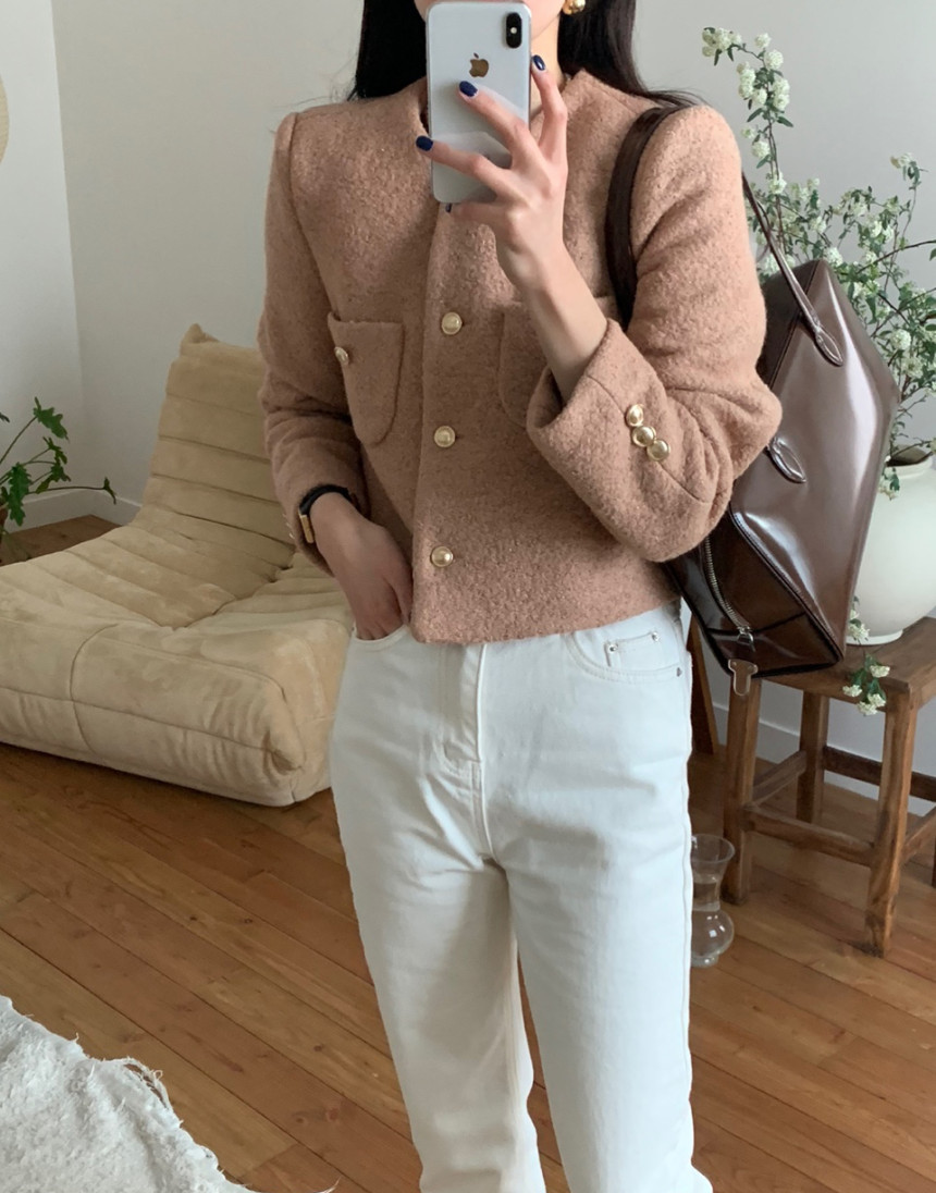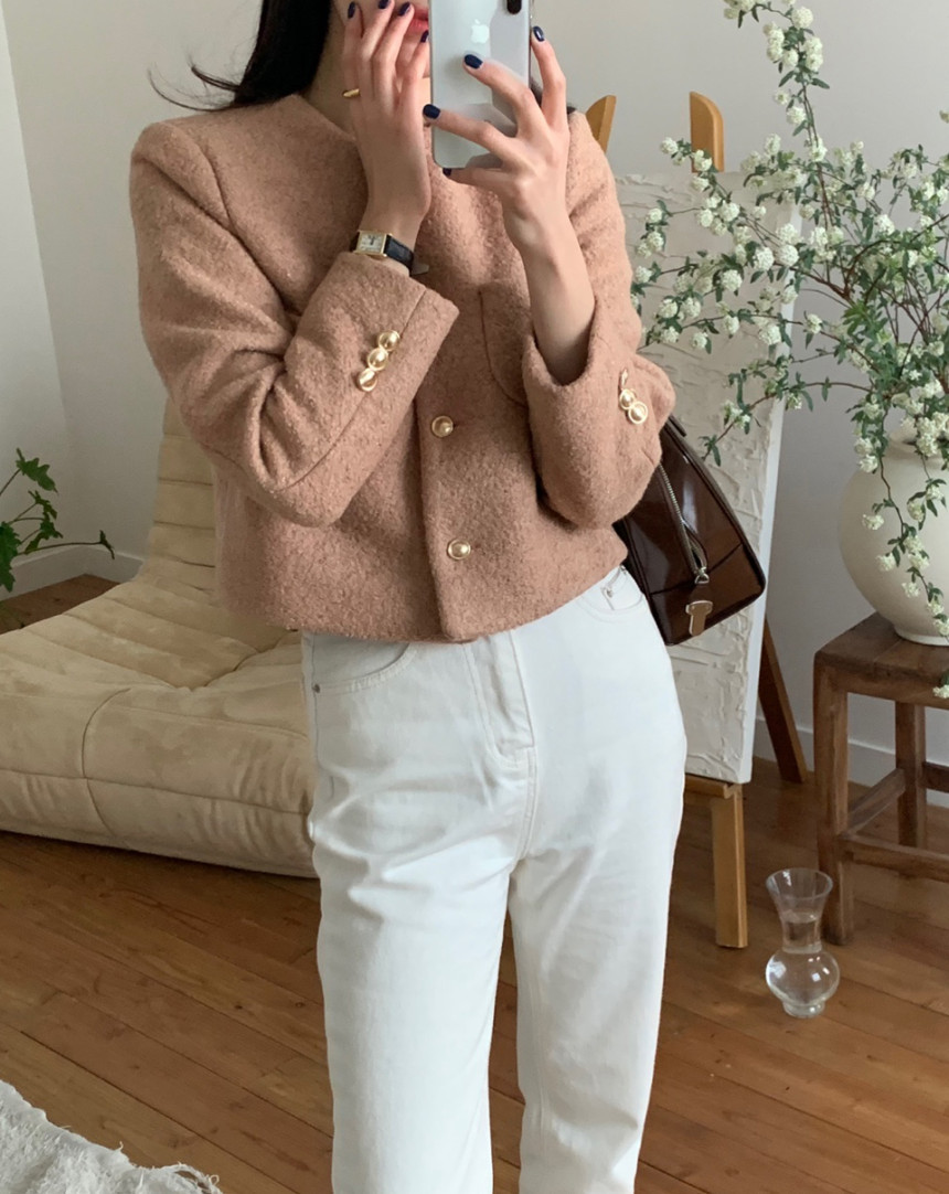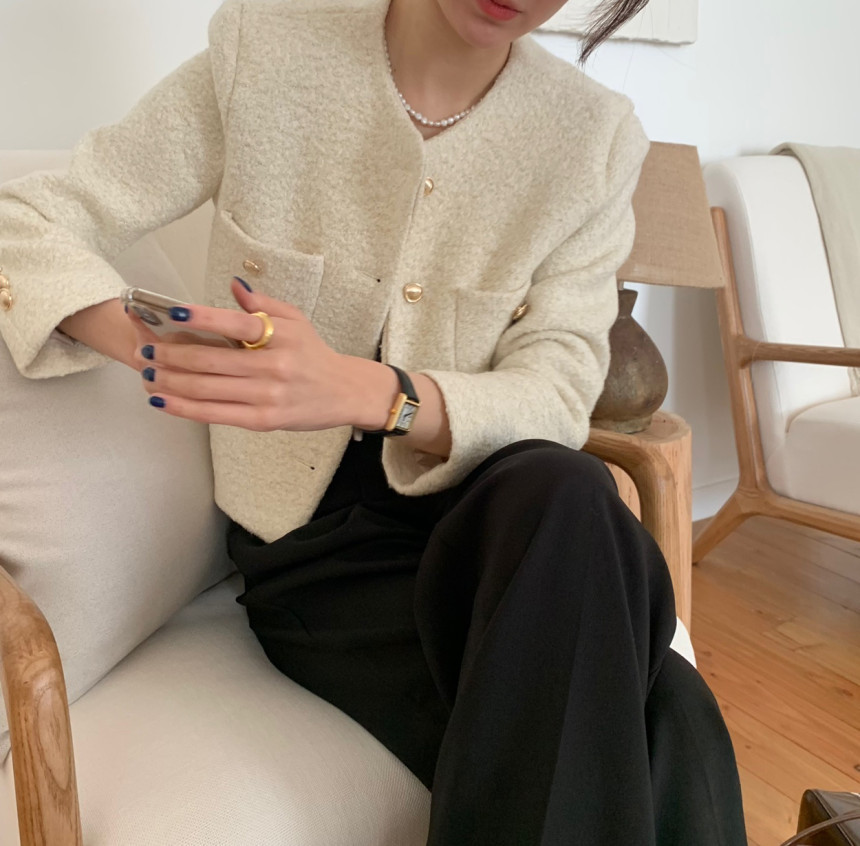 Новая корейская модель осенне-зимней коллекции 2025 года: короткая, приталенная шерстяная куртка для невысоких женщин с шикарным и элегантным дизайном.