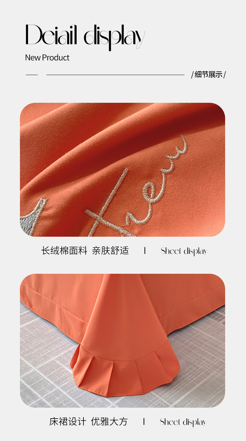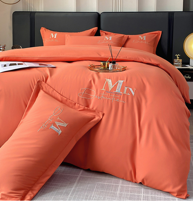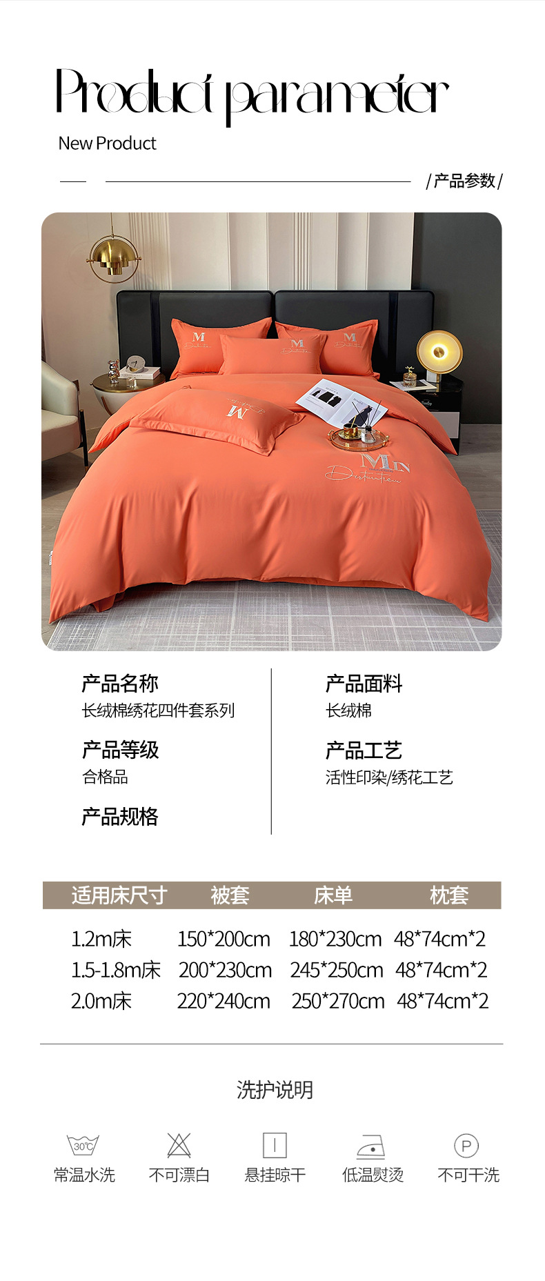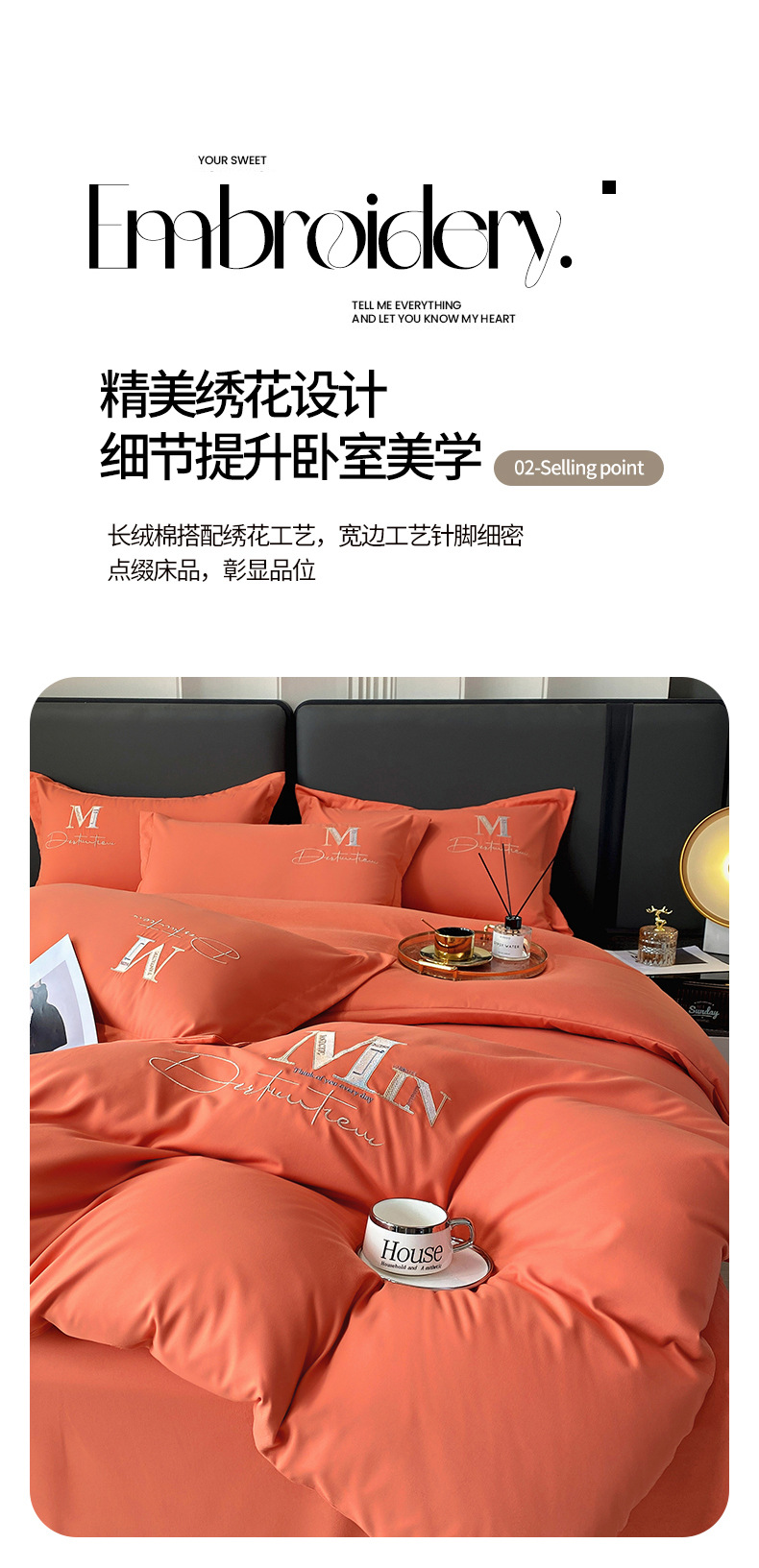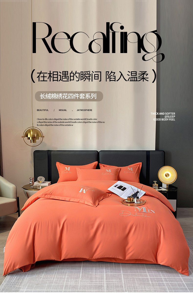 Однотонный комплект из четырех предметов из длинноволокнистого хлопка с вышивкой: простыня, пододеяльник, наволочки (осень-зима), простой комплект из трех предметов: простыня, пододеяльник, наволочки, теплый, с вышивкой, из начесанной ткани.