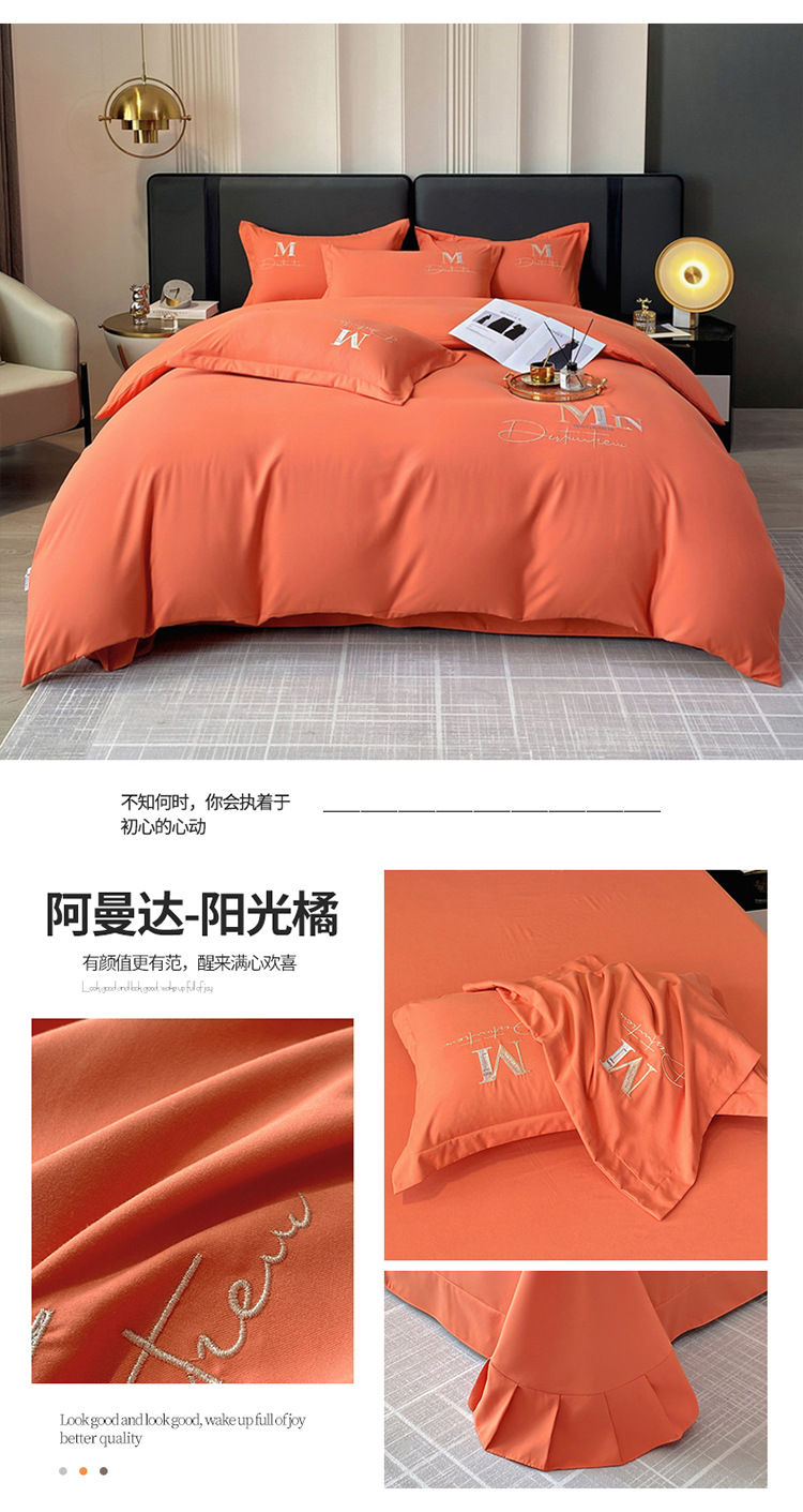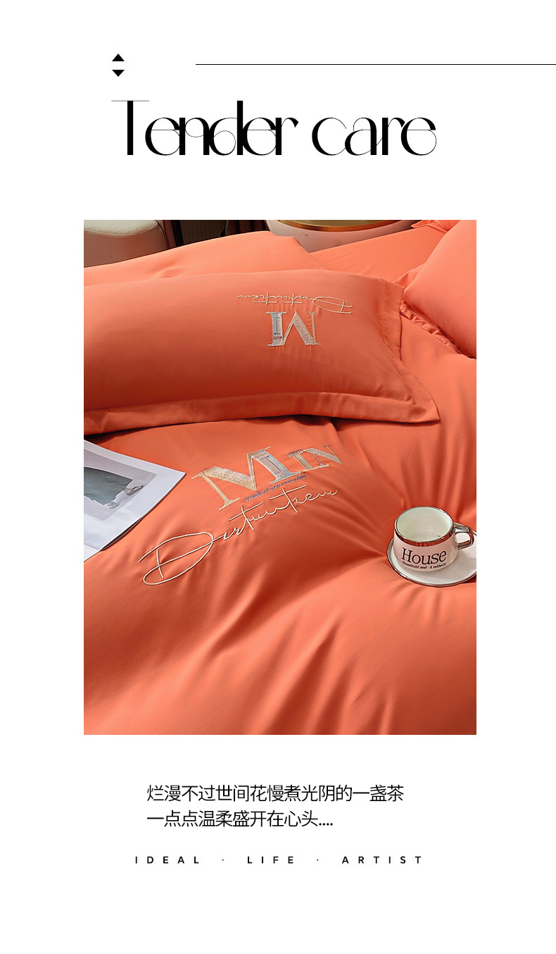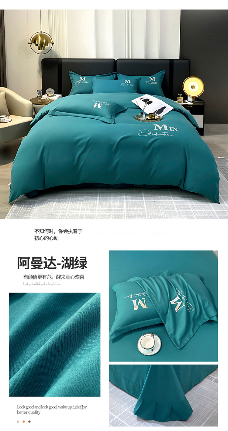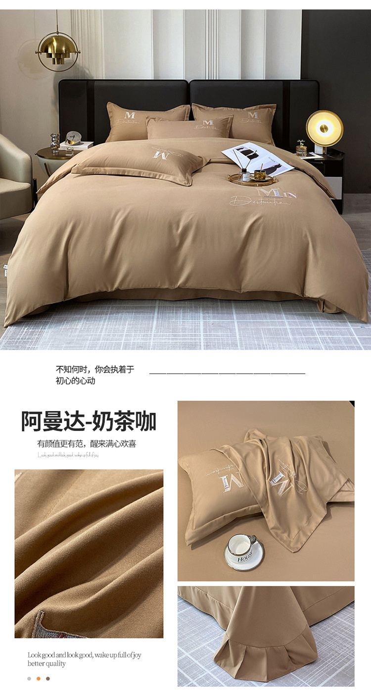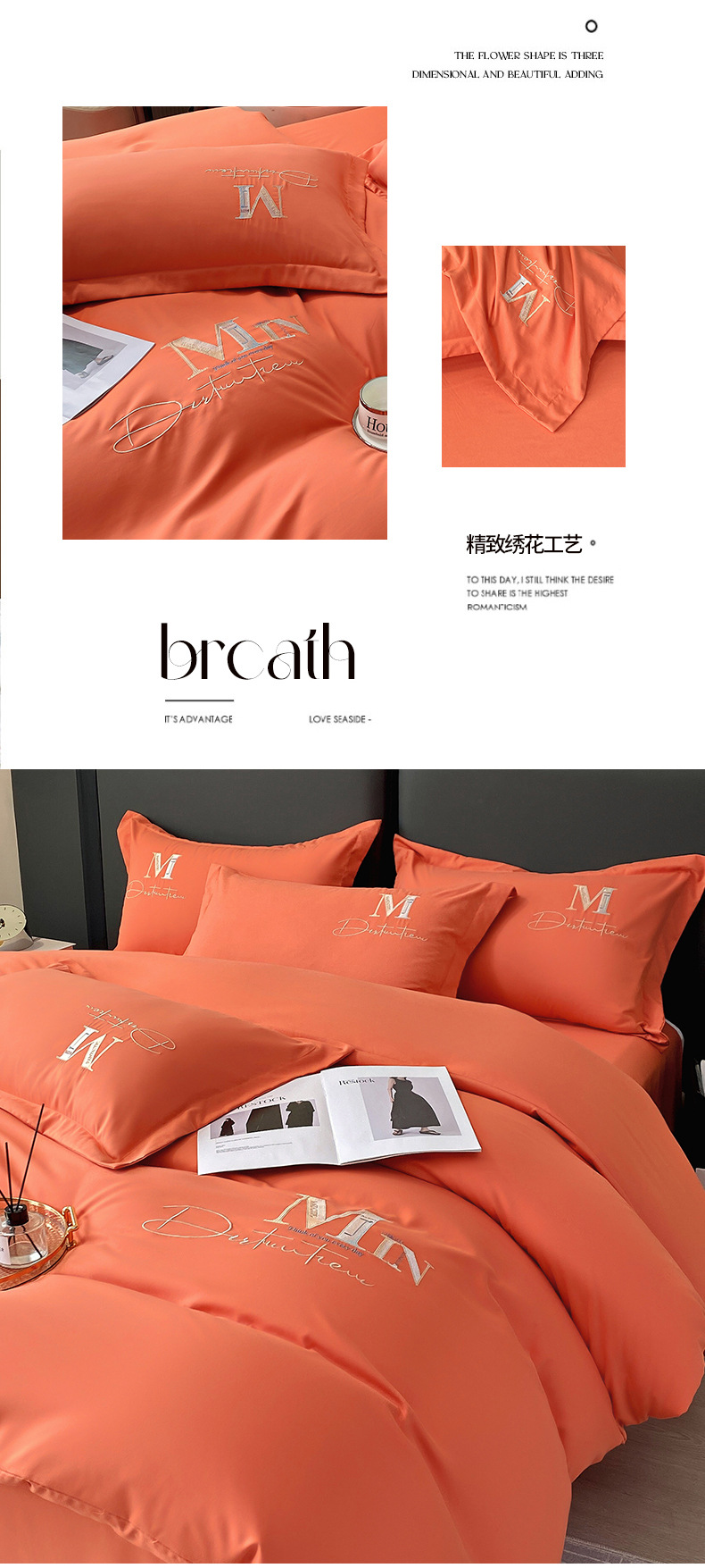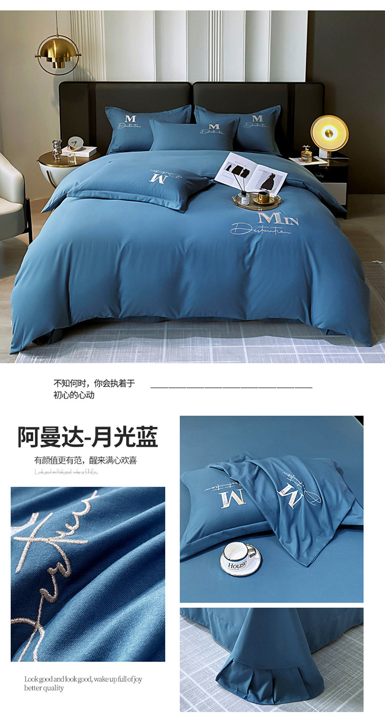 Однотонный комплект из четырех предметов из длинноволокнистого хлопка с вышивкой: простыня, пододеяльник, наволочки (осень-зима), простой комплект из трех предметов: простыня, пододеяльник, наволочки, теплый, с вышивкой, из начесанной ткани.