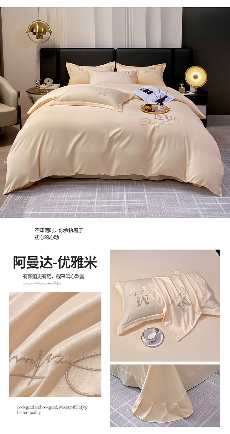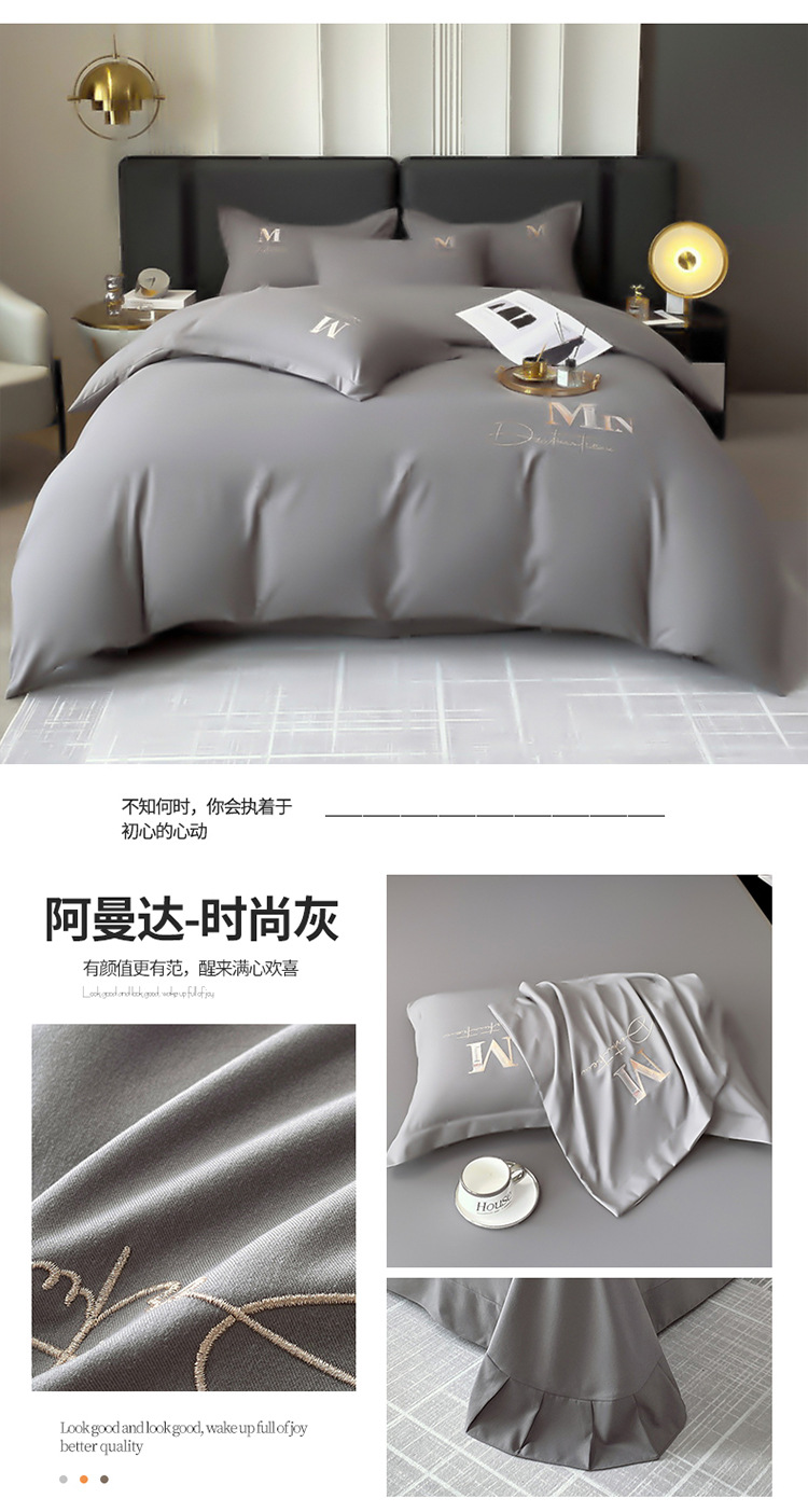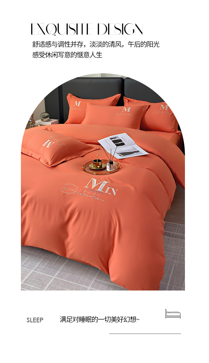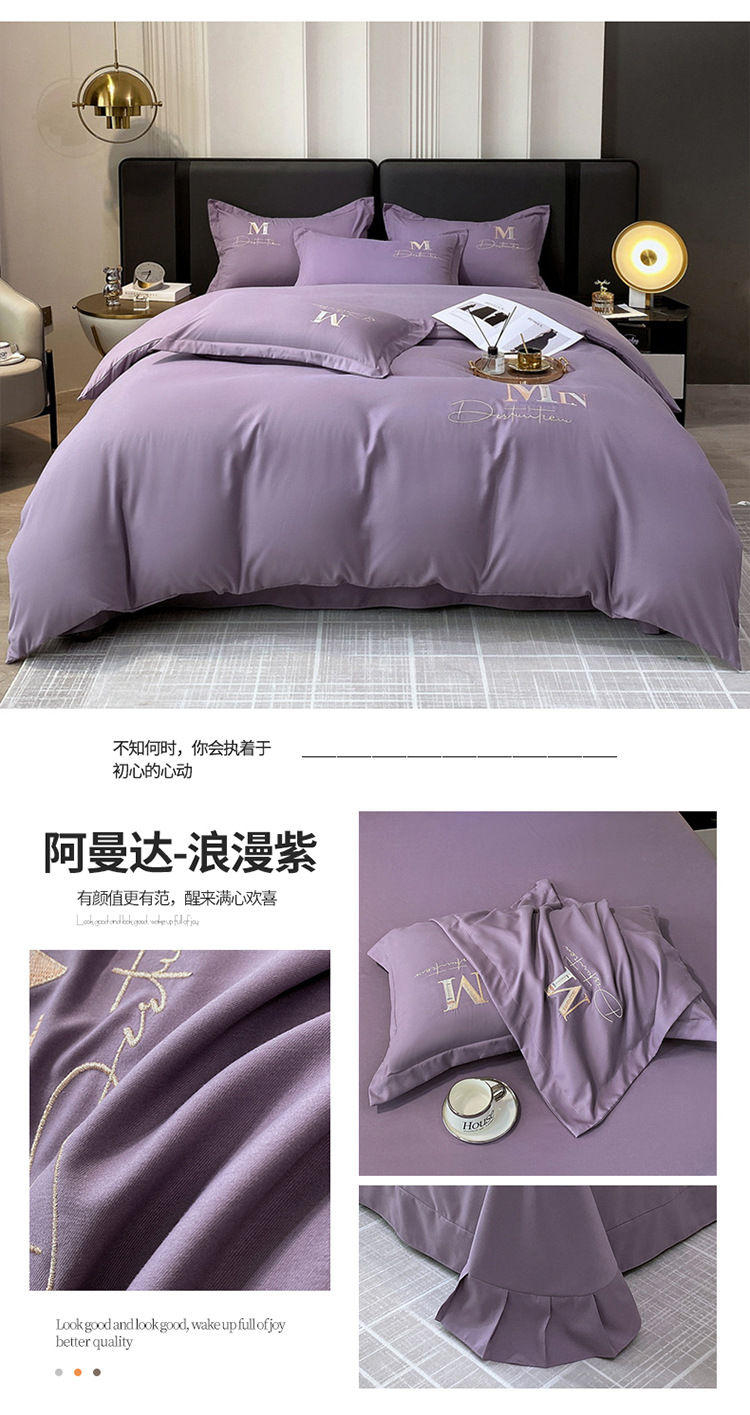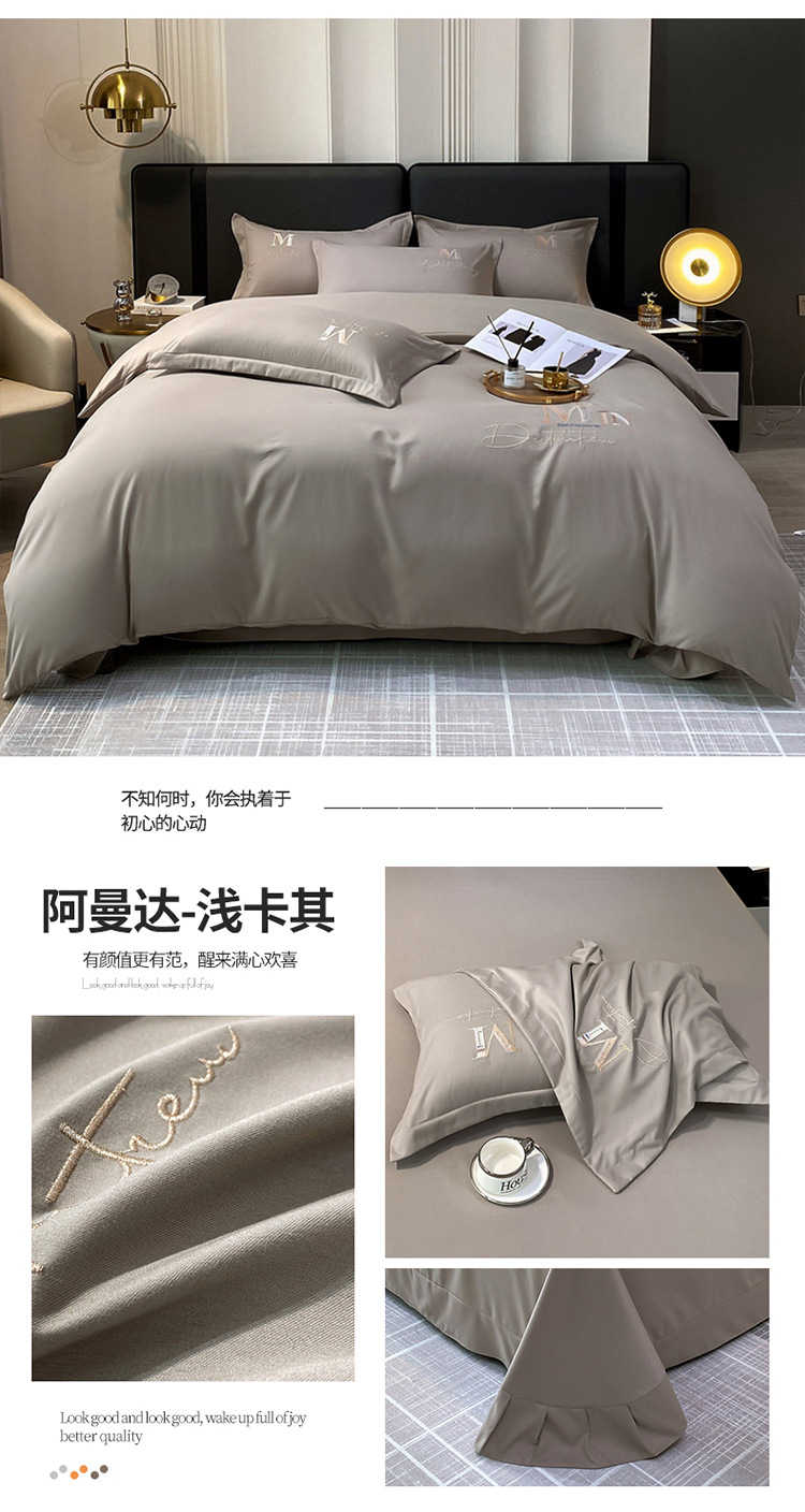 Однотонный комплект из четырех предметов из длинноволокнистого хлопка с вышивкой: простыня, пододеяльник, наволочки (осень-зима), простой комплект из трех предметов: простыня, пододеяльник, наволочки, теплый, с вышивкой, из начесанной ткани.