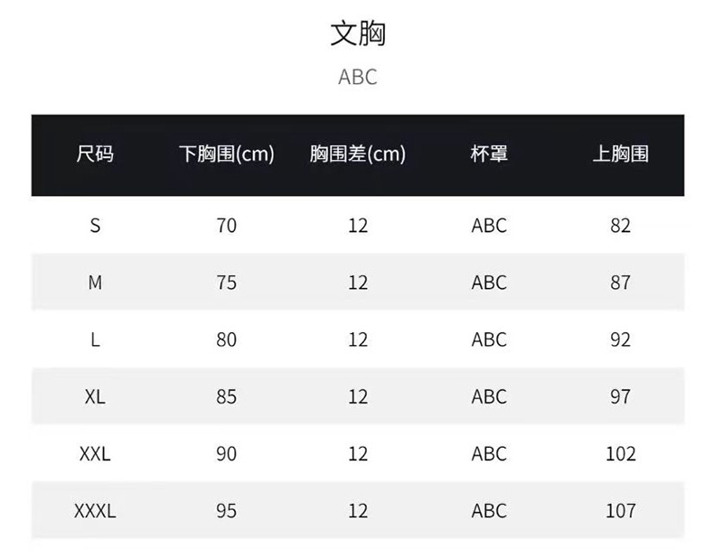 S【Подходит для 70/32AB】; M【Подходит для 75/34AB】; L【Подходит для 80/36ABC】; XL [подходит для 85/38ABC]; 2XL [подходит для 90/40ABC]; 3XL [подходит для 95/42ABC]