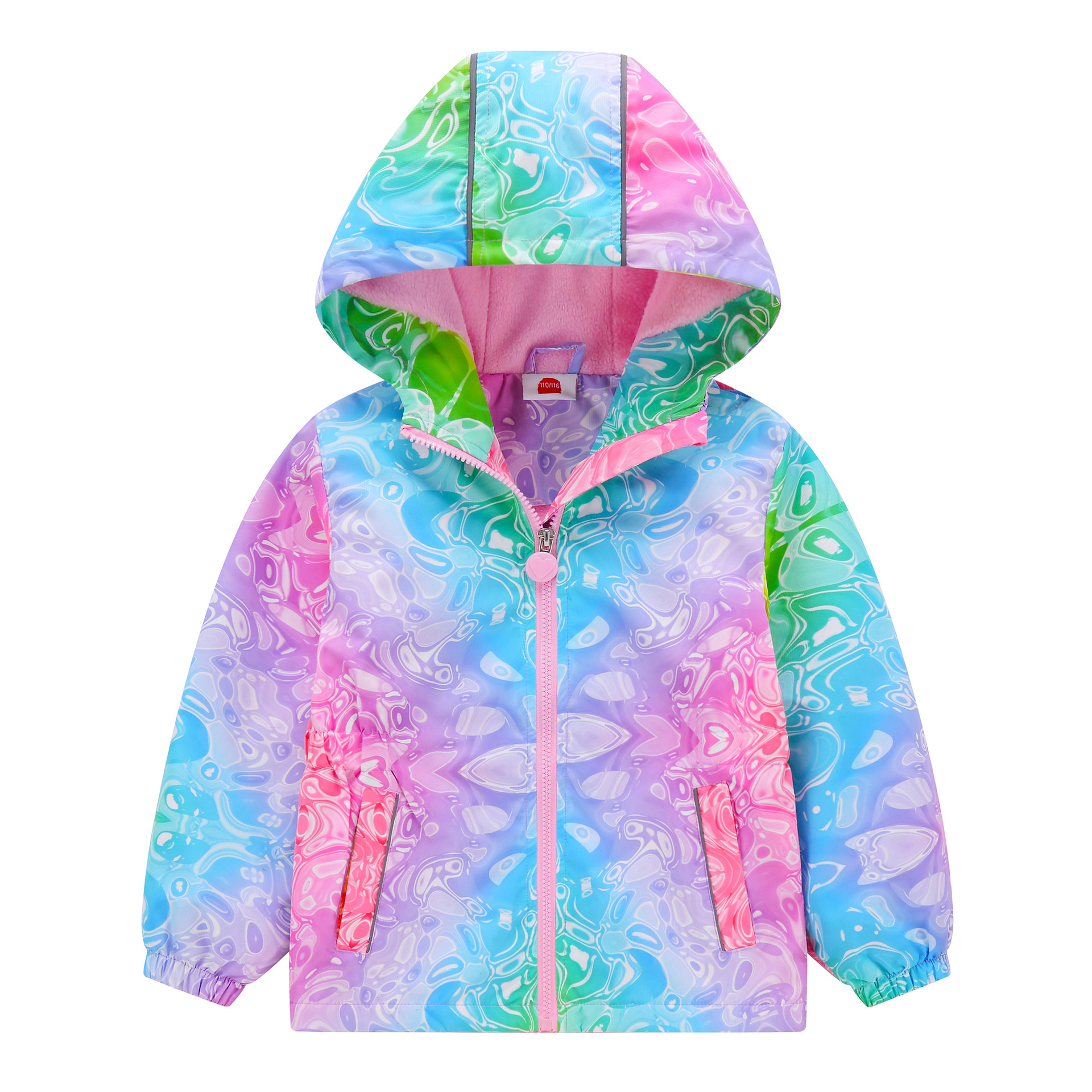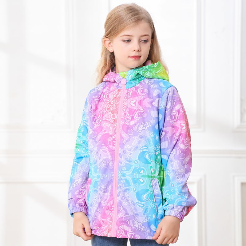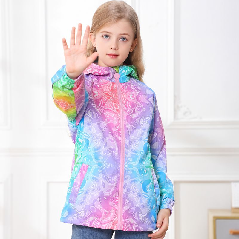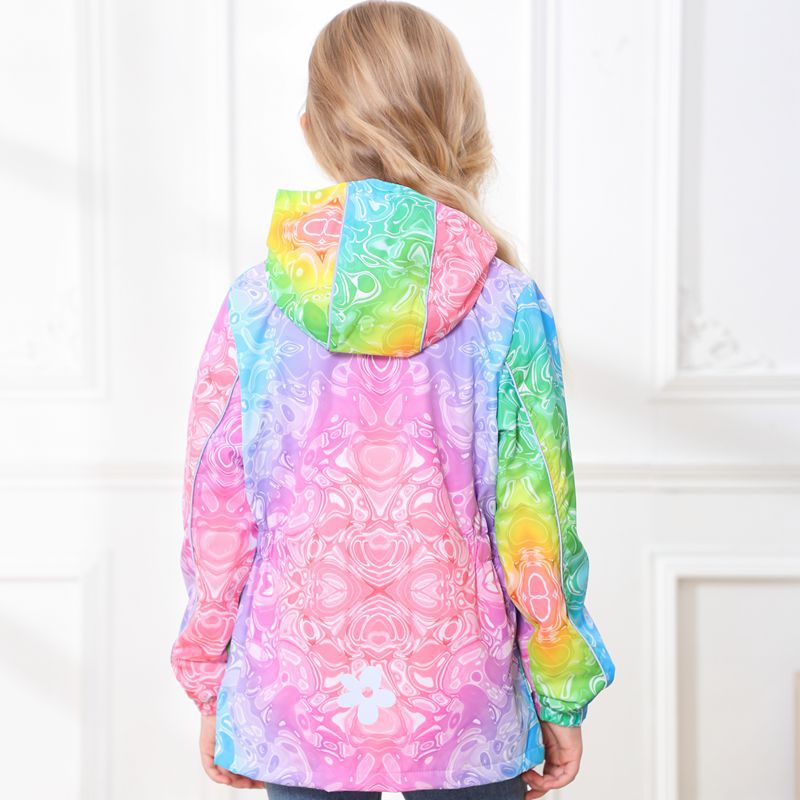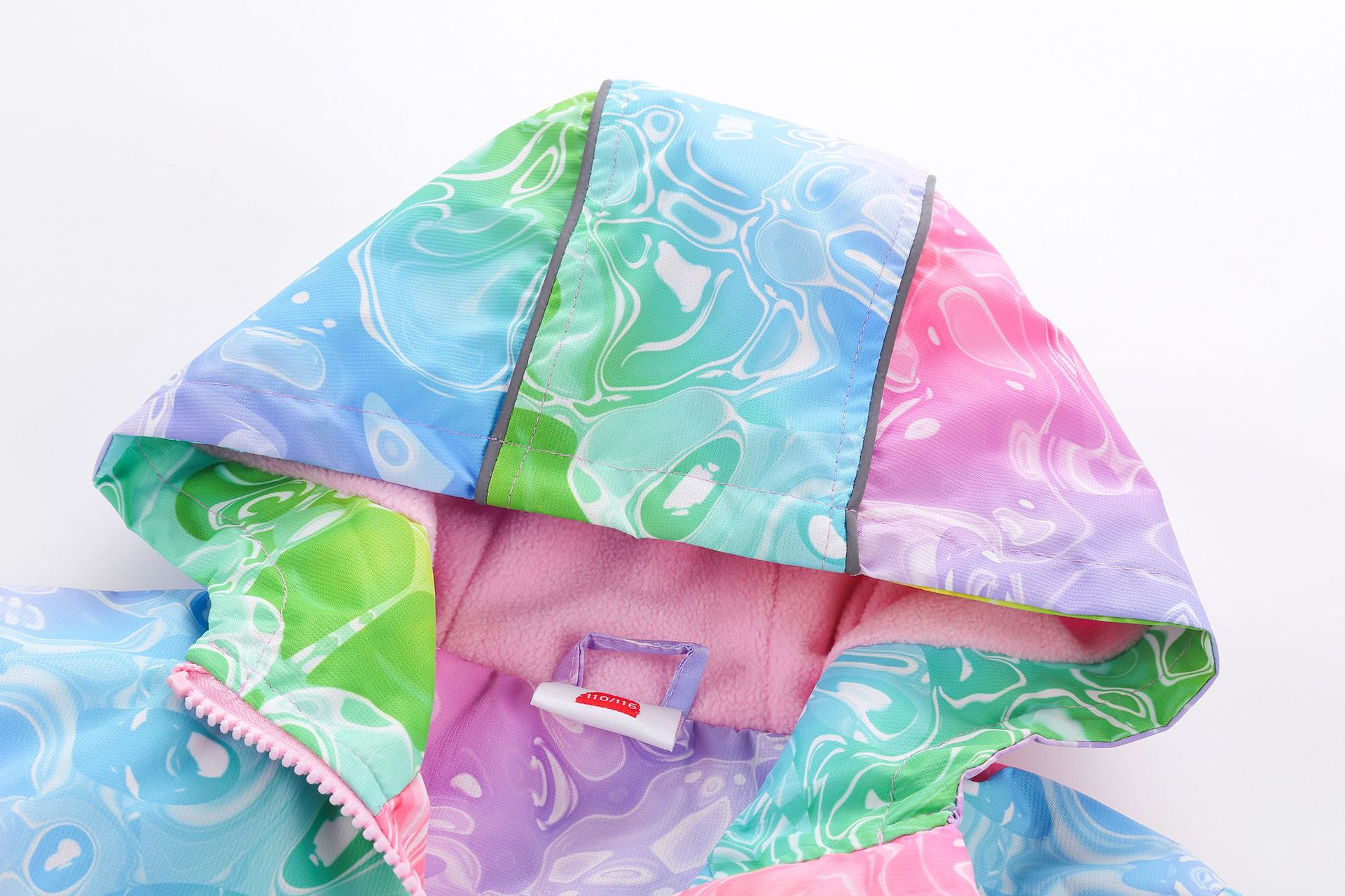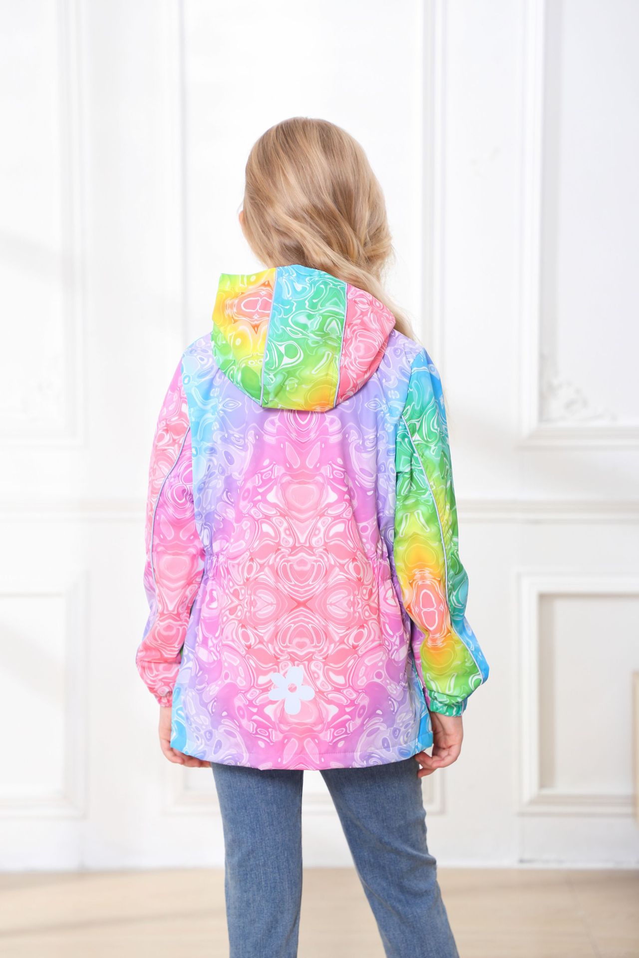 此款风衣很多细节配有安全闪光条,背面是的花朵反光标,袖子也是有反光标。帽子有反光绳。在夜晚非常闪亮,为宝宝夜晚出行安全护航