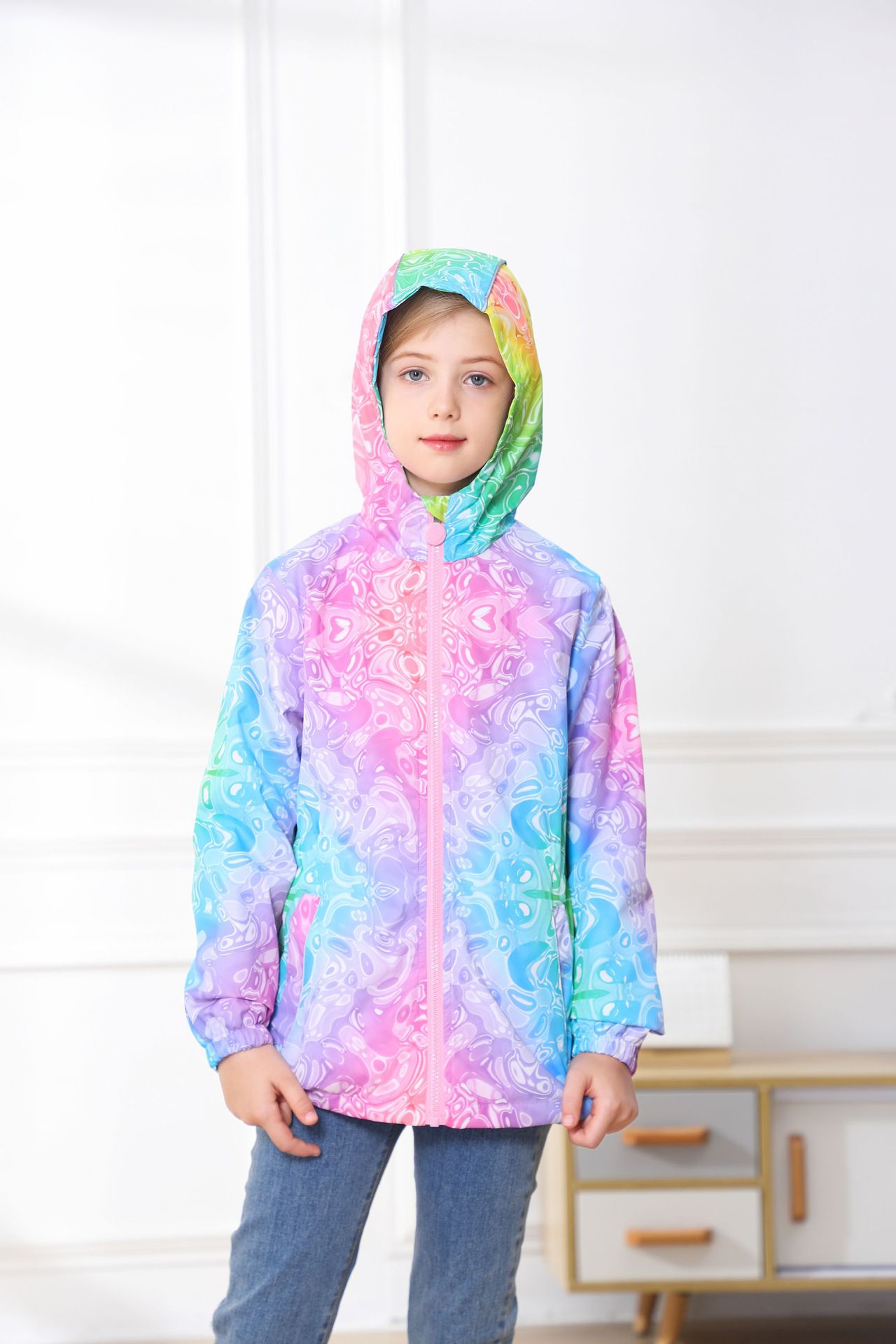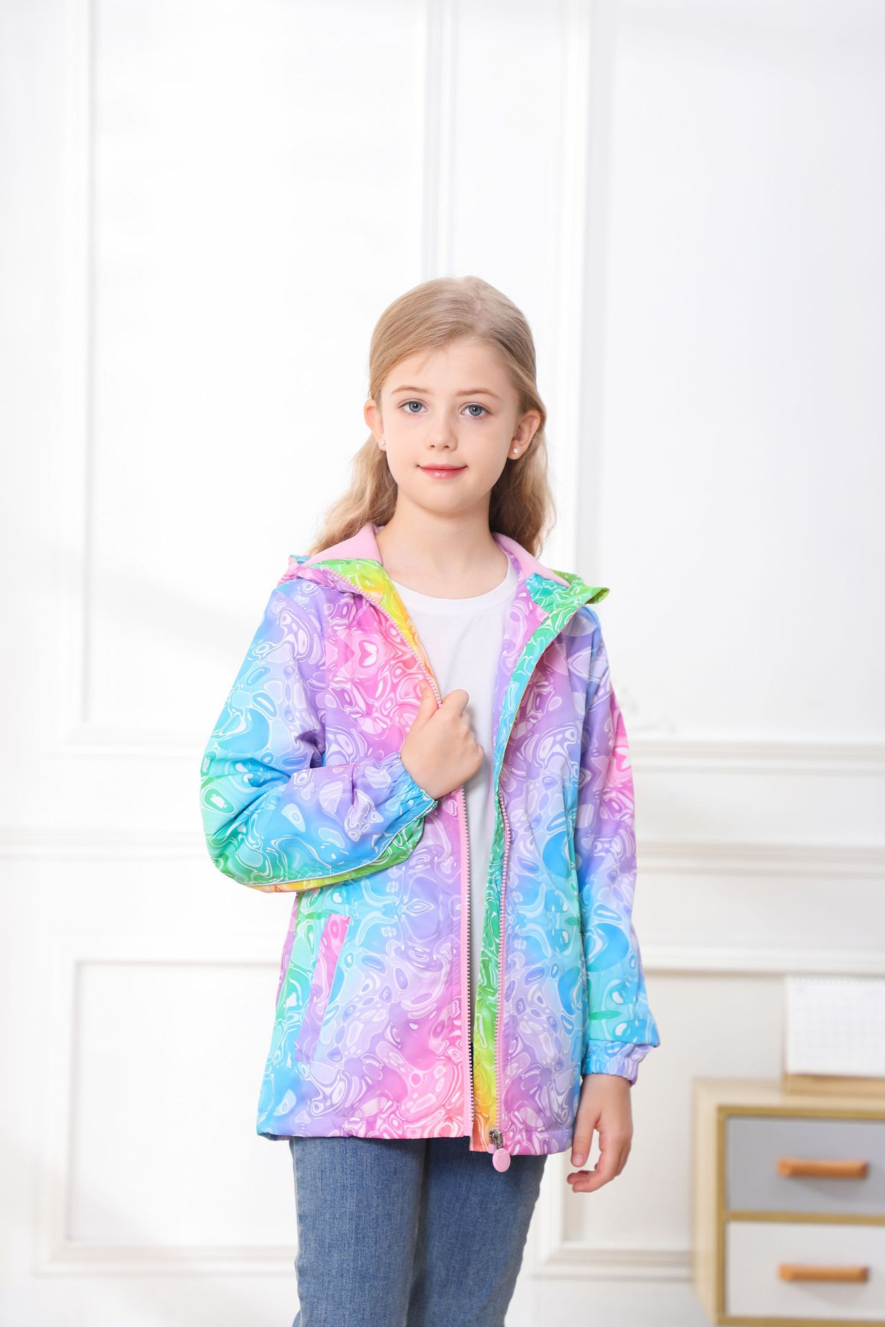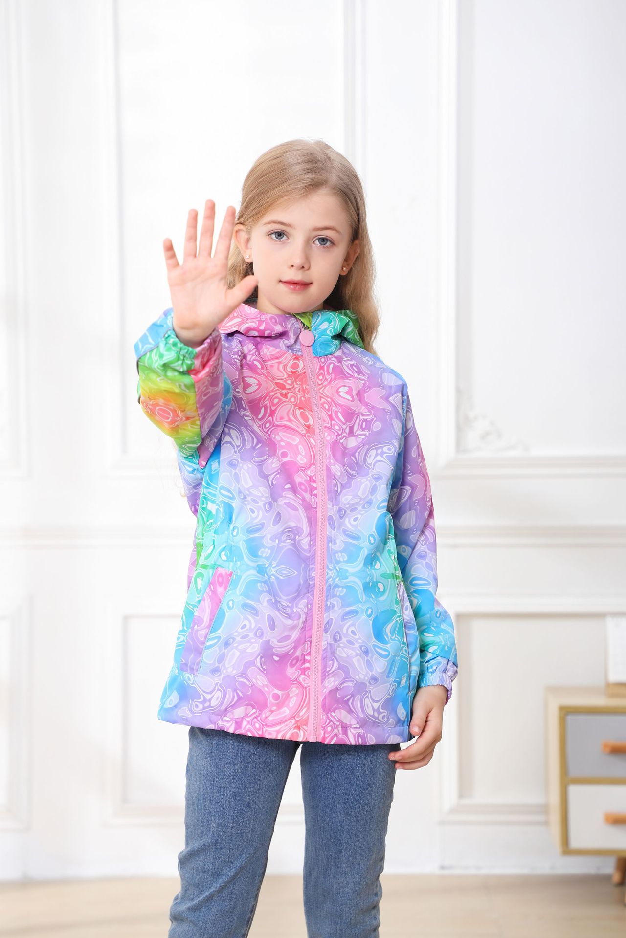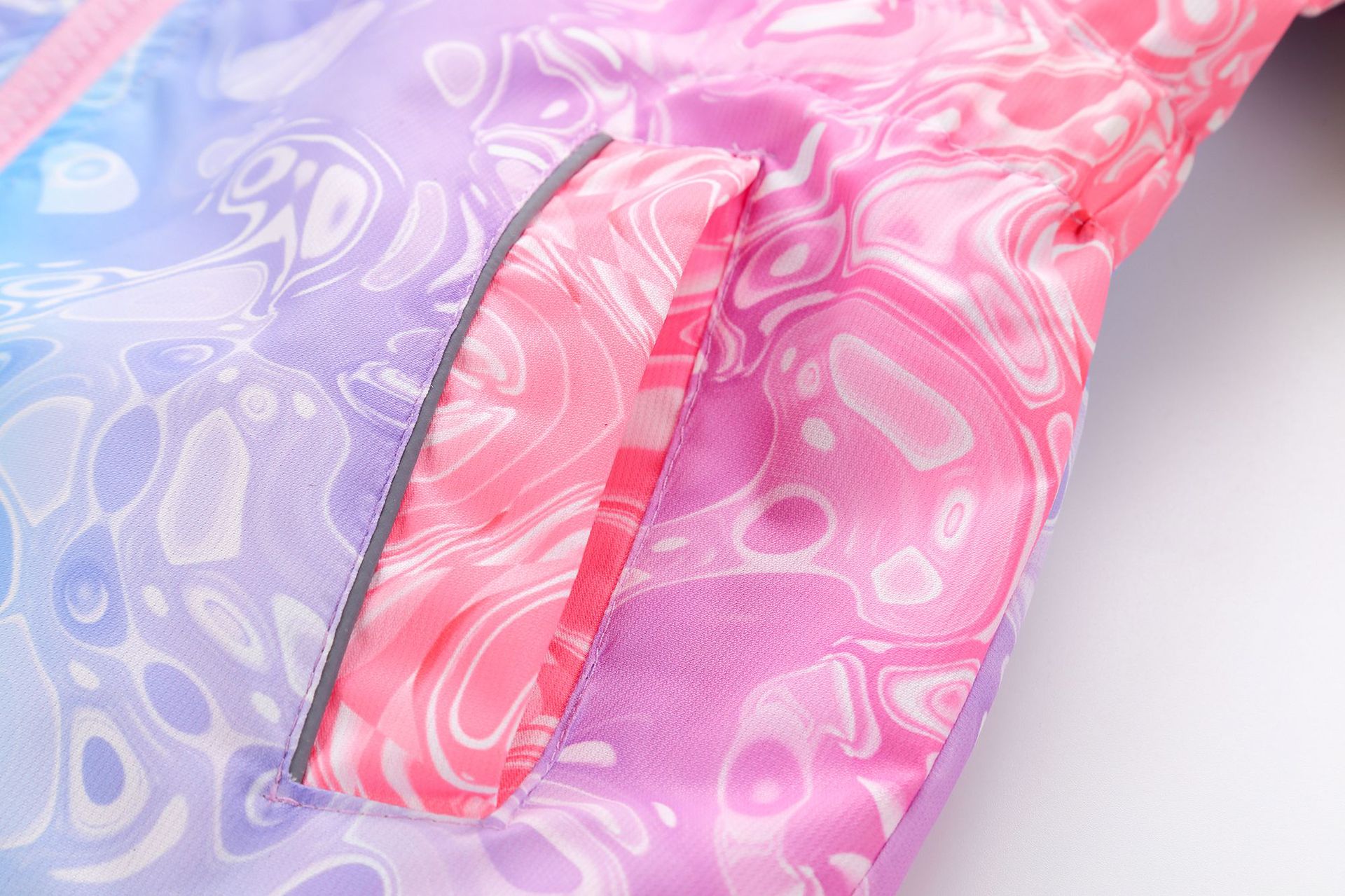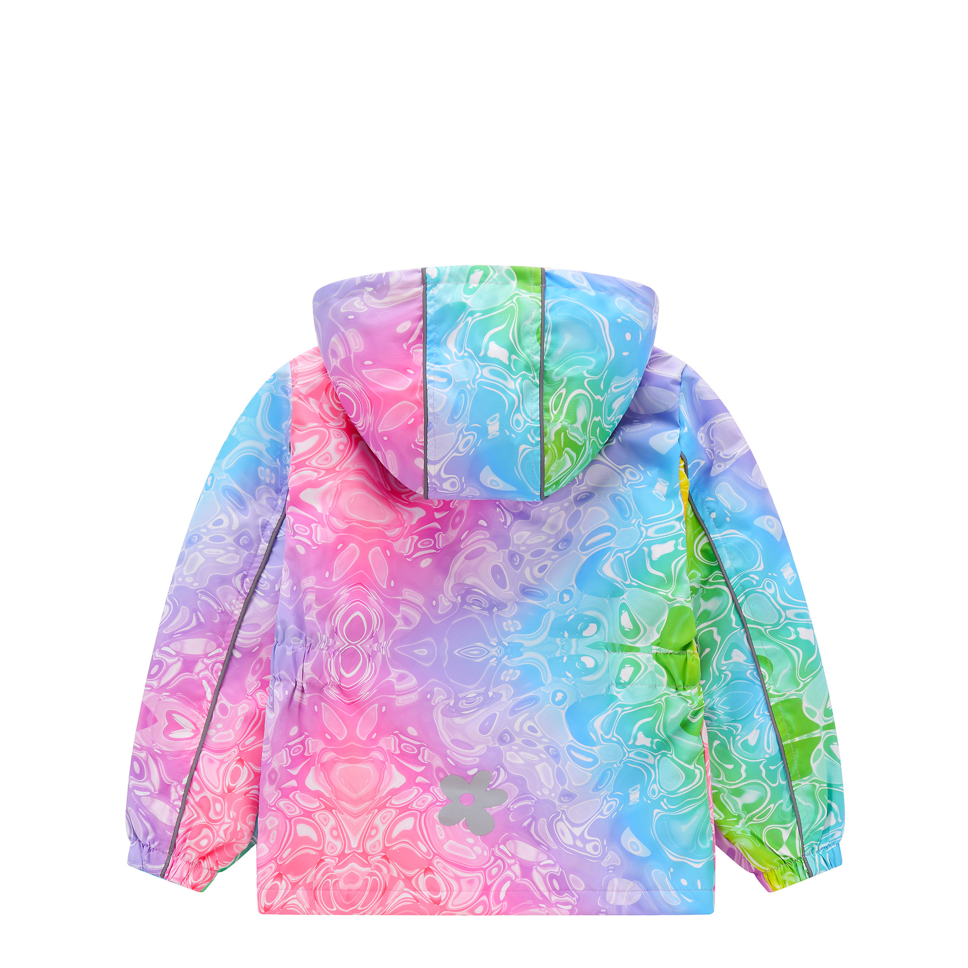 此款风衣很多细节配有安全闪光条,背面是的花朵反光标,袖子也是有反光标。帽子有反光绳。在夜晚非常闪亮,为宝宝夜晚出行安全护航