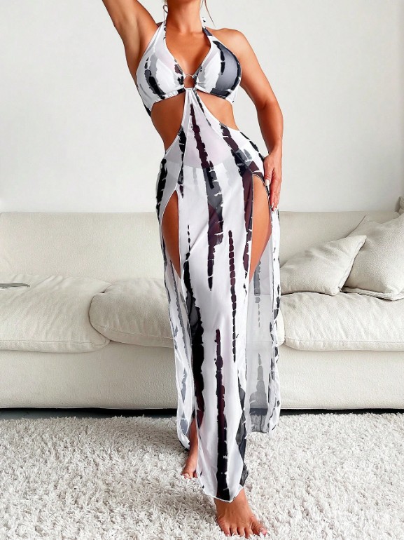 2024 Европейский и американский Новый сетчатый купальник бикини с принтом Купальник из трех частей Женское бикини