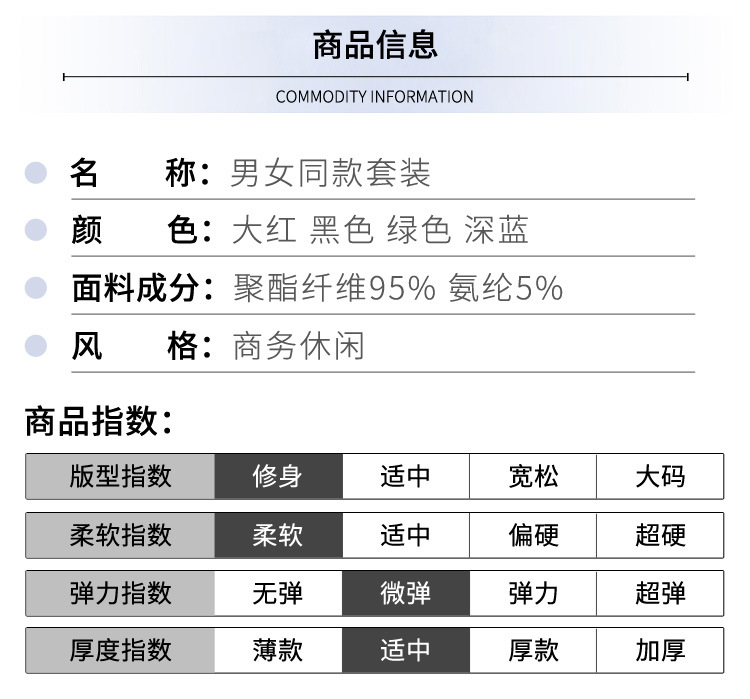 Черная куртка (женская без аксессуаров); Черная куртка (мужская без аксессуаров); Темно-синяя куртка (женская без аксессуаров); Темно-синяя куртка (мужская без аксессуаров); Красная куртка (женская, без аксессуаров); Красная куртка (мужская, без аксессуаров); Черная юбка; Темно синяя юбка; Красная юбка; Черные брюки (женские); Черные брюки (мужские); Темно-синие брюки (женские); Темно-синие брюки (мужчины); Красные брюки (женские); Красные штаны (мужские); Белая рубашка с длинным рукавом (Женская 9622); Белая рубашка с длинным рукавом (Мужская 1622); Зеленая куртка (женская); Зеленая куртка (мужская); Зеленая юбка (женская); Зеленые брюки (женские); Зеленые брюки (мужские)