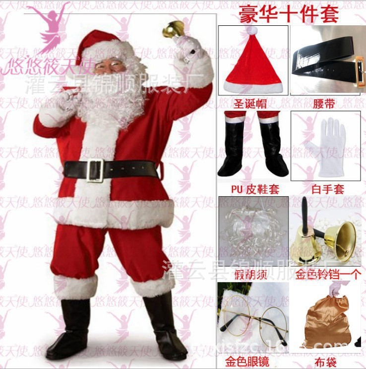 1 набор из пяти предметов Санта-Клауса; 1 комплект из шести предметов Санта-Клауса — чехол для ботинок; 1 комплект из семи предметов Санта-Клауса — сапоги + перчатки.; 1 комплект из восьми предметов Санта-Клауса: чехол для ботинок+перчатки+красный мешочек для конфет; 1 комплект из девяти предметов Санта-Клауса: сапоги + перчатки + красный мешок для конфет + парик.; 1 комплект из десяти предметов Санта-Клауса — бахилы + перчатки + красный мешочек для конфет + парик + колокольчик; 1 набор из одиннадцати предметов Санта-Клауса — бахилы + перчатки + красный мешочек для конфет + парик + колокольчик + очки; 1 Набор из 11 предметов «Санта-Клаус» — накладки на ботинки + перчатки + золотой мешок для сладостей + парик + колокольчик + очки; парик Санты; Очки Санты; золотой колокольчик; сумка для конфет красная; белые короткие перчатки; сапоги Санты; сумка для конфет золото