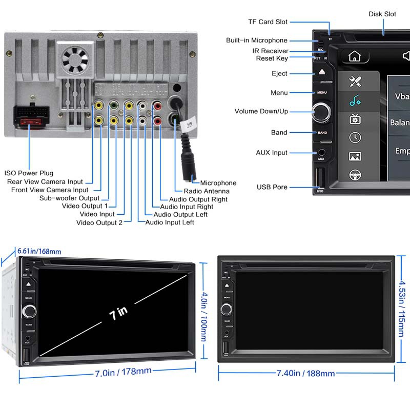 【车载套件】双音收音机标准尺寸:7英寸(178mm*99mm),车载立体声可以满足大多数汽车的需求搭配(不适用于24V卡车)。(注意:在订购之前,请确认您的仪表板开口尺寸是否合适。如果您发现我们的汽车立体声尺寸不符合您的仪表盘尺寸,请购买合适的仪表板套件或在安装立体声时修改仪表板)。