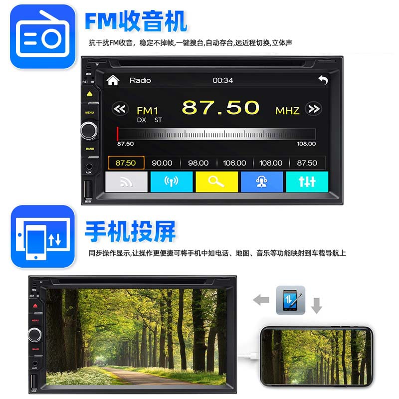 【镜像链接功能和高清触摸屏】双音车载立体声兼容所有android和iOS手机的镜像链接功能,通过手机的原始USB线,可以同步到车载屏幕,并享受地图、电影等功能。触摸屏车载音响搭载7英寸高清电容触摸屏,更灵敏准确,支持1080P视频播放视觉体验。