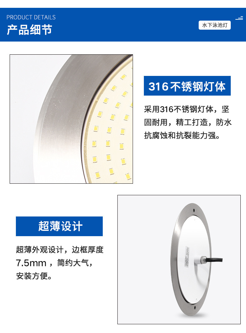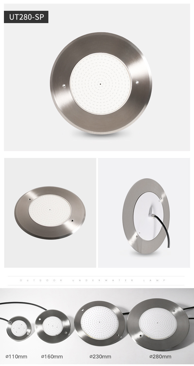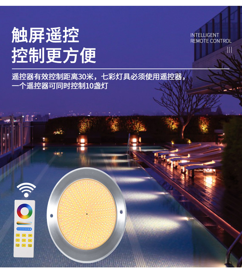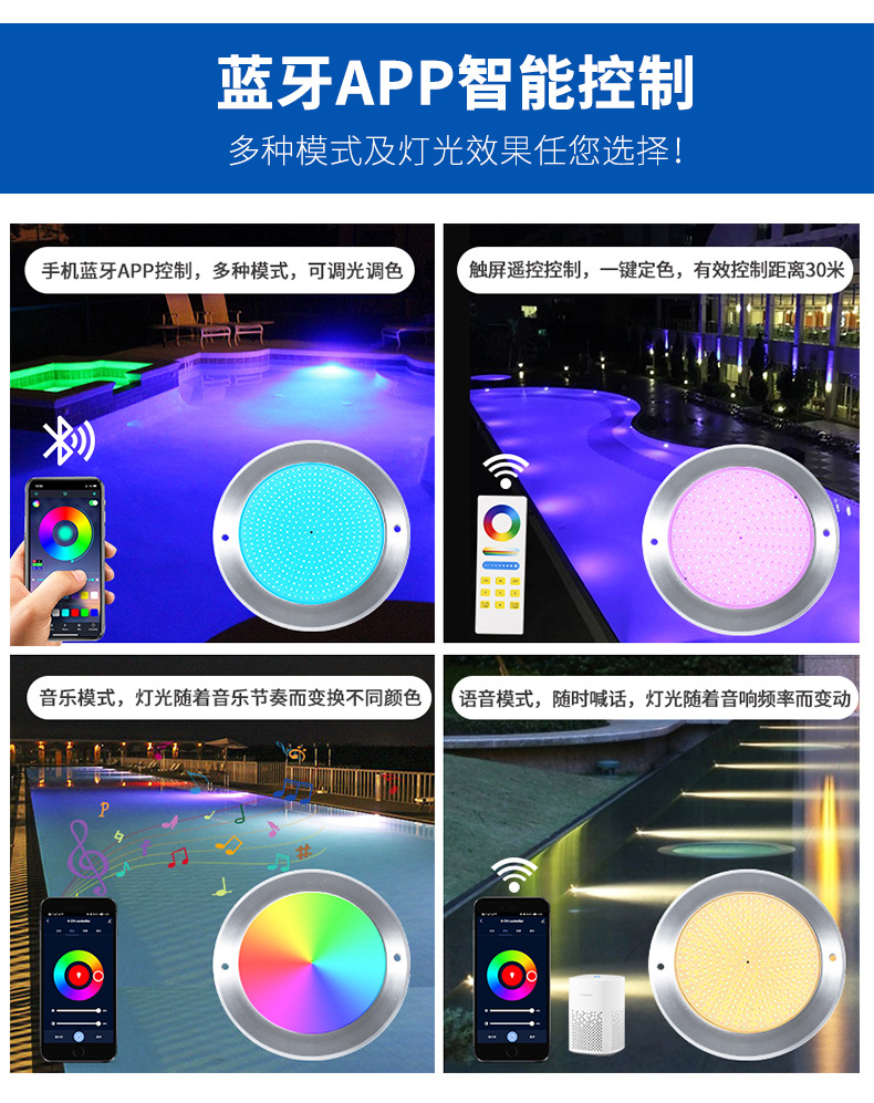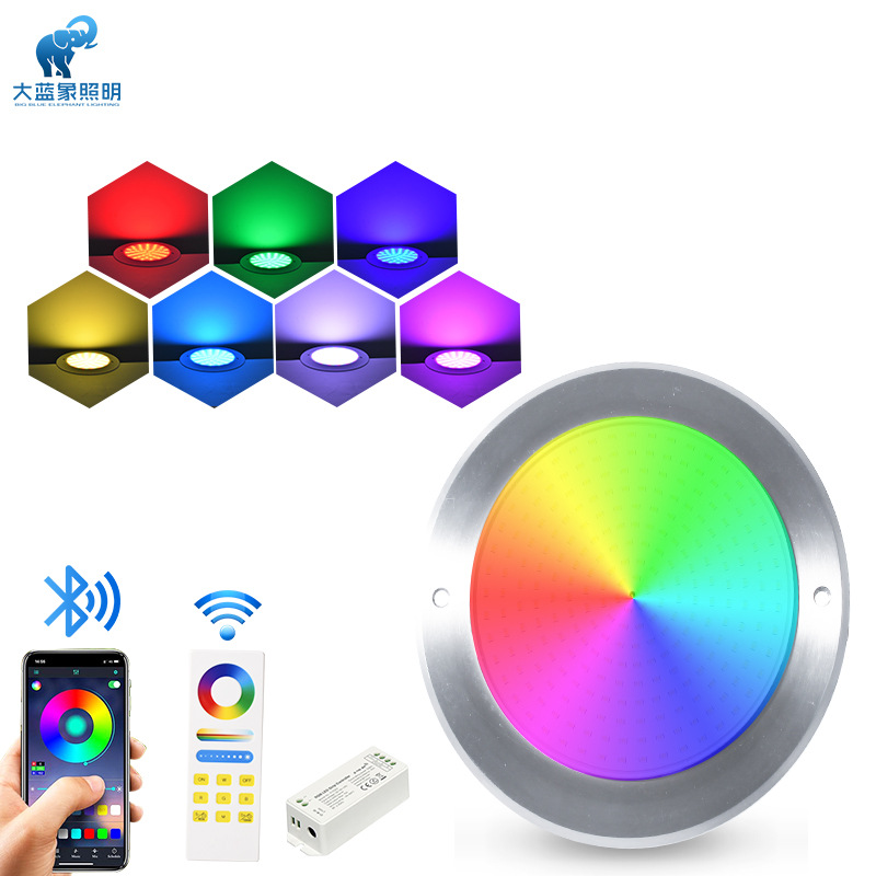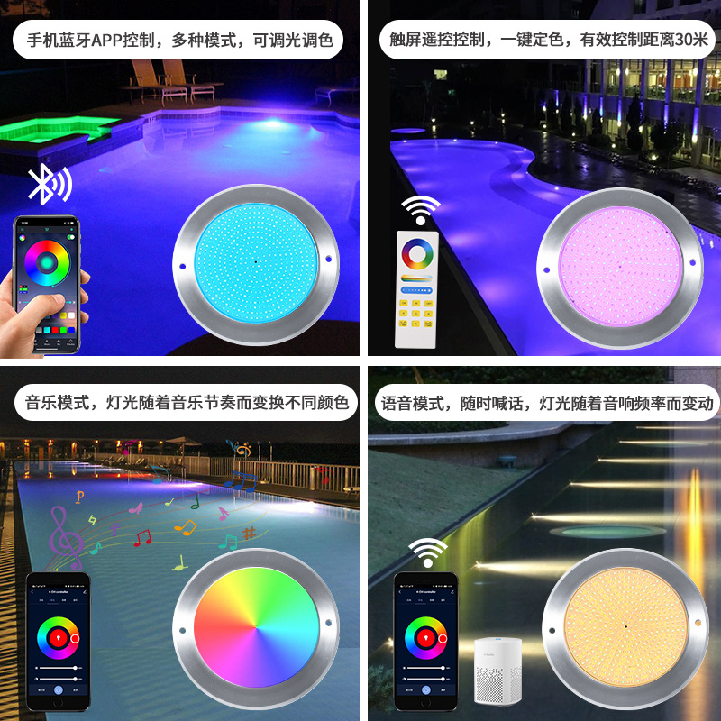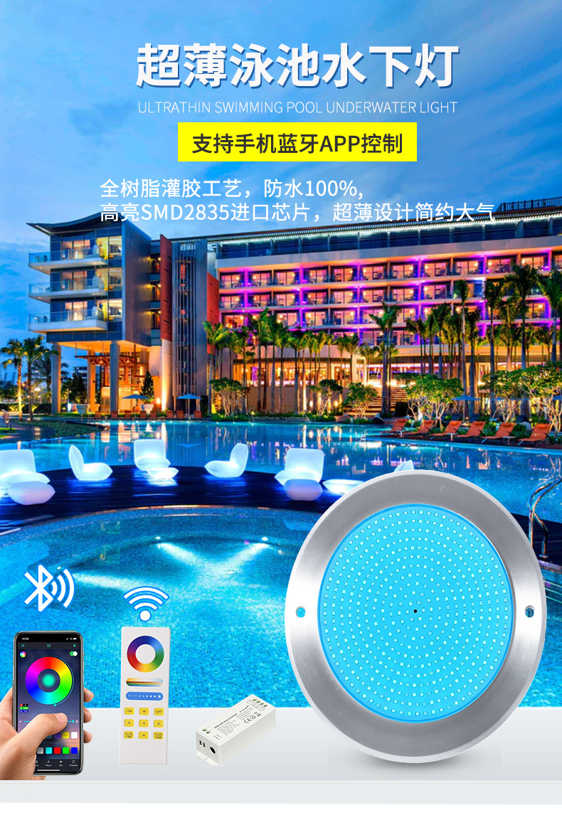 Подводный светильник для бассейнов из нержавеющей стали 316, ультратонкий, полностью герметичный с клеевым покрытием, с беспроводным управлением через мобильное приложение.