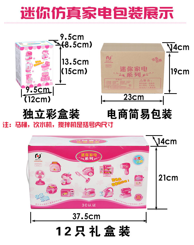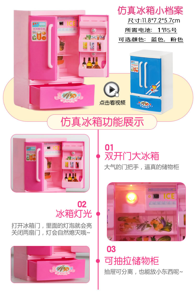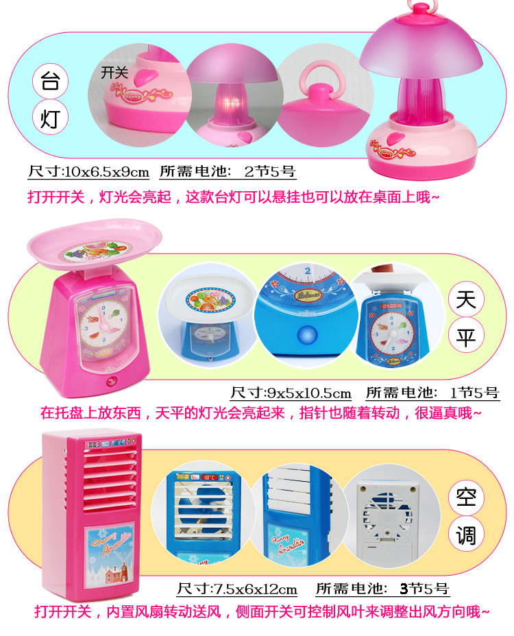 Электрический холодильник — розовый (с подсветкой, дверца открывается); Электрическая стиральная машина — розовая (можно добавлять воду для слива); Электрическая соковыжималка — розовая (можно включить, добавив воду); Электрическая швейная машина — розовая (швейная головка подвижная); Электрический утюг — розовый (с подсветкой и вращающимся пенным роликом); Электрический пылесос — розовый (с подсветкой и вращающимся поролоновым валиком); Электрическая хлебопечка — розовая (с подсветкой, хлеб может выдвигаться); Электрическая настольная лампа — розовая (свет включен); Электрический баланс — розовый (поворот стрелки); Электрический фонарик — розовый (включено); Электрический фен для волос — розовый (с функцией обдува воздухом); Электрический вентилятор — розовый (может дуть воздухом); Электрическая рисоварка – розовая (функция поджаривания курицы с подсветкой); Электрическая микроволновая печь – розовая (открывающаяся дверца, вращающаяся решетка для курицы); Электрическая мясорубка — розовая (с вращающимся механизмом); Электрический кондиционер — розовый (может обдувать воздух); Электрический телефон — розовый (с звуковыми эффектами); Электрический дозатор воды — розовый (можно включить подсветку для подачи воды); Электрический унитаз — розовый (с внутренней системой смыва); Электрический холодильник — синий (с подсветкой, дверца открывается); Электрическая стиральная машина — синяя (можно добавлять воду для слива); Электрическая соковыжималка — синяя (может работать при добавлении воды); Электрический пылесос — синий (с подсветкой и вращающимся поролоновым валиком); Электрическая хлебопечка — синяя (с подсветкой, хлеб может выдвигаться); Электрический вентилятор - синий (с воздушным потоком); Электрическая рисоварка – синяя (функция подсветки для жарки курицы); Электрическая микроволновая печь — синяя (открывающаяся дверь, вращающаяся решетка для курицы); Электрическая мясорубка — синяя (с поворотным механизмом); Электрический кондиционер — синий (может обдувать воздух); Электрический фен для волос — синий (с функцией обдува воздухом); Электрический диспенсер для воды — синий (можно включить подсветку для подачи воды); Электрическая настольная лампа — синяя (включена); Электрический фонарик — синий (включено); Электрическая швейная машина — синяя (швейная головка подвижная); Электрический миксер — синий (с подсветкой, можно перемешивать); Электрический телефон — синий (с звуковыми эффектами)