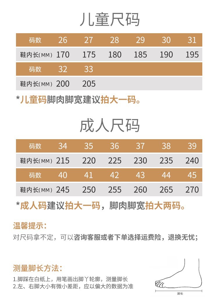 成人尺码建议按照平常穿的标准尺码加一码脚宽脚胖可以加2码,小孩子可以参考标准尺码脚胖嘟嘟也可以加1码,仅供参考!