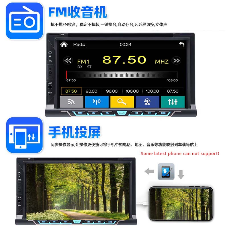 【汽车音响尺寸】:这是一款通用型双 din 汽车音响。尺寸:7.01" X 3.94" X 6.26",订购前请检查是否与您汽车的原装安装槽相匹配。如果您想安装,有些汽车需要购买仪表盘套件和线束。汽车音响的线路有点复杂,每种颜色连接不同的功能,请对照我们的图片或安装手册/视频耐心安装。