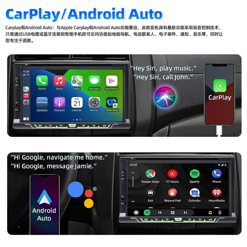 【兼容 Apple Carplay 和 Android Auto】:这款双耳收音机兼容 Apple CarPlay 和 Android Auto 功能,它采用了新的语音控制技术,只需与您的智能手机连接,就可以访问地图导航、电话联系人、电子邮件、通知、音乐等,同时您还可以专注于路况。