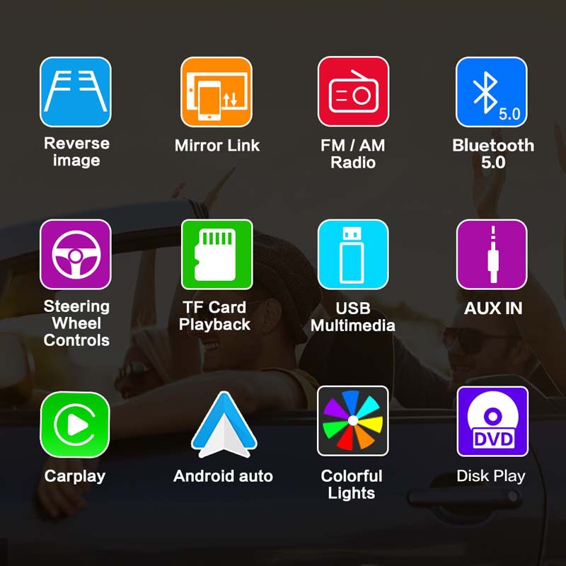 【Phone Mirror Link】:这款车载收音机支持 Android/ iPhone Mirror Link,通过手机原装 USB 线缆,可以同步到车载屏幕,并享受地图、电影等功能,CarPlay 或 Android Auto 不支持的某些应用程序仍可通过此选项显示。