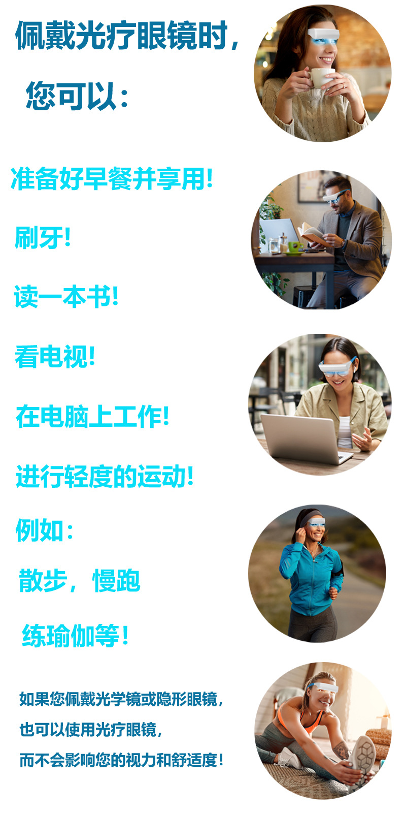 借助光疗眼镜,您将能够在保持活动的同时进行光疗,并且光疗不会受到限制。因此,您将有更好的机会感受到光对您的能量水平和睡眠质量的积极影响。