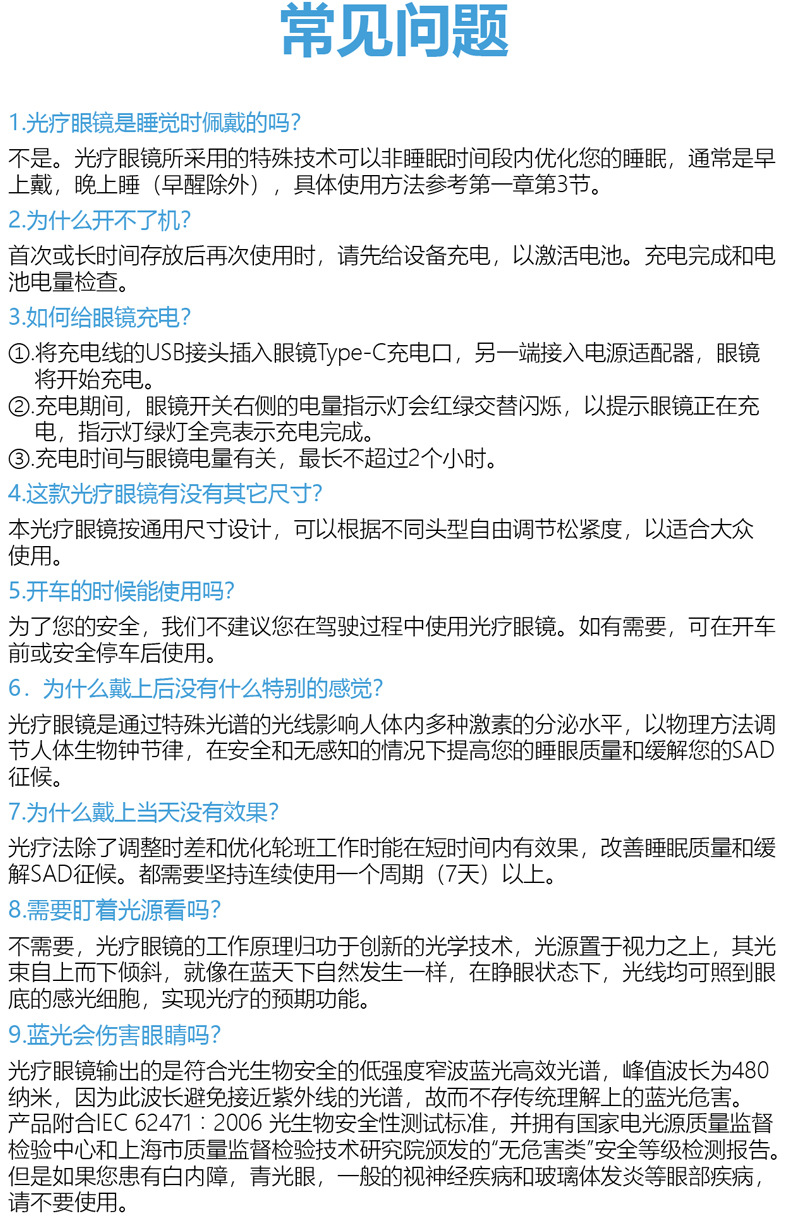 研究表明不同人群对蓝光或白光的剌激更为敏感,本款光疗眼镜采用双光双模设计,可以先尝试一种模式几天,再切换另一种模式,从而选择更符合您个人体质的模式。