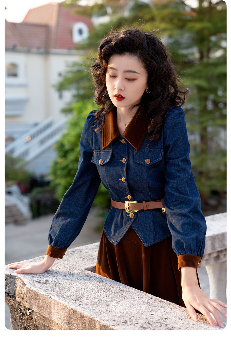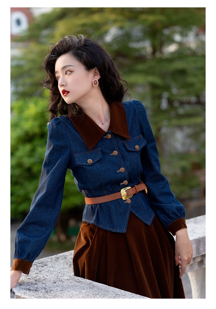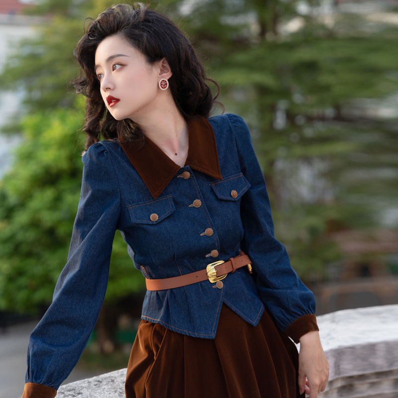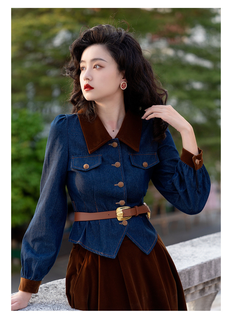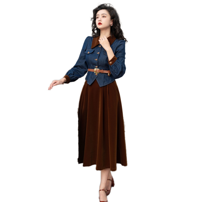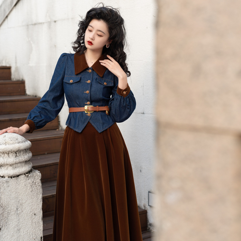 Новинка осени/зимы 2024: винтажный женский комплект в стиле французского ретро — джинсовый топ + бархатная юбка