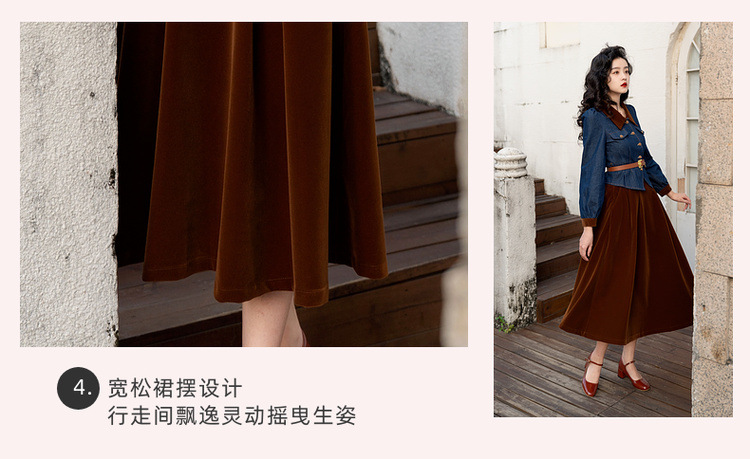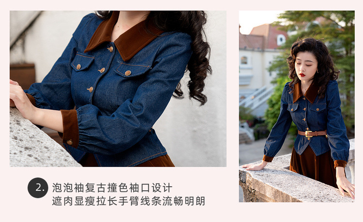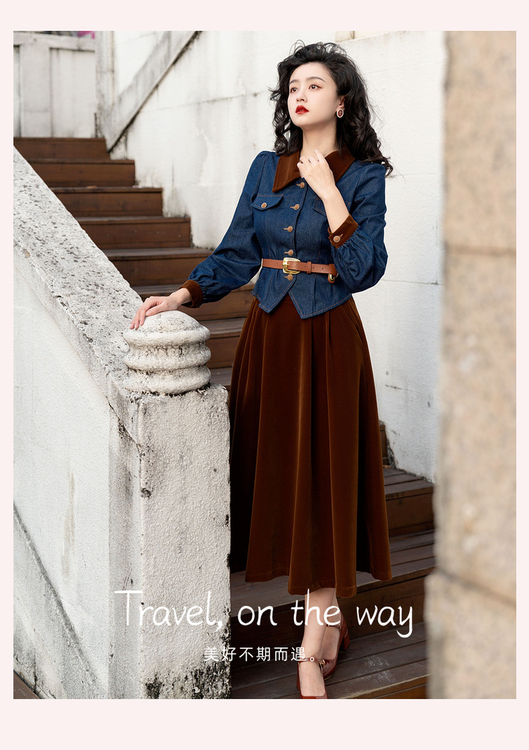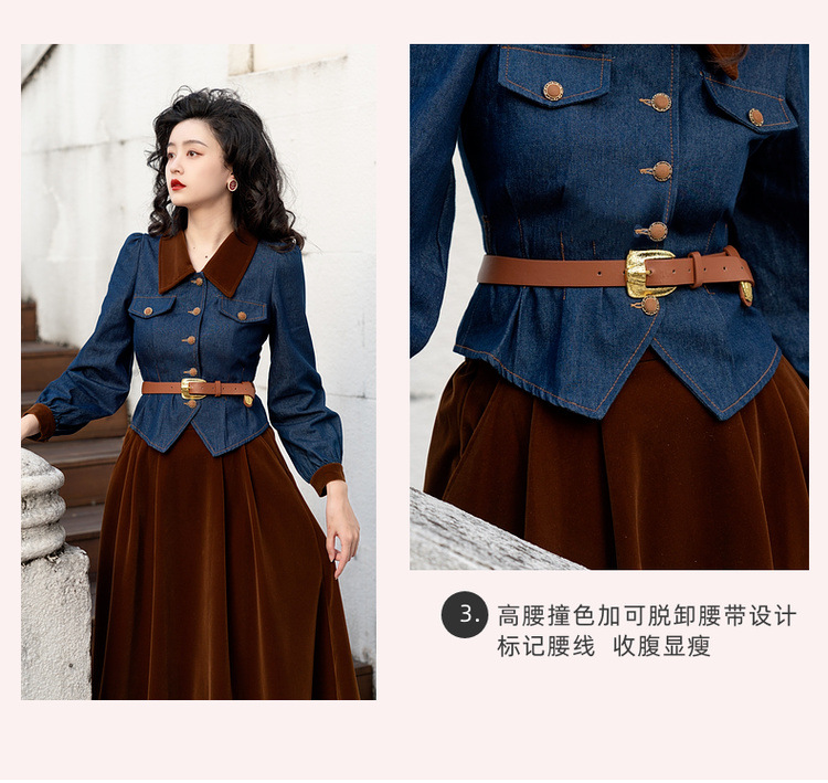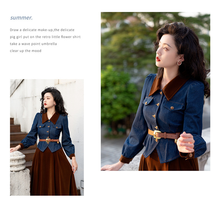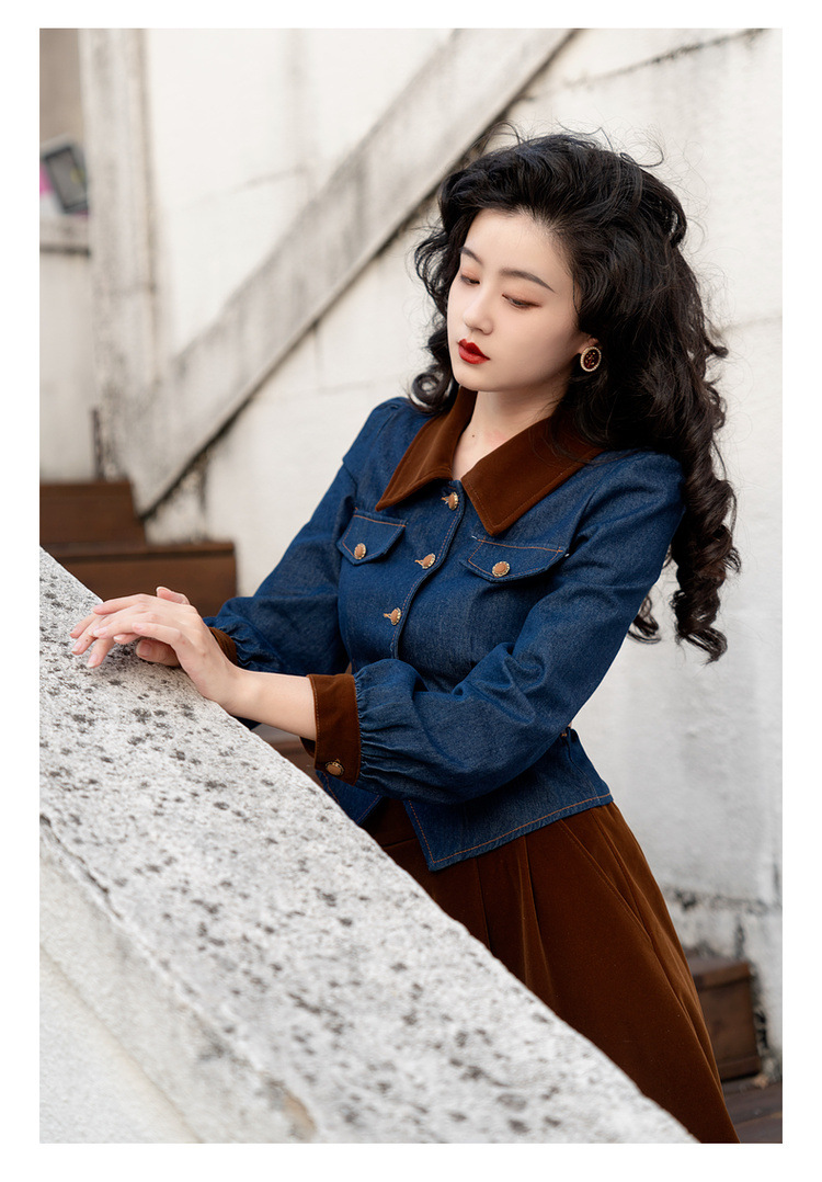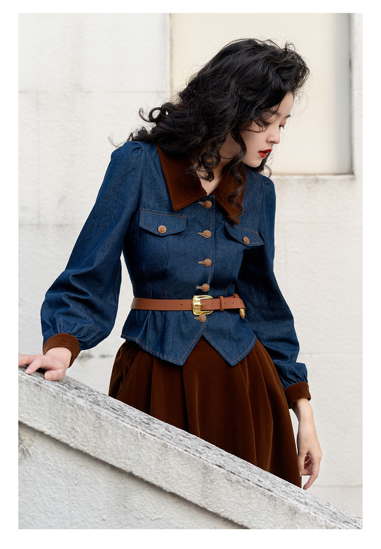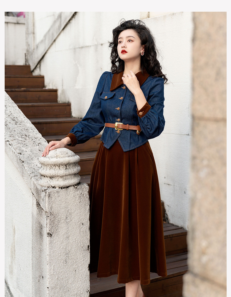 Новинка осени/зимы 2024: винтажный женский комплект в стиле французского ретро — джинсовый топ + бархатная юбка