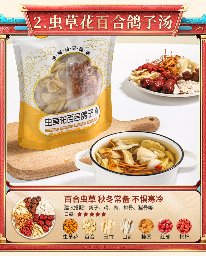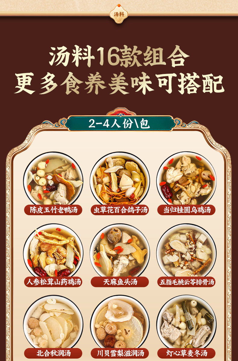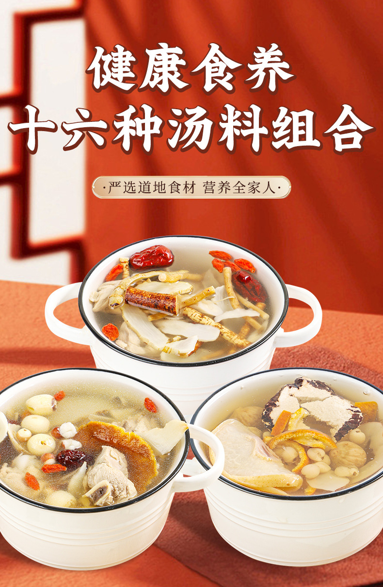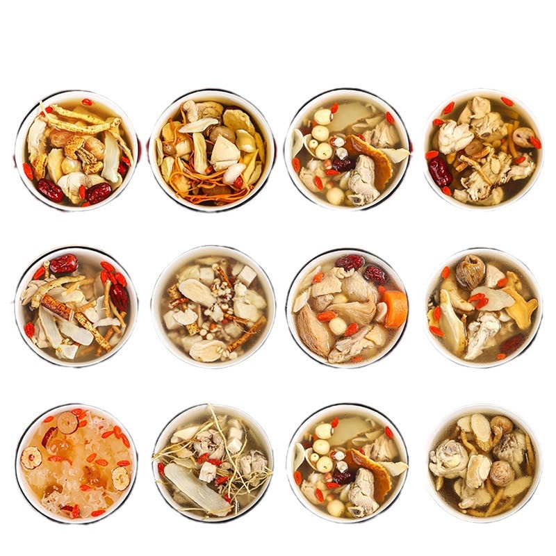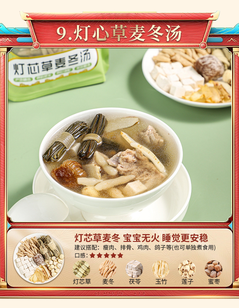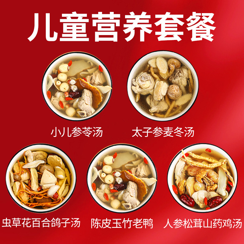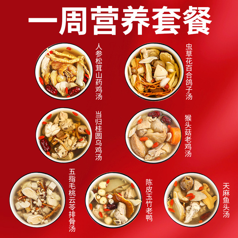 Кордицепс цветок лилии голубиный суп [Суп вкусный]; Женьшень Мацутаке Ям Куриный суп [Питательное питание]; Анжелика Лонган черный куриный суп [Женский постоянный]; Чэнь Пи Юйчжу старый утиный суп; Обезьяньий гриб ямс семена лотоса старый куриный суп [Уход за пивом]; Суп из ребер Maotao Yunling с пятью пальцами [Пиво хорошо для сырости]; Куриный суп с пятью пальцами Maotao Yam 2-4 порции [сладкий и вкусный]; Суп из рыбьей головы Тяньма Чуан Суп на 2-4 человека; Ян Ян Цао Астрагал суп Юньлин [ложиться спать поздно]; Персиковый шелух ласточки; Суп из семян лотоса; Ниу Дали Черная фасоль Суп Eucommon 2 раза/пакет; Увлажняющий суп Chuanbei Sydney [Увлажняющий осенью и зимой]; Суп Beihe Qiurun 2 раза; Тигровый молочный суп из морского дна кокосового ореха; Детский суп Shenling 2 раза [ребенок часто пьет]; Суп из фишки с принцем женьшенем [Рост ребенка]; Американский женьшень, лонган, суп из лилии и голубя [Вкусный и питательный]; Пория, ямс и суп «Четыре бога» [классический суп]