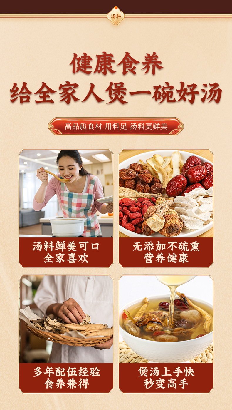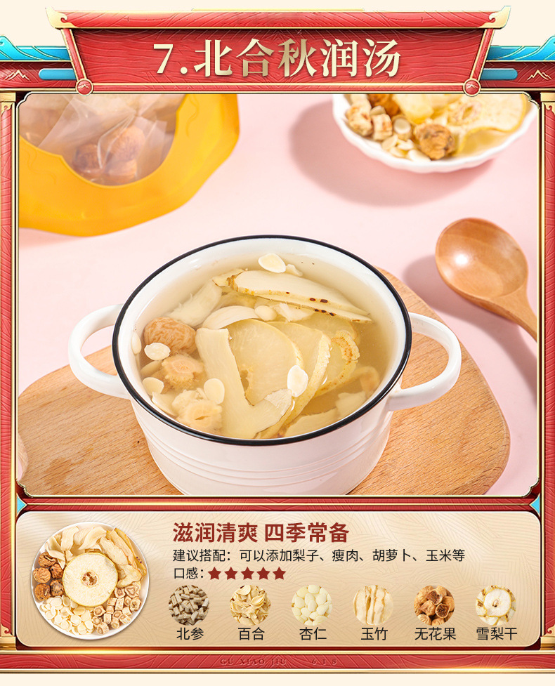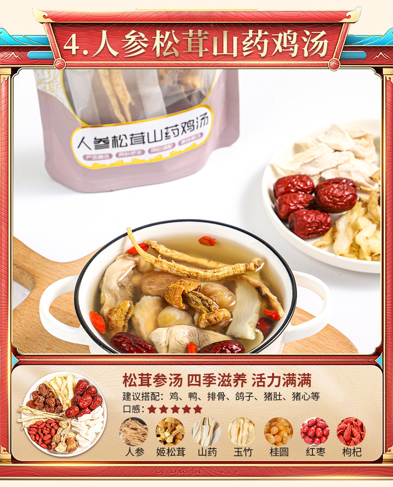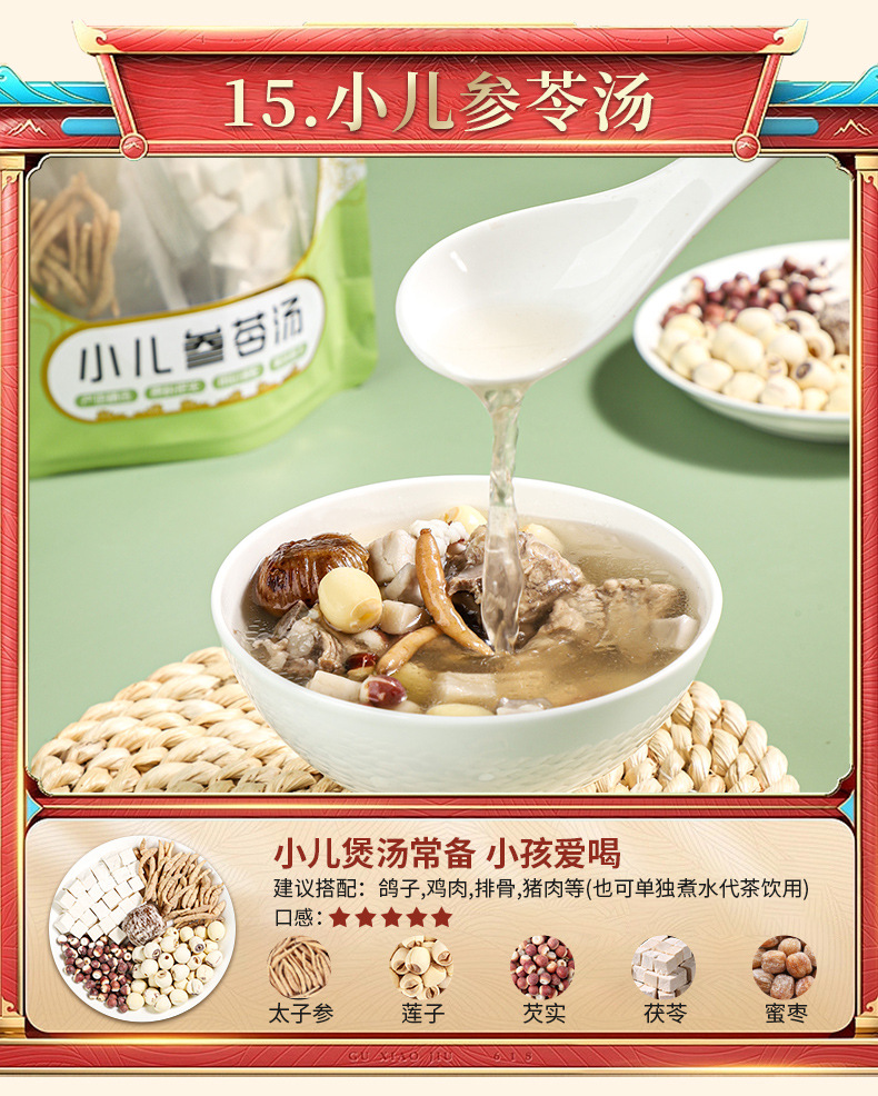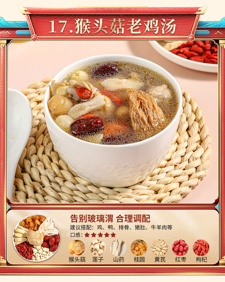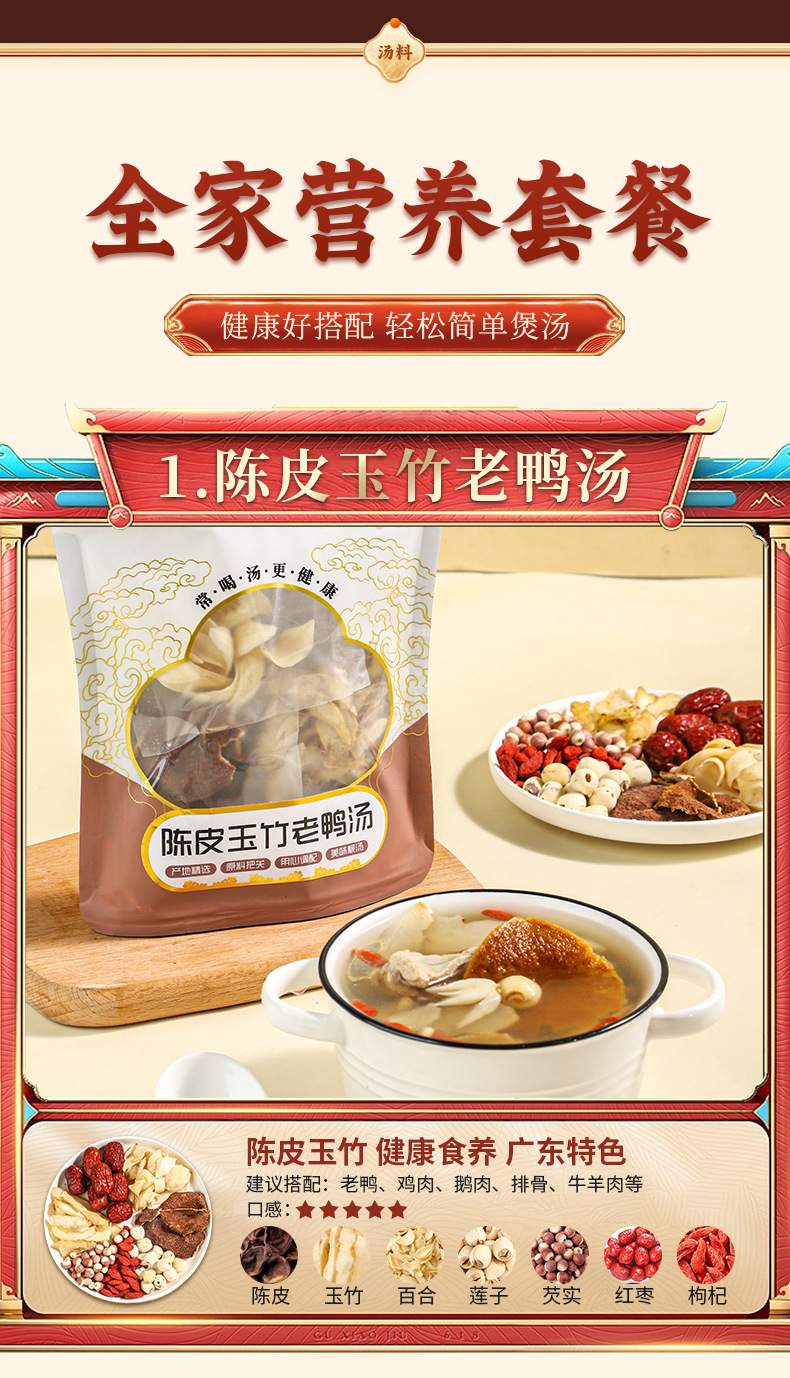 Кордицепс цветок лилии голубиный суп [Суп вкусный]; Женьшень Мацутаке Ям Куриный суп [Питательное питание]; Анжелика Лонган черный куриный суп [Женский постоянный]; Чэнь Пи Юйчжу старый утиный суп; Обезьяньий гриб ямс семена лотоса старый куриный суп [Уход за пивом]; Суп из ребер Maotao Yunling с пятью пальцами [Пиво хорошо для сырости]; Куриный суп с пятью пальцами Maotao Yam 2-4 порции [сладкий и вкусный]; Суп из рыбьей головы Тяньма Чуан Суп на 2-4 человека; Ян Ян Цао Астрагал суп Юньлин [ложиться спать поздно]; Персиковый шелух ласточки; Суп из семян лотоса; Ниу Дали Черная фасоль Суп Eucommon 2 раза/пакет; Увлажняющий суп Chuanbei Sydney [Увлажняющий осенью и зимой]; Суп Beihe Qiurun 2 раза; Тигровый молочный суп из морского дна кокосового ореха; Детский суп Shenling 2 раза [ребенок часто пьет]; Суп из фишки с принцем женьшенем [Рост ребенка]; Американский женьшень, лонган, суп из лилии и голубя [Вкусный и питательный]; Пория, ямс и суп «Четыре бога» [классический суп]