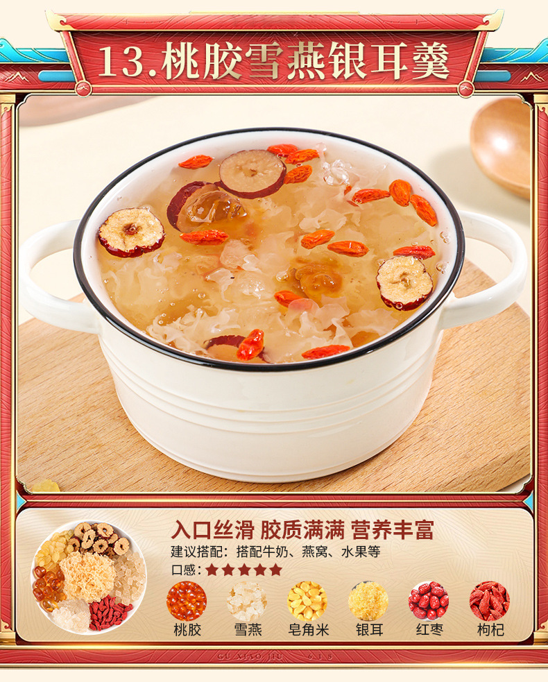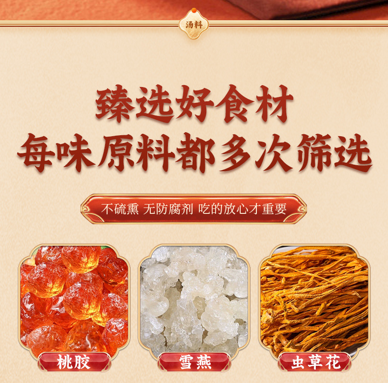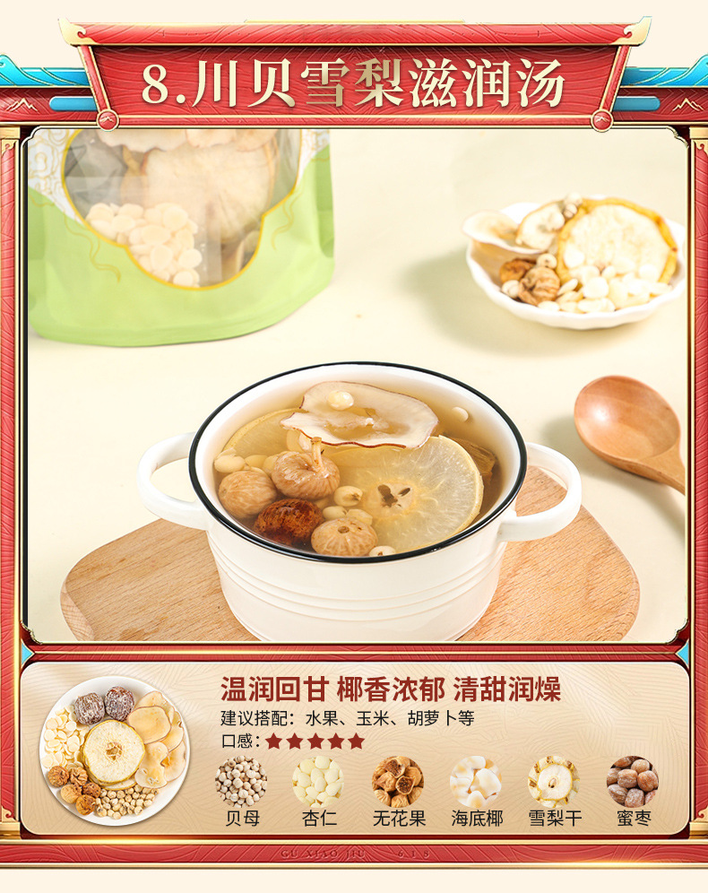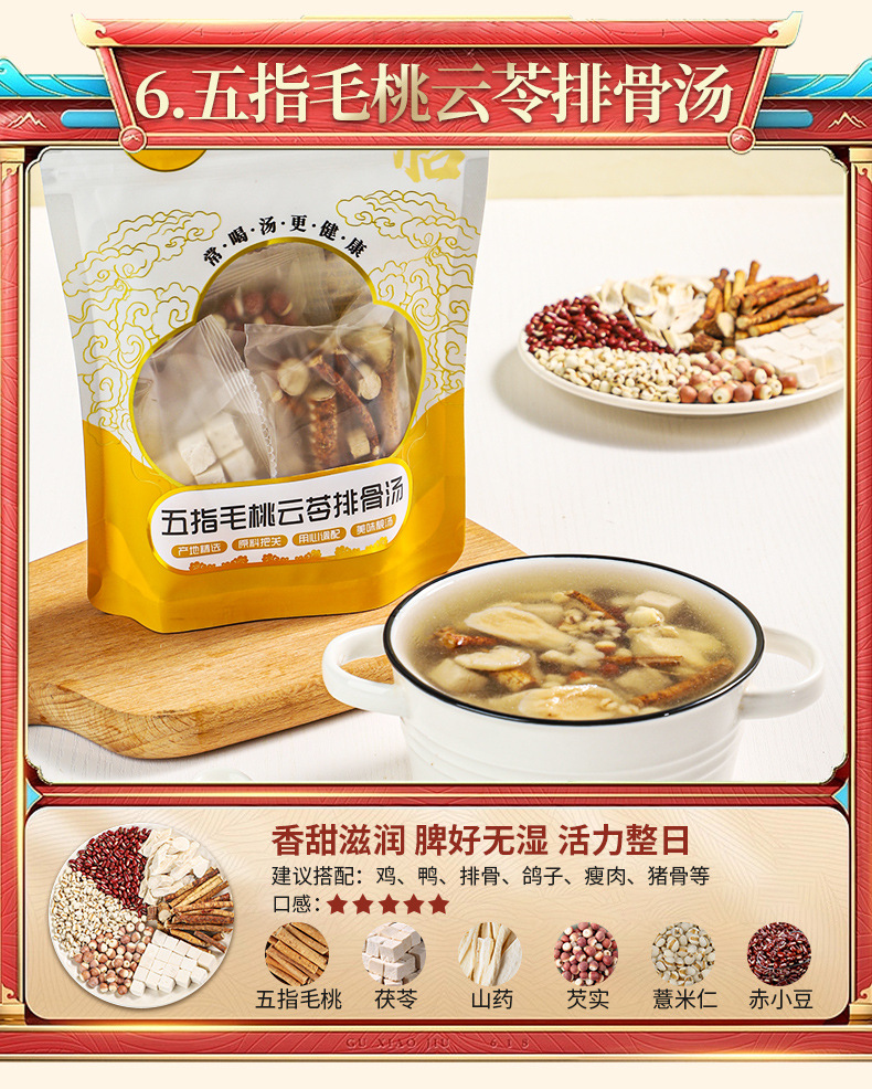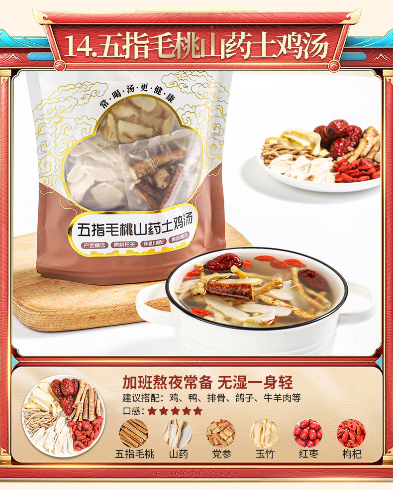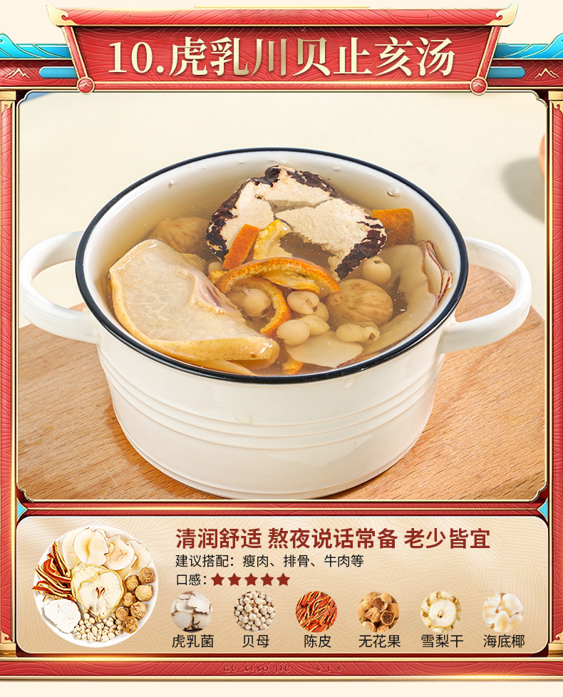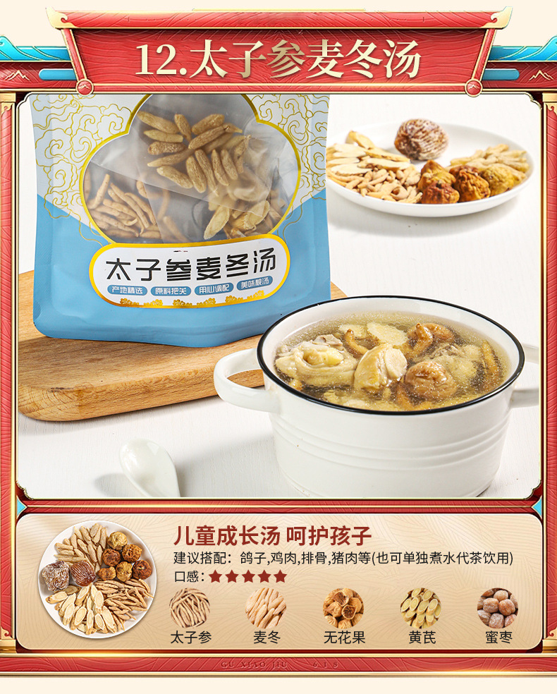 Кордицепс цветок лилии голубиный суп [Суп вкусный]; Женьшень Мацутаке Ям Куриный суп [Питательное питание]; Анжелика Лонган черный куриный суп [Женский постоянный]; Чэнь Пи Юйчжу старый утиный суп; Обезьяньий гриб ямс семена лотоса старый куриный суп [Уход за пивом]; Суп из ребер Maotao Yunling с пятью пальцами [Пиво хорошо для сырости]; Куриный суп с пятью пальцами Maotao Yam 2-4 порции [сладкий и вкусный]; Суп из рыбьей головы Тяньма Чуан Суп на 2-4 человека; Ян Ян Цао Астрагал суп Юньлин [ложиться спать поздно]; Персиковый шелух ласточки; Суп из семян лотоса; Ниу Дали Черная фасоль Суп Eucommon 2 раза/пакет; Увлажняющий суп Chuanbei Sydney [Увлажняющий осенью и зимой]; Суп Beihe Qiurun 2 раза; Тигровый молочный суп из морского дна кокосового ореха; Детский суп Shenling 2 раза [ребенок часто пьет]; Суп из фишки с принцем женьшенем [Рост ребенка]; Американский женьшень, лонган, суп из лилии и голубя [Вкусный и питательный]; Пория, ямс и суп «Четыре бога» [классический суп]