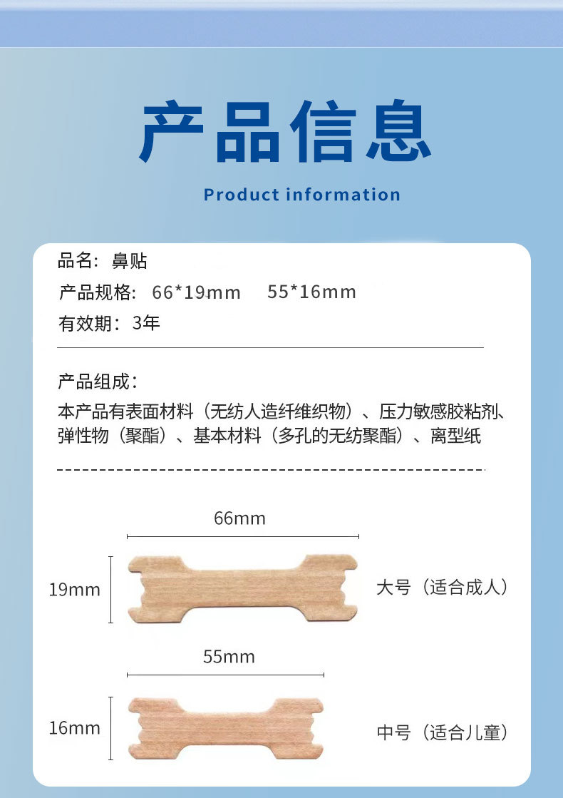 Большой размер 66*19 мм (пластырь для носа HappyBreathe); Маленький размер 55*16 мм (пластырь для носа HappyBreathe)