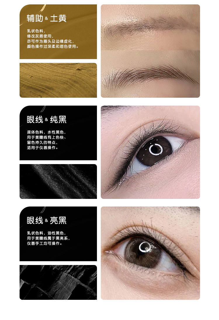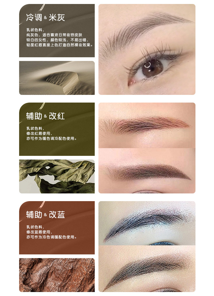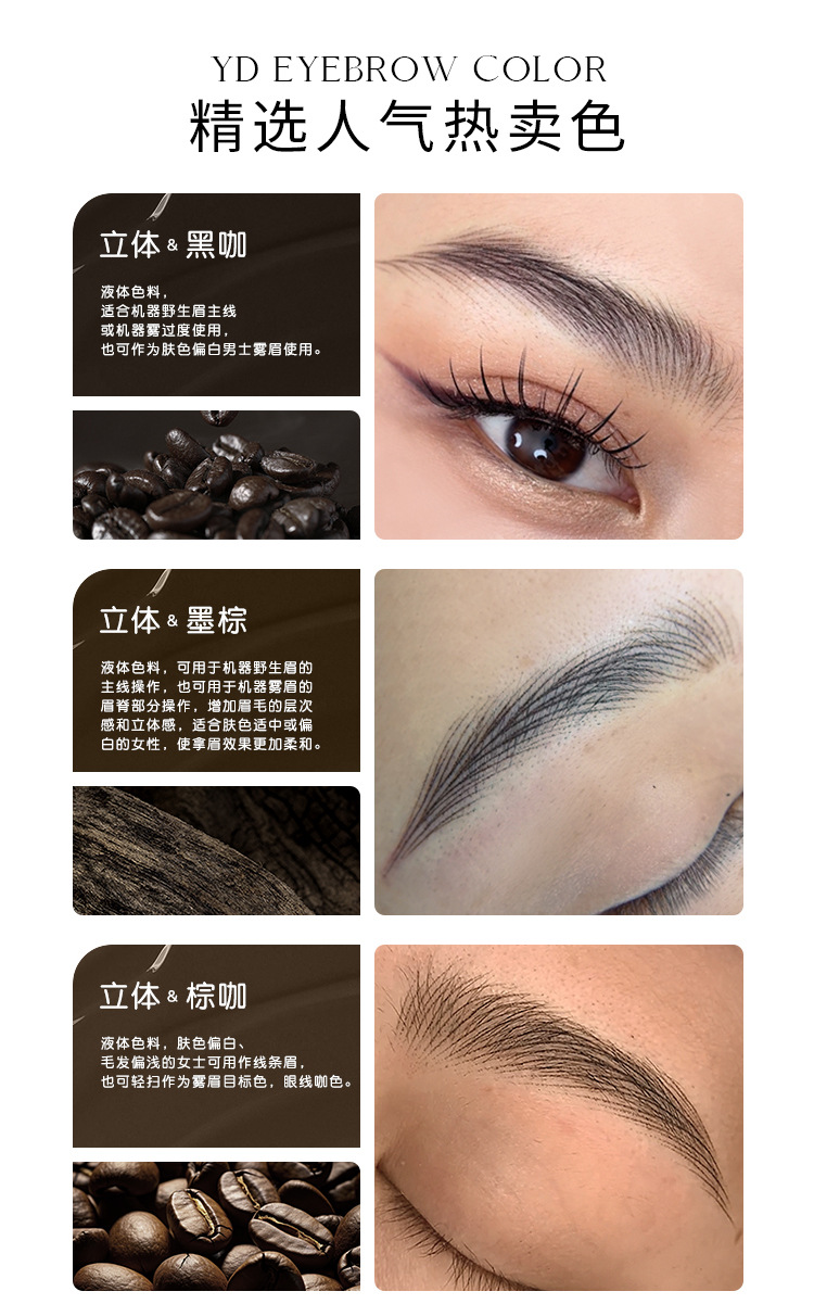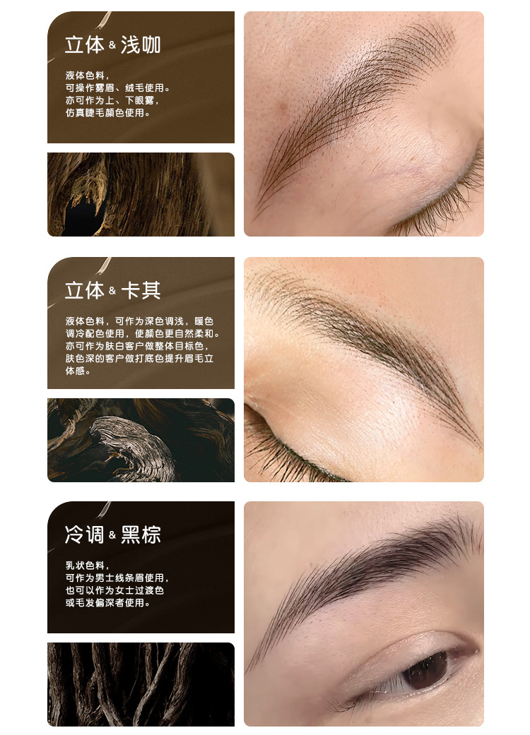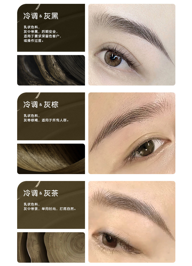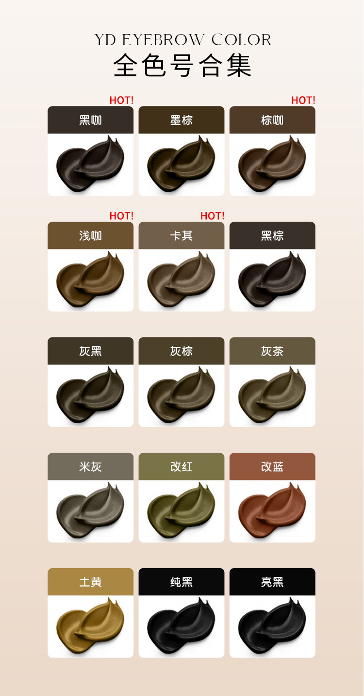 Серо-черный - молочный (темно-коричневый); Серо-коричневый - молочный; Серый чай - молочный; Рисовая зола - молочная; Черно-коричневый - молочный; Черный кофе-жидкость; Темно-коричневая жидкость; Коричневая кофейная жидкость; Легкая кофейная жидкость; хаки-жидкий; Темная кофейная жидкость; Обсидиановый коричневый-жидкость; Темно-коричневая жидкость; Теплая коричневая жидкость; Изменить красные брови - молочные; Изменить синие брови - молочные; Землисто-желтый – молочный; (Подводка для глаз) ярко-черный - молочный; (Подводка для глаз) Pure Black-liquid