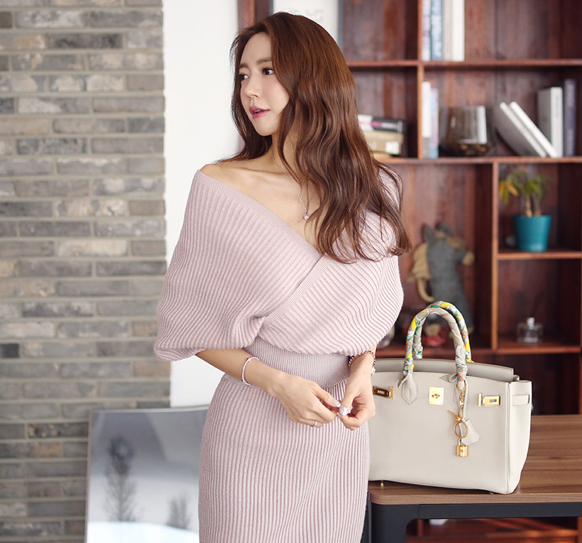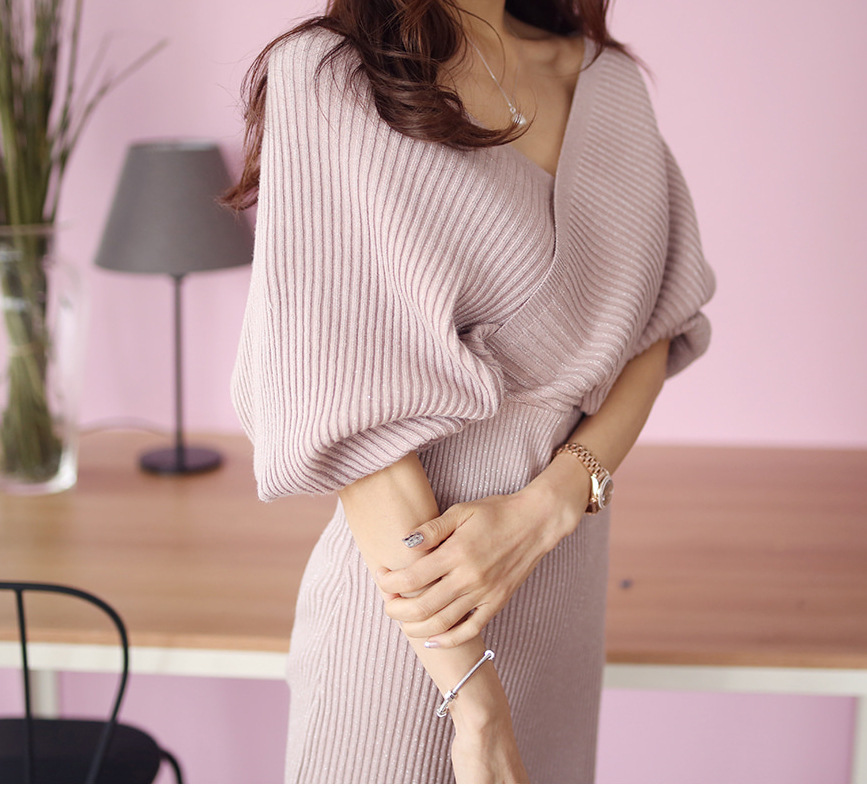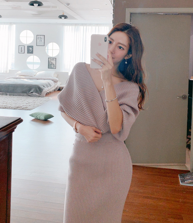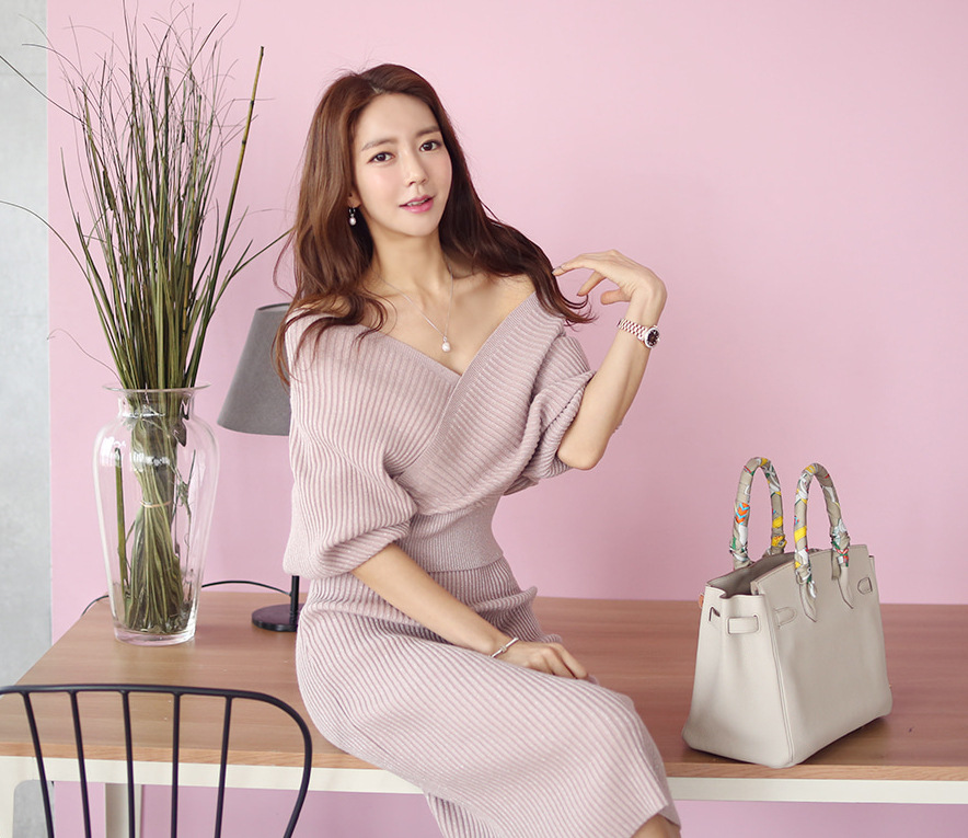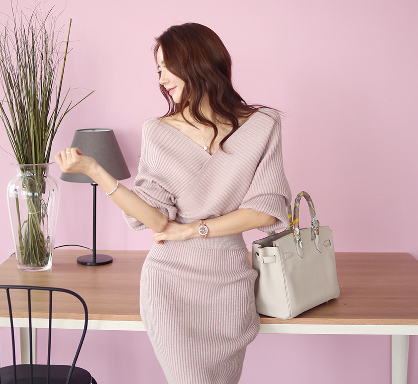 Женская одежда для внешней торговли 2023 Корейский Стиль Осень-зима Новый сексуальный Вязаный топ с глубоким V-образным вырезом и рукавами «летучая мышь» + юбка-футляр миди