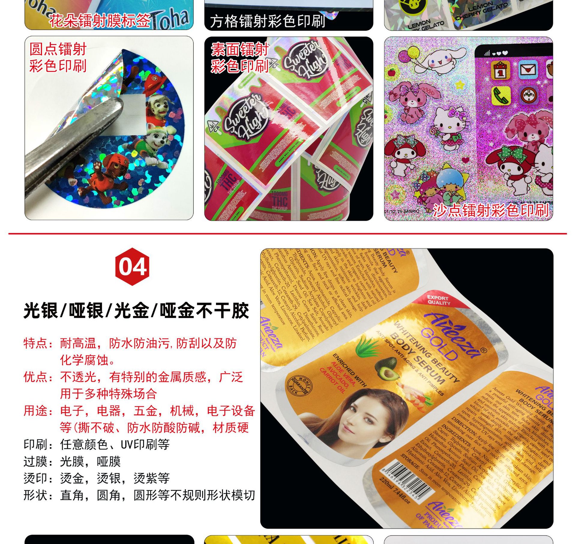 Лазер-настраиваемый; Электростатическая наклейка-настраиваемый; Прозрачная клейкая блестящая пленка-может быть настроена; Прозрачная самоклеенная пленка-может быть настроена; АБР самоклеящий-настраиваемый; Светящийся-настраиваемый; PP синтетическая бумага-настраиваемый; Матрасное серебро-настраиваемый; Яркий серебристый клей-настраиваемый; Бумага для ногтей-настраиваемая; Медный лист бумаги субпленка-может быть настроен; Бумага с покрытием яркая пленка-может быть настроена; Большой красный посыпать золотом-можно настроить; Лазерные лазерные этикетки-на заказ