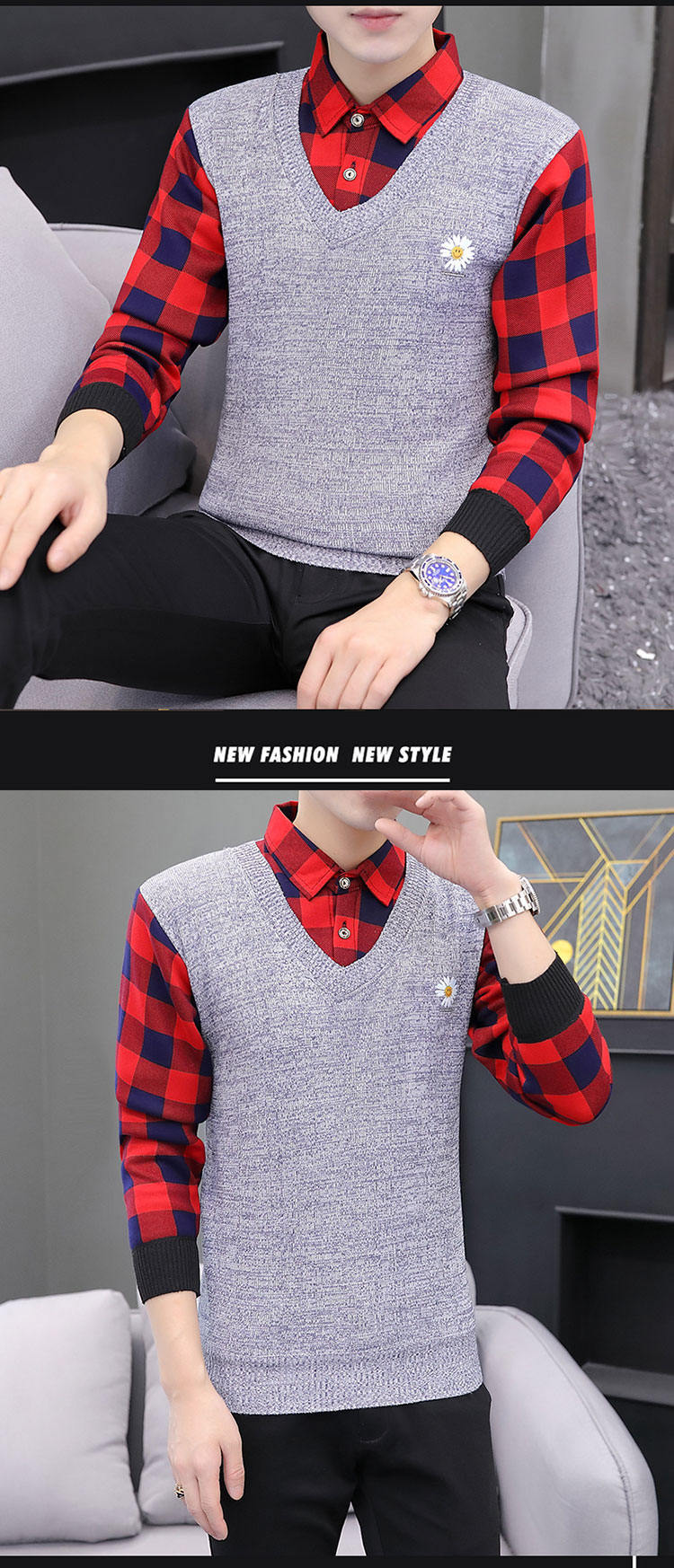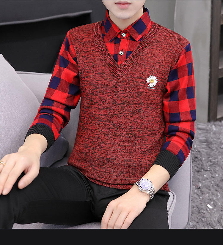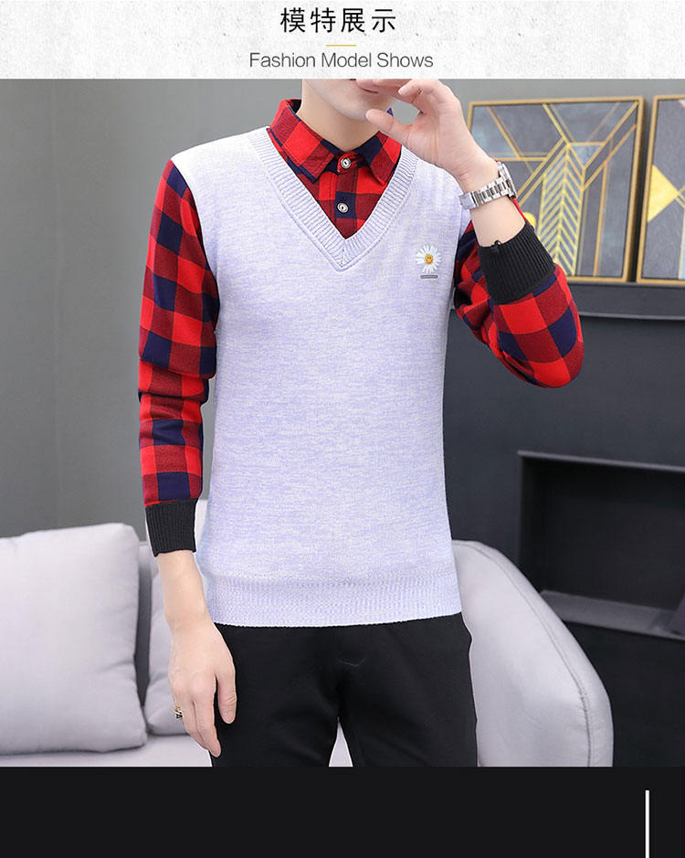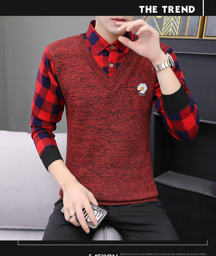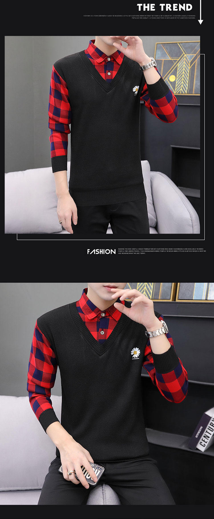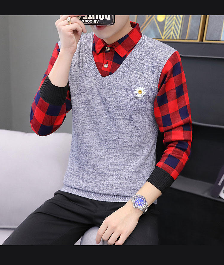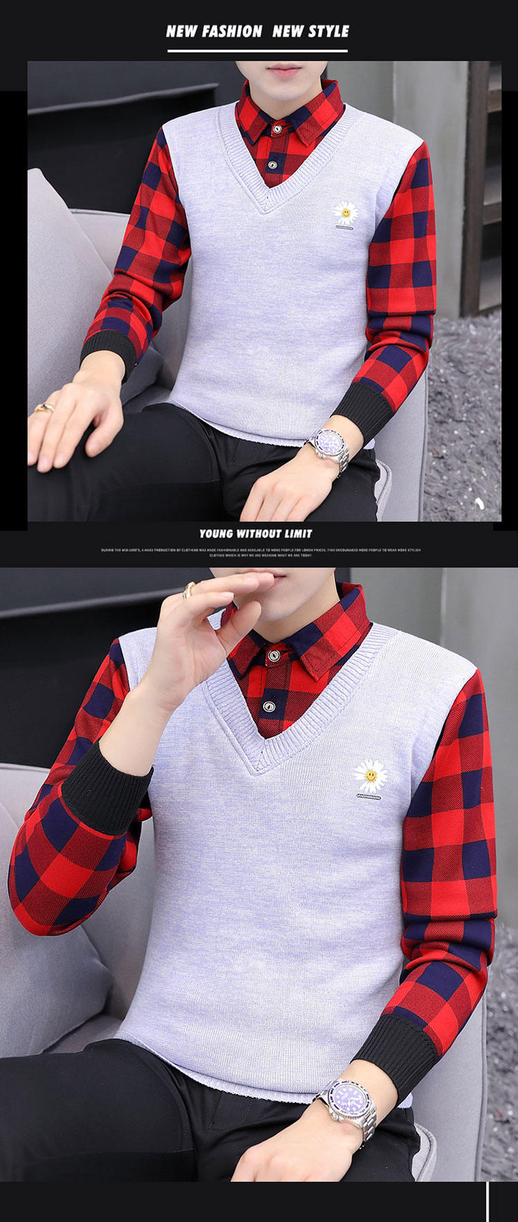 Поддельный свитер из двух частей на флисовой подкладке Мужская художественная рубашка 2023 Осенне-зимняя утолщенная вязаная рубашка для студентов-подростков на флисовой подкладке