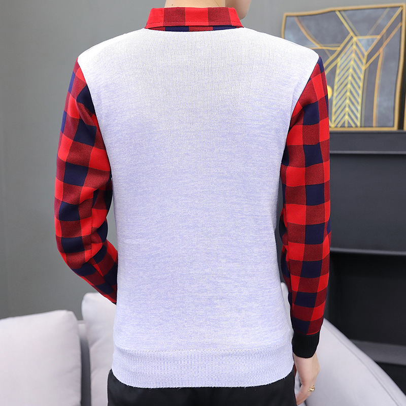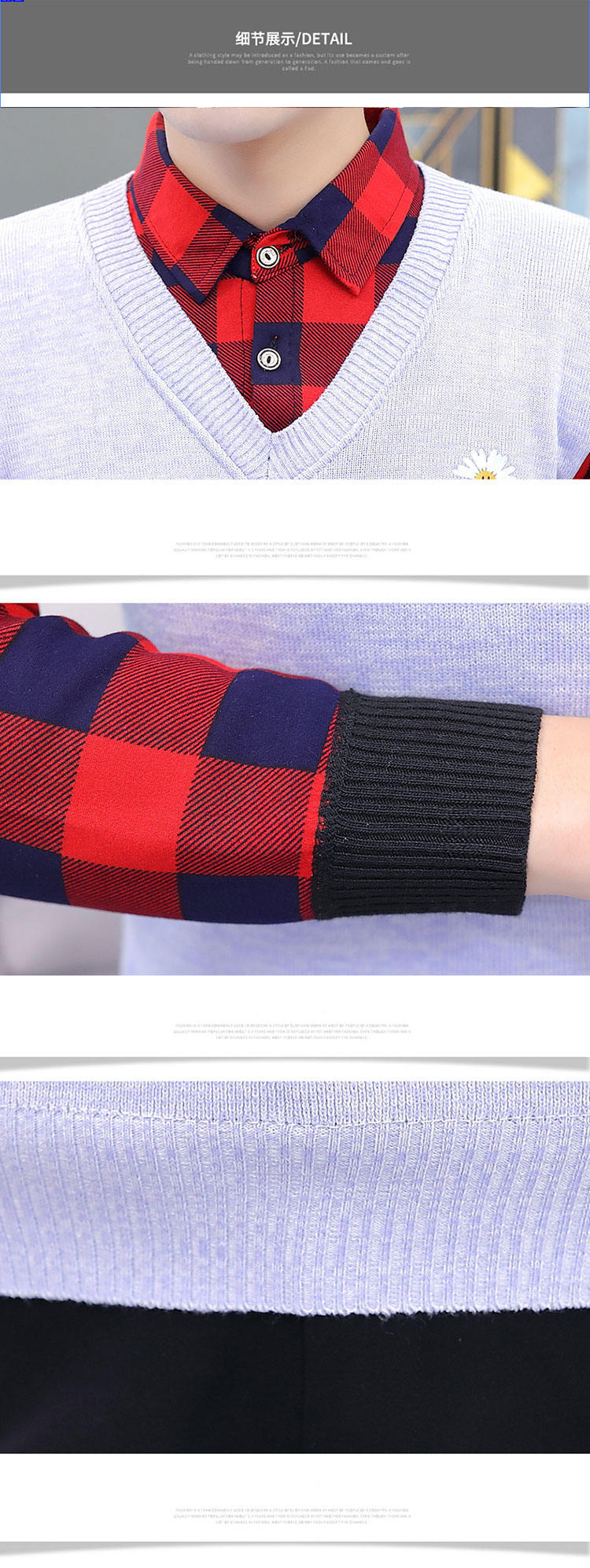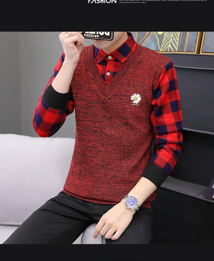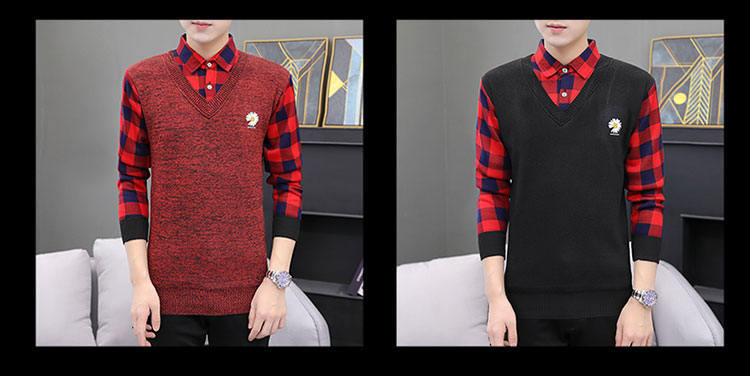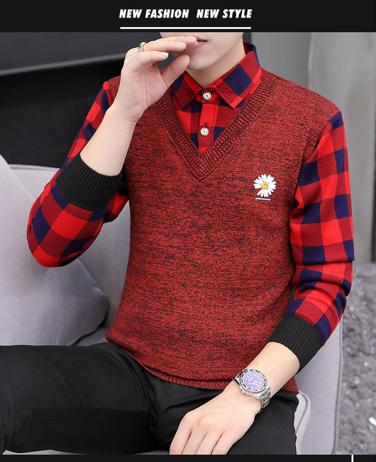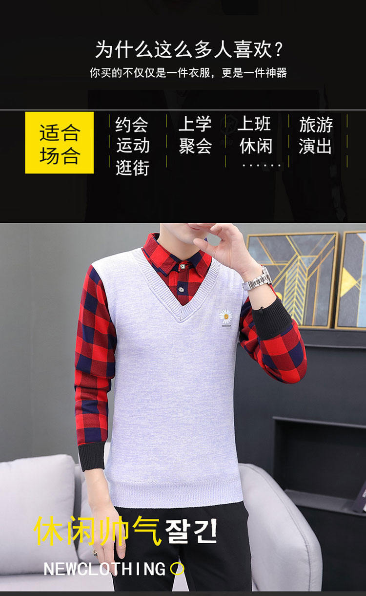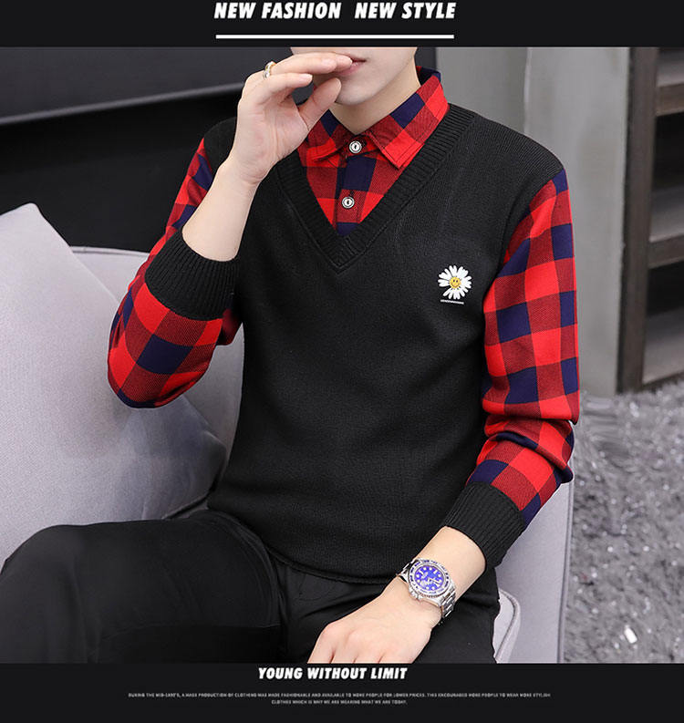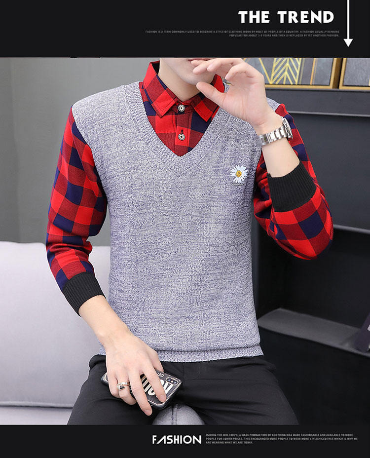 Поддельный свитер из двух частей на флисовой подкладке Мужская художественная рубашка 2023 Осенне-зимняя утолщенная вязаная рубашка для студентов-подростков на флисовой подкладке
