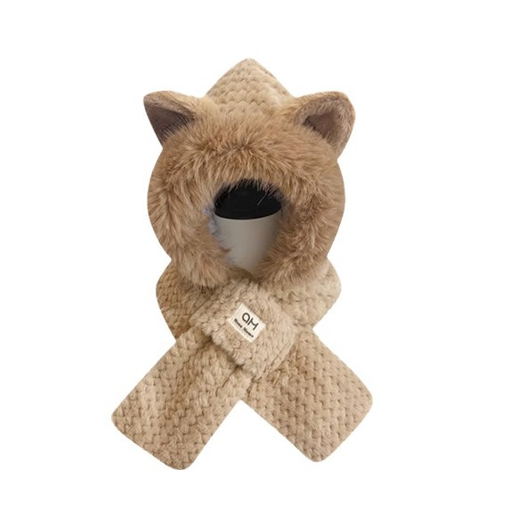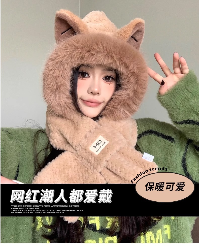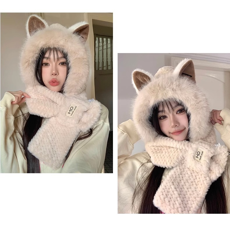 Шапка с лисьими ушками, шарф, универсальная шапка для женщин, зимняя милая плюшевая шерстяная шапка с животными, плюс шарф, комплект из двух предметов