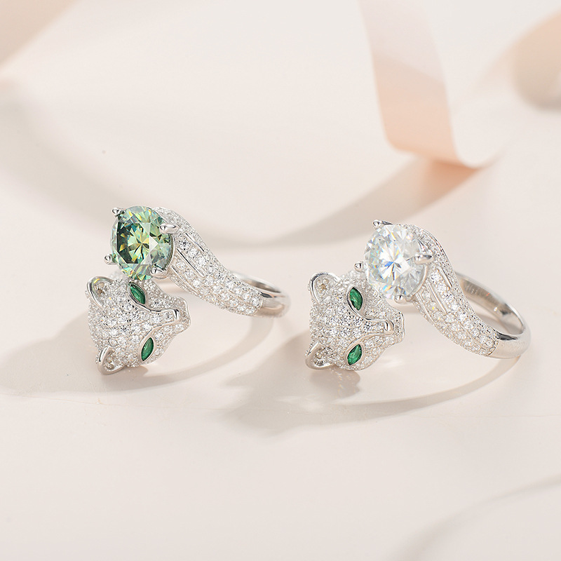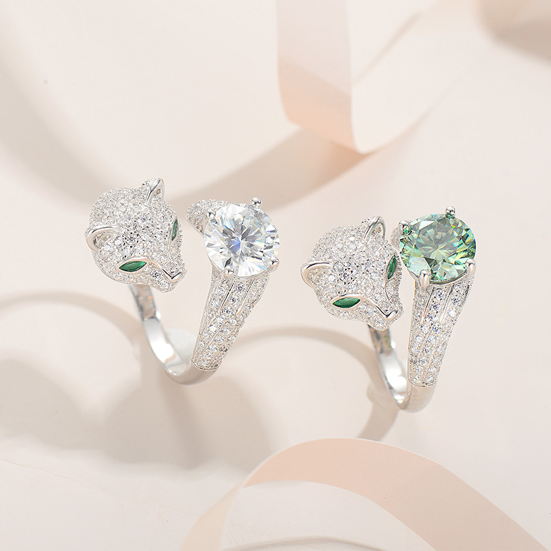 Стерлинговое серебро S925 Mosan Diamond 2-каратное кольцо с головкой леопарда Цветной бриллиант Расширенное открытие Регулируемый Размер Модный носимый
